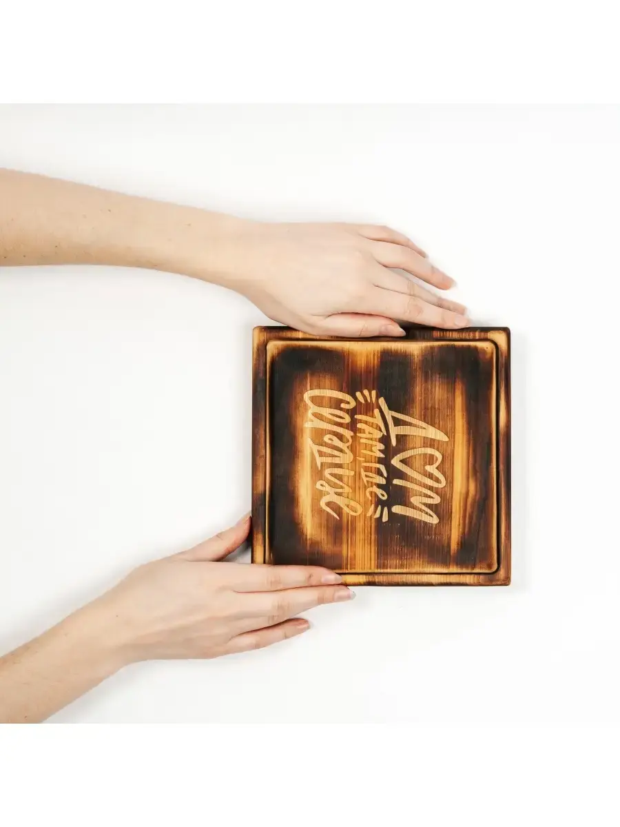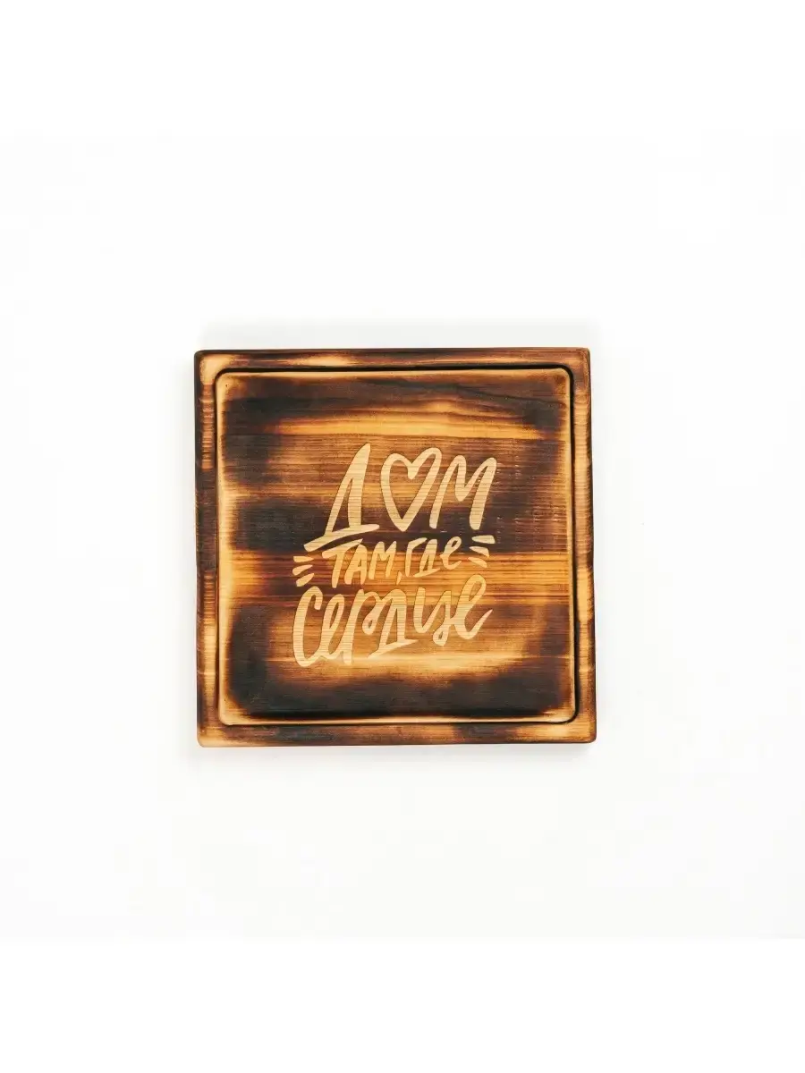 Деревянная менажница из кедра для подачи блюд и закусок "Дом там где сердце". Представлено в двух вариантах: обжиг и цвет "орех".. Любителям натуральности придется по душе наша деревянная менажница, имеющая такие плюсы, как красивый узор древесины, не бьется, натуральна, долговечна и подходит для различных блюд. А антибактериальные свойства кедра привлекают ценителей чистоты. Возможно наличие сучков. Пропитана нашим составом на основе растительного масла, кедровой смолы и пчелиного воска. Размер: 19х19х2,2 см.