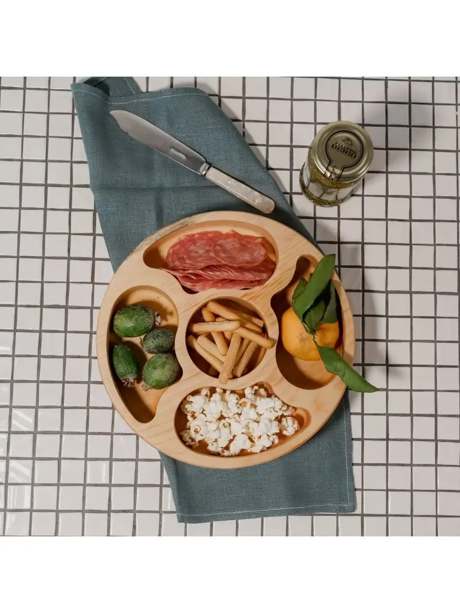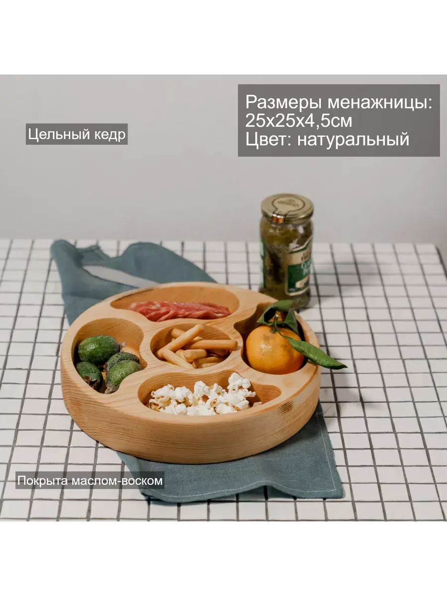 Менажница c 5 ячейками из Сибирского кедра ручной работы для кухни. Многие хозяйки мечтают, чтобы ее семейный обед или праздничный ужин был таким, как в престижном дорогом ресторане, поэтому озадачиваются сервировкой и красивой подачей блюд. В этом случае можно воспользоваться нашей новинкой - менажница для подачи блюд!Так что же такое менажница?Слово французского происхождения, от melanger – «смешивать», то есть в буквальном смысле менажница – это тарелка, на которой смешаны разные блюда.Наша экологичная посуда из дерева придется всем по душе. Деревянная менажница для сервировки обладает следующими преимуществами: красивый узор древесины, очень прочная, натуральная, долговечна и подходит для различных блюд. А антибактериальные свойства Сибирского кедра привлекают ценителей чистоты. Менажница из дерева станет отличным подарком на Новый год, день рождения и новоселье.Менажница подходит для горячих и холодных блюд, для закусок и для фруктов. Возможно наличие сучков. Идеальная шлифовка позволяет изделию быть очень гладким. Менажница пропитана натуральным маслом, которое, необходимо смыть в теплой проточной воде перед использованием. Размеры менажницы: Длина 250 мм, Ширина 250 мм, Высота 45 мм, Вес 545 грамм.