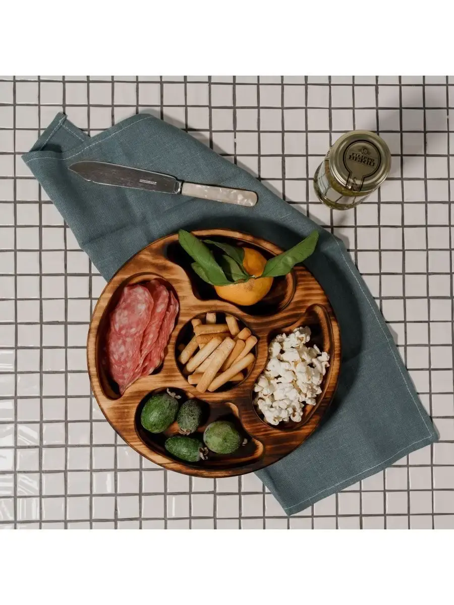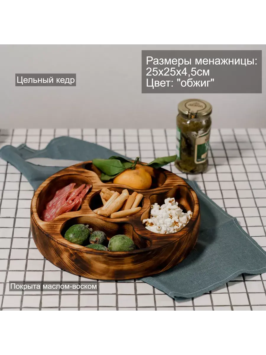 Менажница c 5 ячейками из Сибирского кедра ручной работы для кухни. Многие хозяйки мечтают, чтобы ее семейный обед или праздничный ужин был таким, как в престижном дорогом ресторане, поэтому озадачиваются сервировкой и красивой подачей блюд. В этом случае можно воспользоваться нашей новинкой - менажница для подачи блюд!Так что же такое менажница?Слово французского происхождения, от melanger – «смешивать», то есть в буквальном смысле менажница – это тарелка, на которой смешаны разные блюда.Наша экологичная посуда из дерева придется всем по душе. Деревянная менажница для сервировки обладает следующими преимуществами: красивый узор древесины, очень прочная, натуральная, долговечна и подходит для различных блюд. А антибактериальные свойства Сибирского кедра привлекают ценителей чистоты. Менажница из дерева станет отличным подарком на Новый год, день рождения и новоселье.Менажница подходит для горячих и холодных блюд, для закусок и для фруктов. Возможно наличие сучков. Идеальная шлифовка позволяет изделию быть очень гладким. Менажница пропитана натуральным маслом, которое, необходимо смыть в теплой проточной воде перед использованием. Размеры менажницы: Длина 250 мм, Ширина 250 мм, Высота 45 мм, Вес 545 грамм.