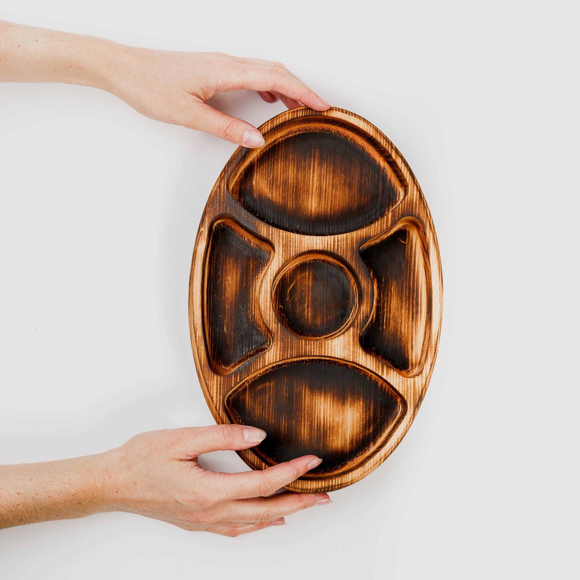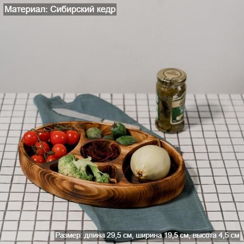 Наша экологичная посуда из дерева придется всем по душе. Деревянная менажница для сервировки обладает следующими преимуществами: красивый узор древесины, очень прочная, натуральная, долговечна и подходит для различных блюд. А антибактериальные свойства Сибирского кедра привлекают ценителей чистоты.