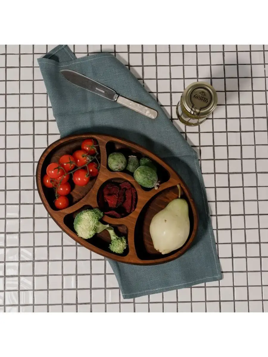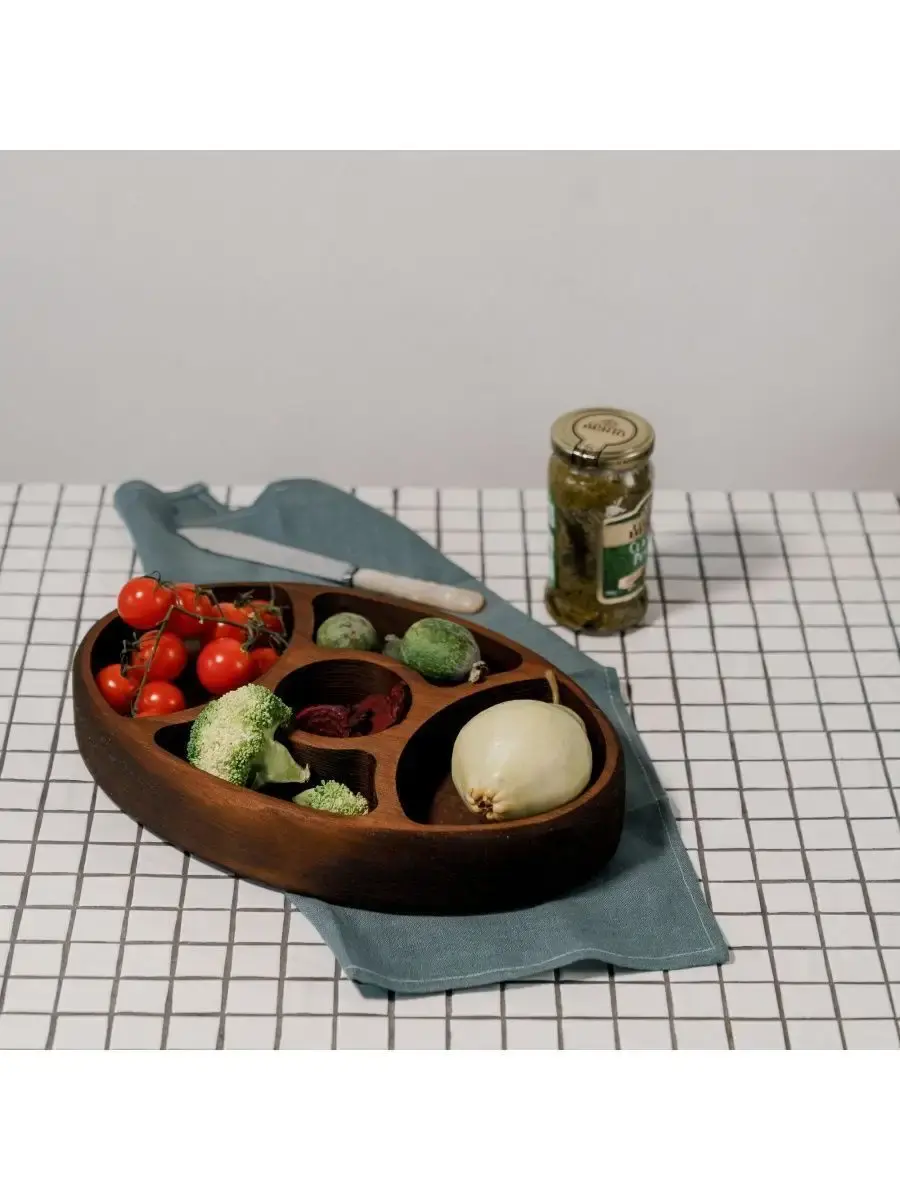 Менажница с 5 ячейками из Сибирского кедра ручной работы для кухни. Многие хозяйки мечтают, чтобы ее семейный обед или праздничный ужин был таким, как в престижном дорогом ресторане, поэтому озадачиваются сервировкой и красивой подачей блюд. В этом случае можно воспользоваться нашей новинкой - менажница для подачи блюд!Так что же такое менажница?Слово французского происхождения, от melanger – «смешивать», то есть в буквальном смысле менажница – это тарелка, на которой смешаны разные блюда.Наша экологичная посуда из дерева придется всем по душе. Деревянная менажница для сервировки обладает следующими преимуществами: красивый узор древесины, очень прочная, натуральная, долговечна и подходит для различных блюд. А антибактериальные свойства Сибирского кедра привлекают ценителей чистоты. Менажница из дерева станет отличным подарком на Новый год, день рождения и новоселье.Менажница подходит для горячих и холодных блюд, для закусок и для фруктов. Возможно наличие сучков. Идеальная шлифовка позволяет изделию быть очень гладким. Менажница пропитана натуральным маслом, которое, необходимо смыть в теплой проточной воде перед использованием. Размеры менажницы: Длина 195 мм, Ширина 295 мм, Высота 45 мм, Вес 460 грамм.
