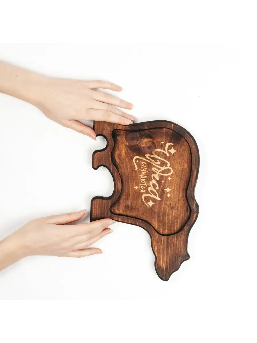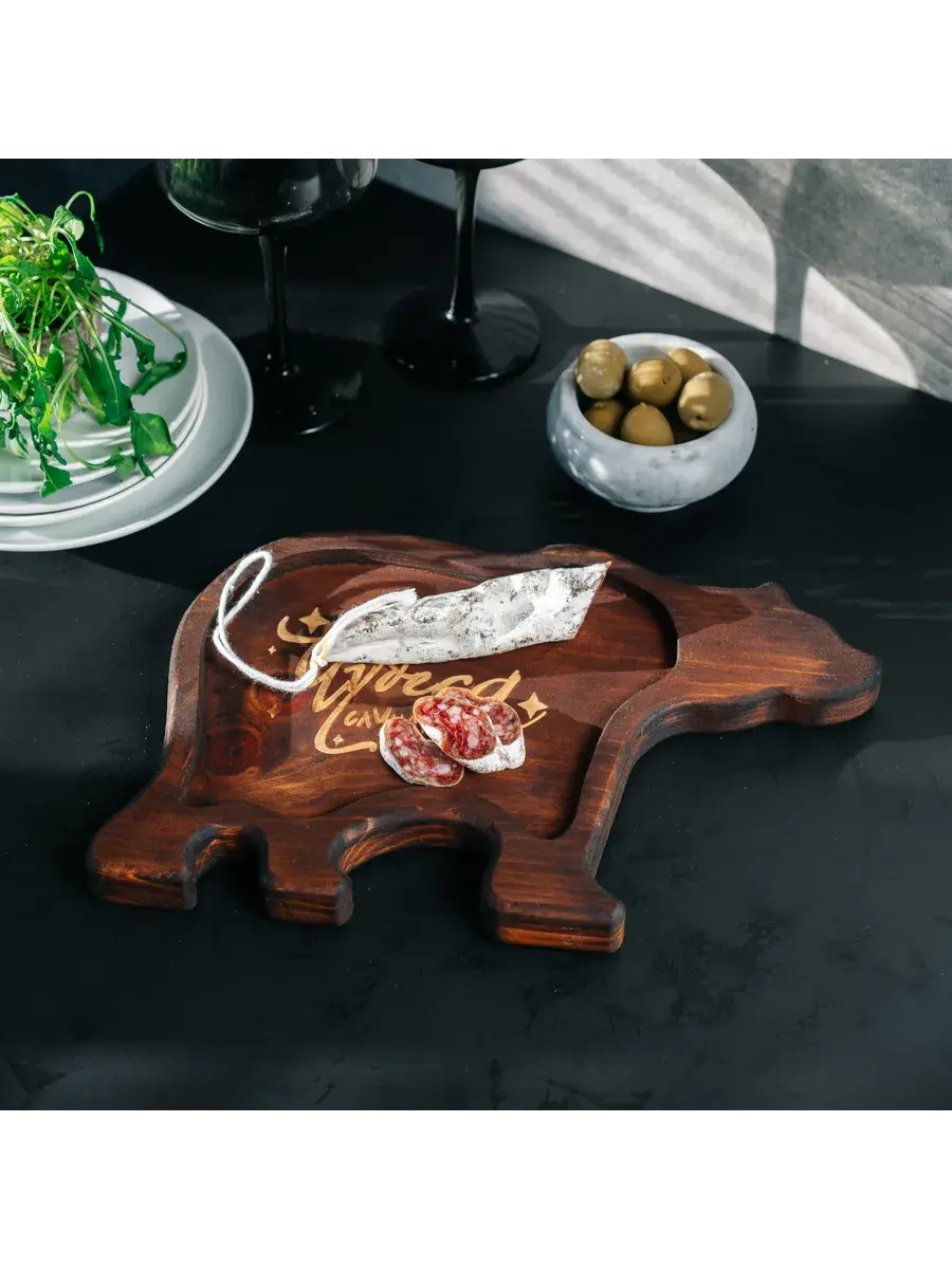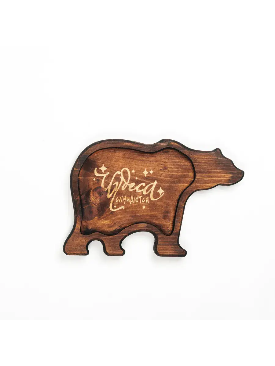 Деревянная менажница "Медведь" из кедра для подачи блюд и закусок с гравировкой "Чудеса случаются" . Любителям натуральности придется по душе наша деревянная менажница, имеющая такие плюсы, как красивый узор древесины, не бьется, натуральна, долговечна и подходит для различных блюд. А антибактериальные свойства кедра привлекают ценителей чистоты. Возможно наличие сучков. Пропитана нашим составом на основе растительного масла, кедровой смолы и пчелиного воска. Размер: 19х29х2,2 см. Цвет "орех".
