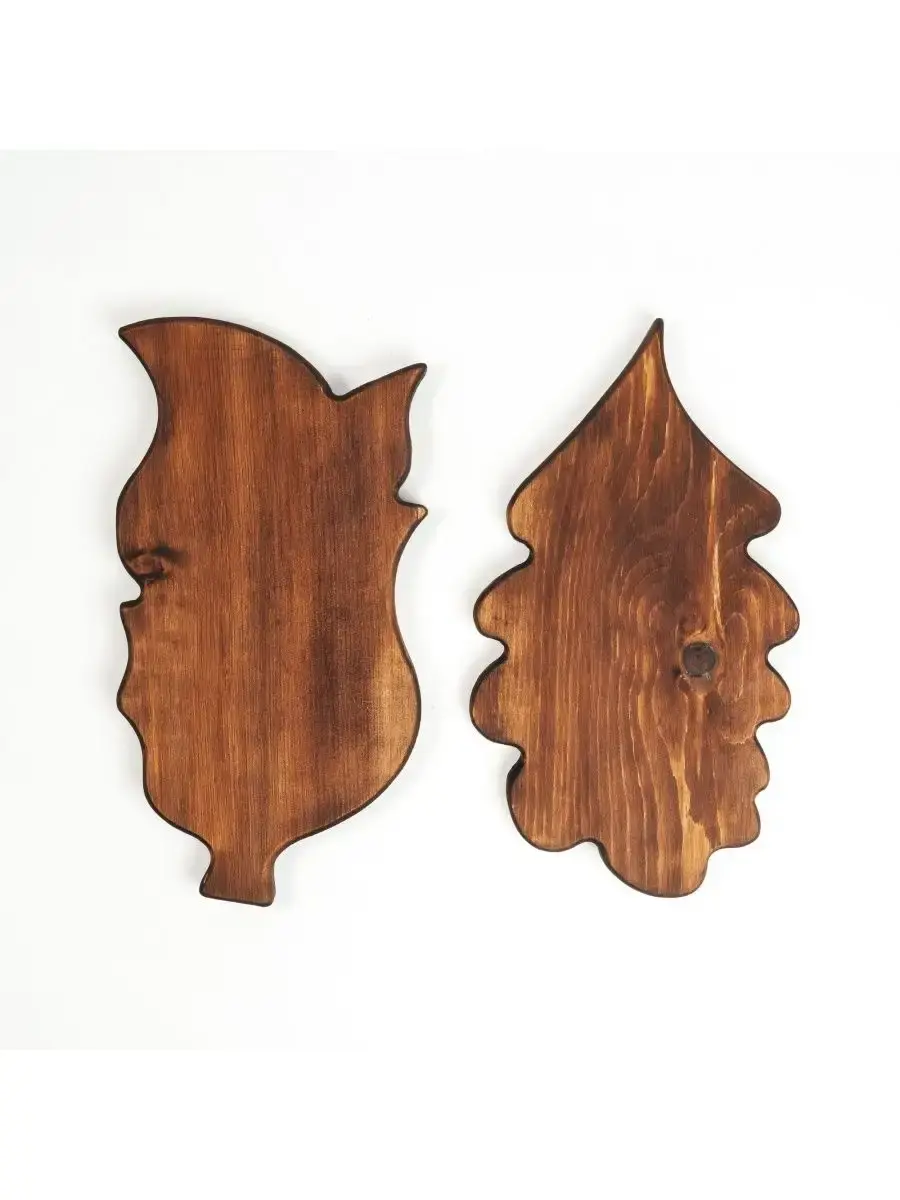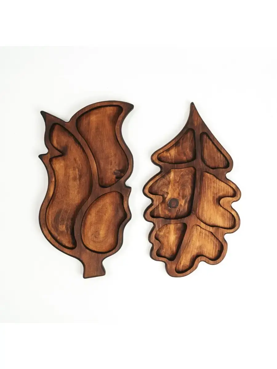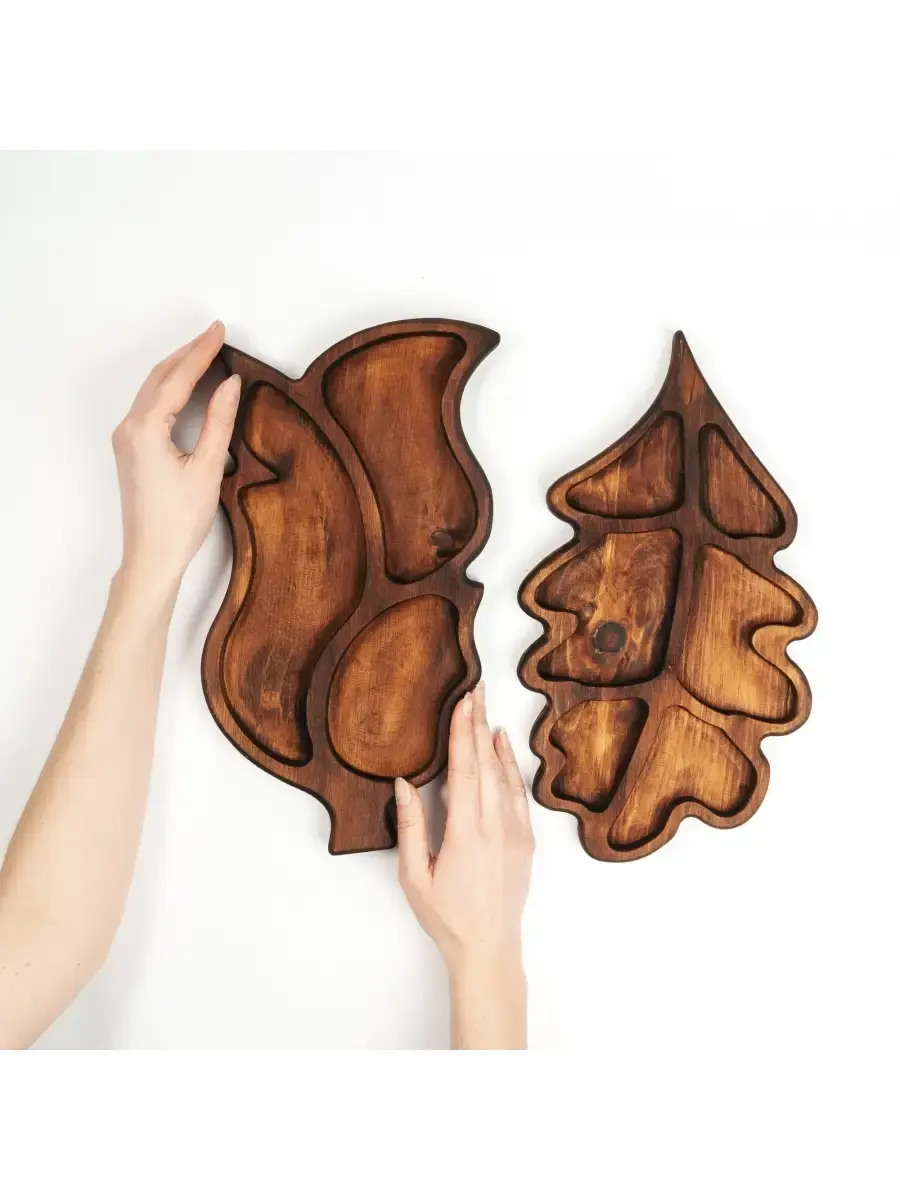 Набор деревянных менажниц из кедра для подачи блюд и закусок "листья". Любителям натуральности придется по душе наша деревянная менажница, имеющая такие плюсы, как красивый узор древесины, не бьется, натуральна, долговечна и подходит для различных блюд. А антибактериальные свойства кедра привлекают ценителей чистоты. Если застолье более серьезное, вас выручит она, наполненная салатами, свежими и маринованными овощами и грибами. Даже обычные домашние заготовки в такой емкости будут выглядеть как дорогое блюдо из ресторана. Кроме того, вы сможете сэкономить место на столе. Возможно наличие сучков. Пропитана нашим составом на основе растительного масла, кедровой смолы и пчелиного воска. Размер: 35х20х2,2 см.