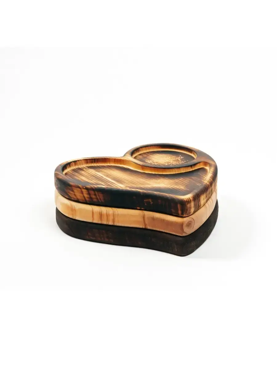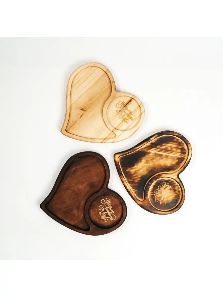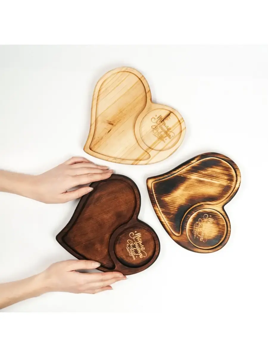 Набор деревянных менажниц "Сердце" из кедра 220х200мм 3 шт. с гравировкой "Тепло внутри - сказочно снаружи". Любителям натуральности придется по душе наши деревянные менажницы, имеющие такие плюсы, как красивый узор древесины, не бьются, натуральны, долговечны и подходит для различных блюд. А антибактериальные свойства кедра привлекают ценителей чистоты. Если к вам пришла компания веселых друзей, менаница с чипсами, орехами, сухофруктами будет очень кстати. Ее можно поставить даже на маленький перекатной столик, чтобы совместить перекус с просмотром телевизора. Возможно наличие сучков. Пропитаны нашим составом на основе растительного масла, кедровой смолы и пчелиного воска. Размер: 220х200 мм, высота 25 мм. 3шт.