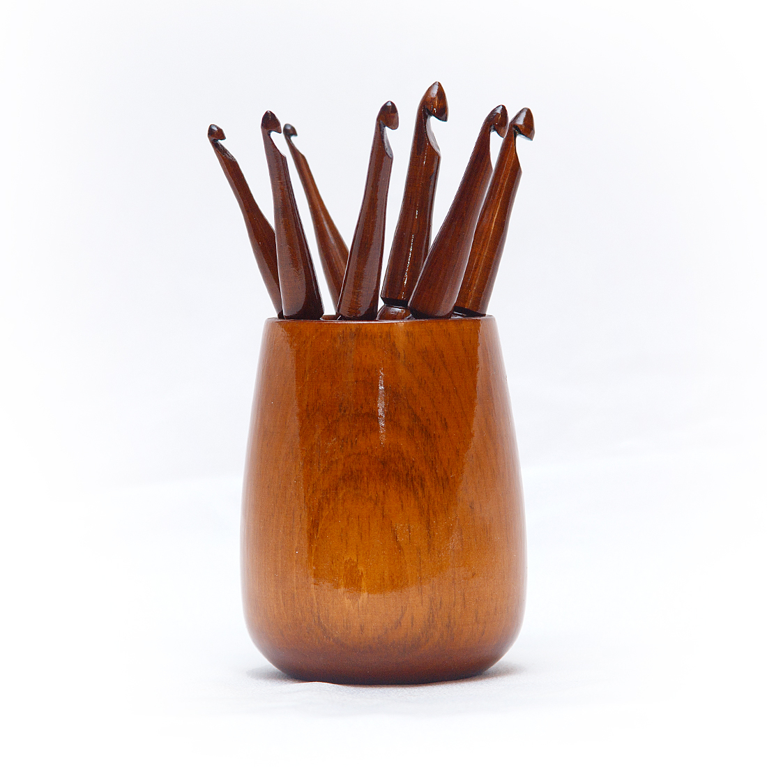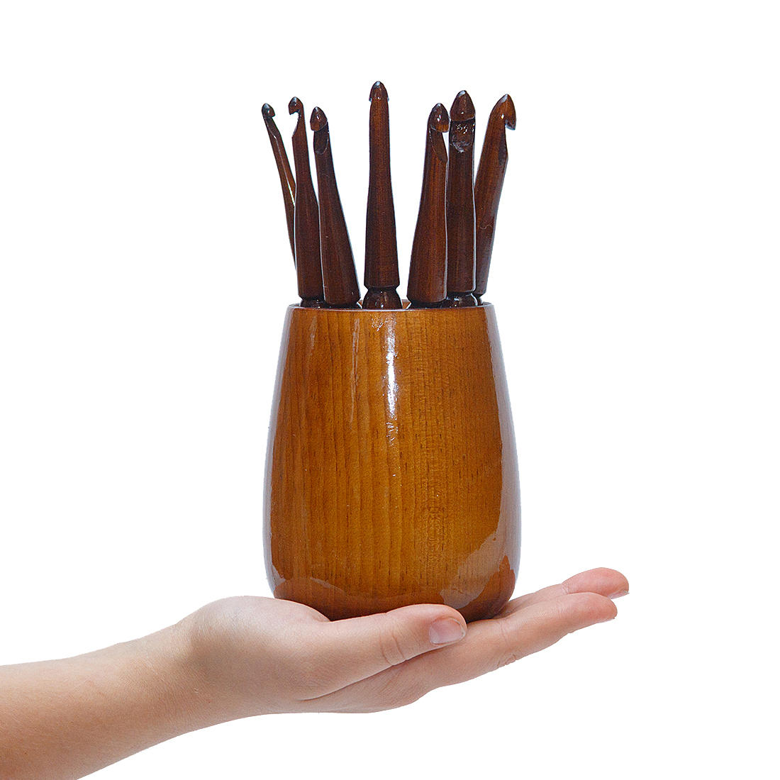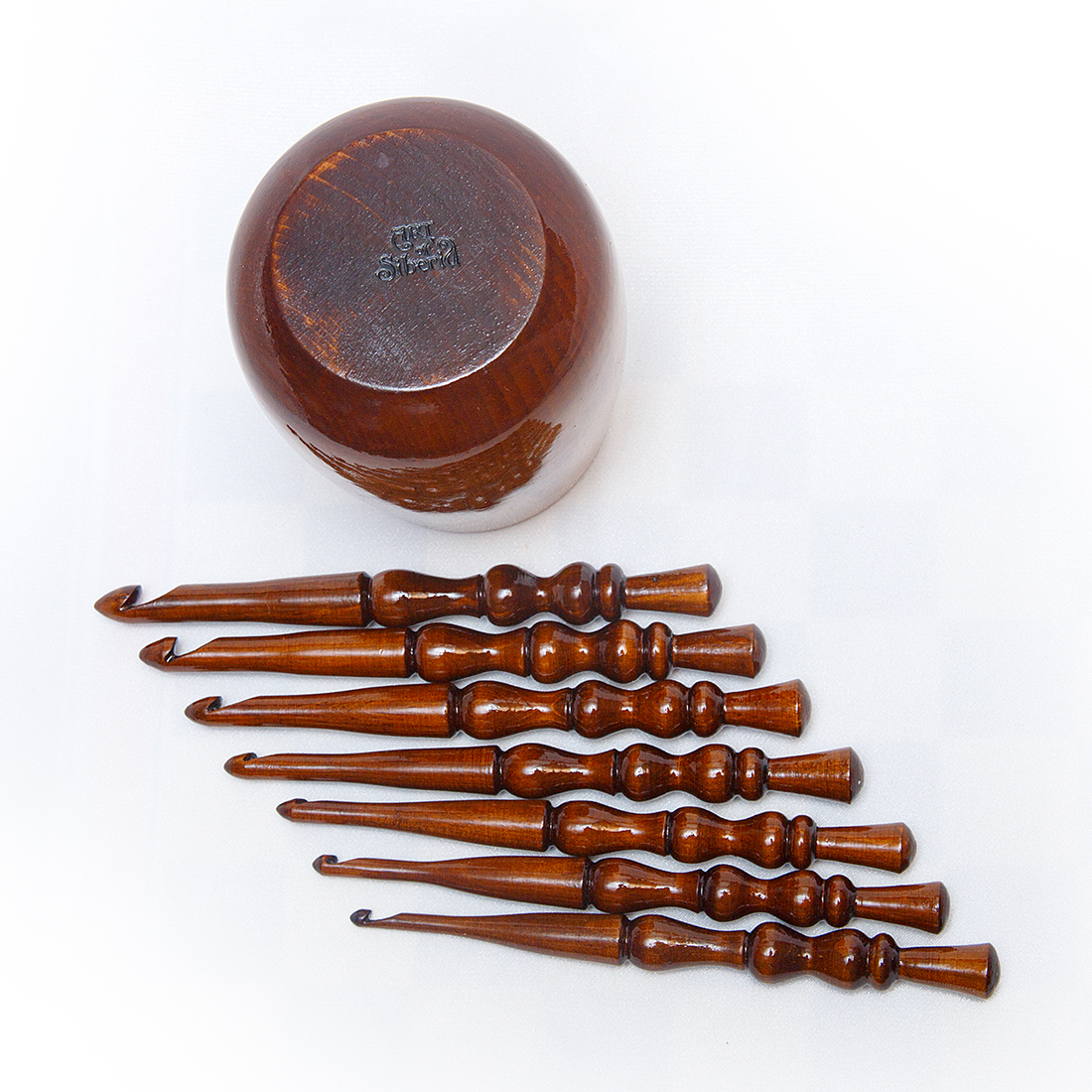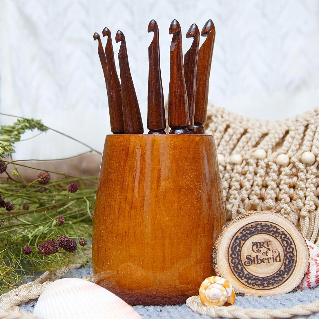 Набор крючков и ваза для хранения из Сибирского Кедра! Легкие, приятные на ощупь, эргономичные, тщательно отполированы и покрыты лаком! Крючок – древний инструмент женского рукоделия. Маленький русский крючок также может стать хорошим подарком для рукодельницы, для дочери, как по прямому назначению, так и в виде сувенира или украшения в интерьере, а так же как деталь костюма для кукол в русском наряде.