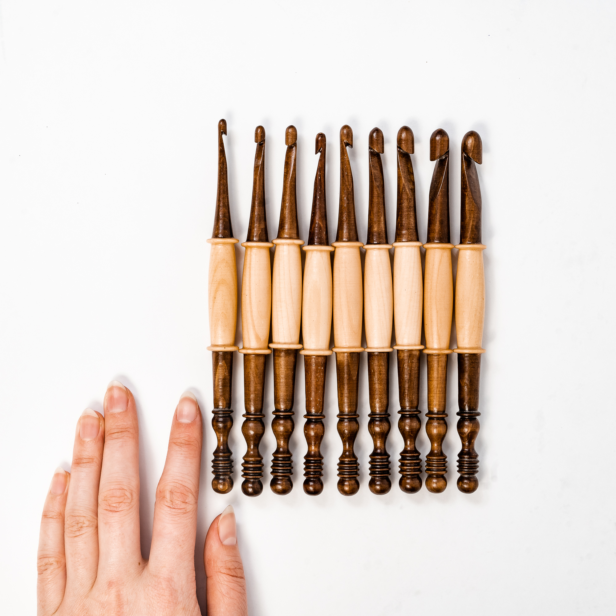 В наборе 9 крючков (размеры 4, 4.5, 5, 5.5, 6, 7, 8, 9, 10) Очень важно выбрать крючок для вязания, от этого зависит качество изделия. Неправильно подобранный крючок может испортить вещь уже в начале работы. Очень хороши для вязания деревянные крючки. Легкие, приятные на ощупь, эргономичные, их удобно держать в руке. Крючок – древний инструмент женского рукоделия. Широкий размерный ряд поможет создавать различные изделия из любой пряжи! Станут вам незаменимым помощником. Ведь Вязание крючком – увлекательное занятие, которое помогает отвлечься и расслабиться после тяжёлого трудового дня!