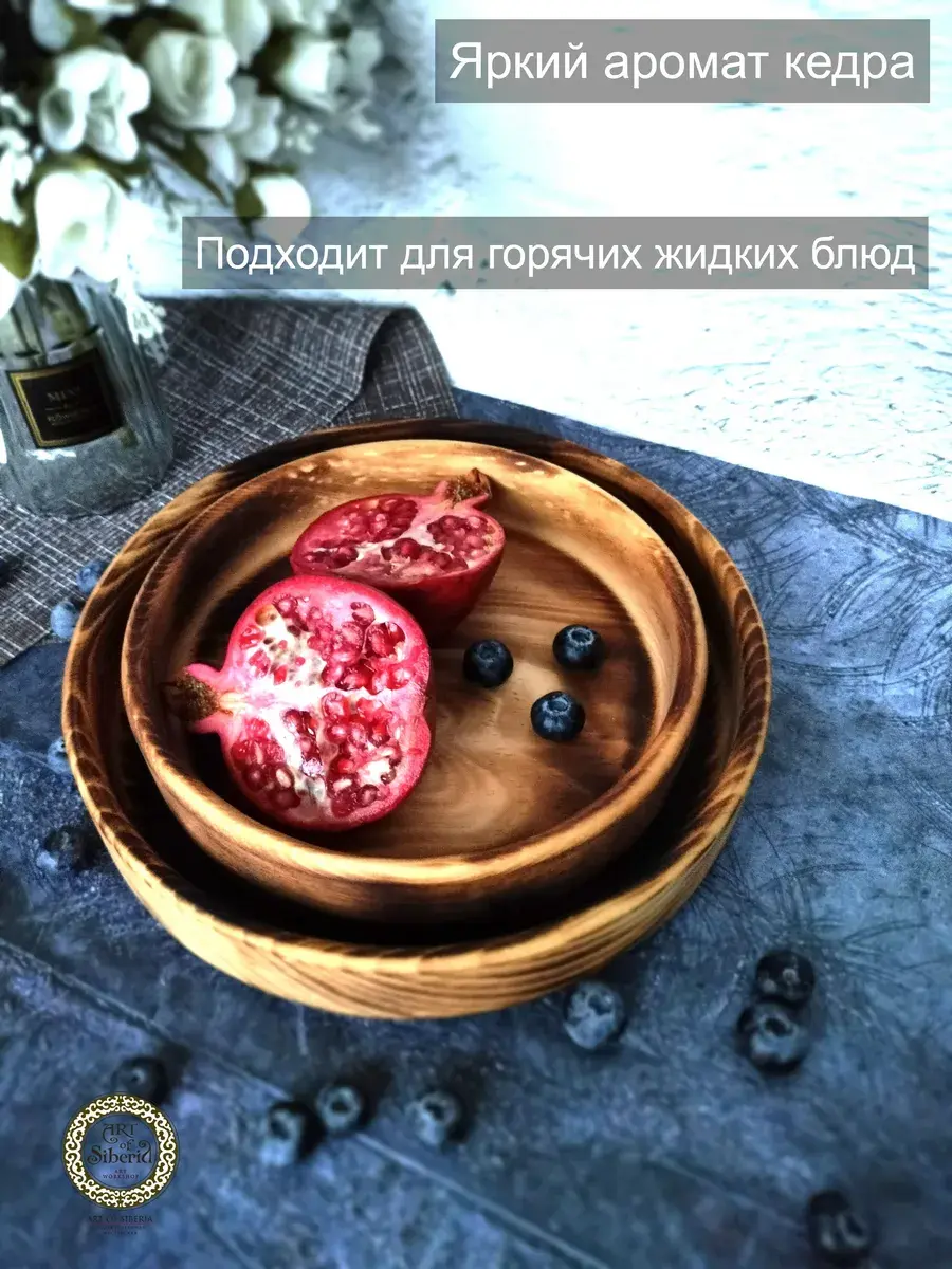 Набор тарелок из цельного массива кедра. Наша посуда из кедра имеет красивую текстуру, приятный оттенок, выделяет тонкий аромат, дезинфицирующий воздух помещений. Она обладает бактерицидными, антимикробными свойствами, аромат кедра способен оздоравливать воздух, придавать ему целебные качества. Велико санитарно-гигиеническое и лечебно-профилактическое действие кедровой посуды. Покрыта составом из пчелиного воска, кедровой смолы и растительного масла. Пригодна для пищевых продуктов, как для холодной, так и для горячей пищи. Абсолютно экологичный продукт. Перед использованием обязательно промыть теплой проточной водой, чтоб смыть остатки покрытия. Изделие может стать чуть светлее. Для протирания использовать бумажные или тканевые полотенца. Размеры: 1). диаметр 25 см., высота 4,5 см., вес 310 г., глубина 3 см., 900 мл..