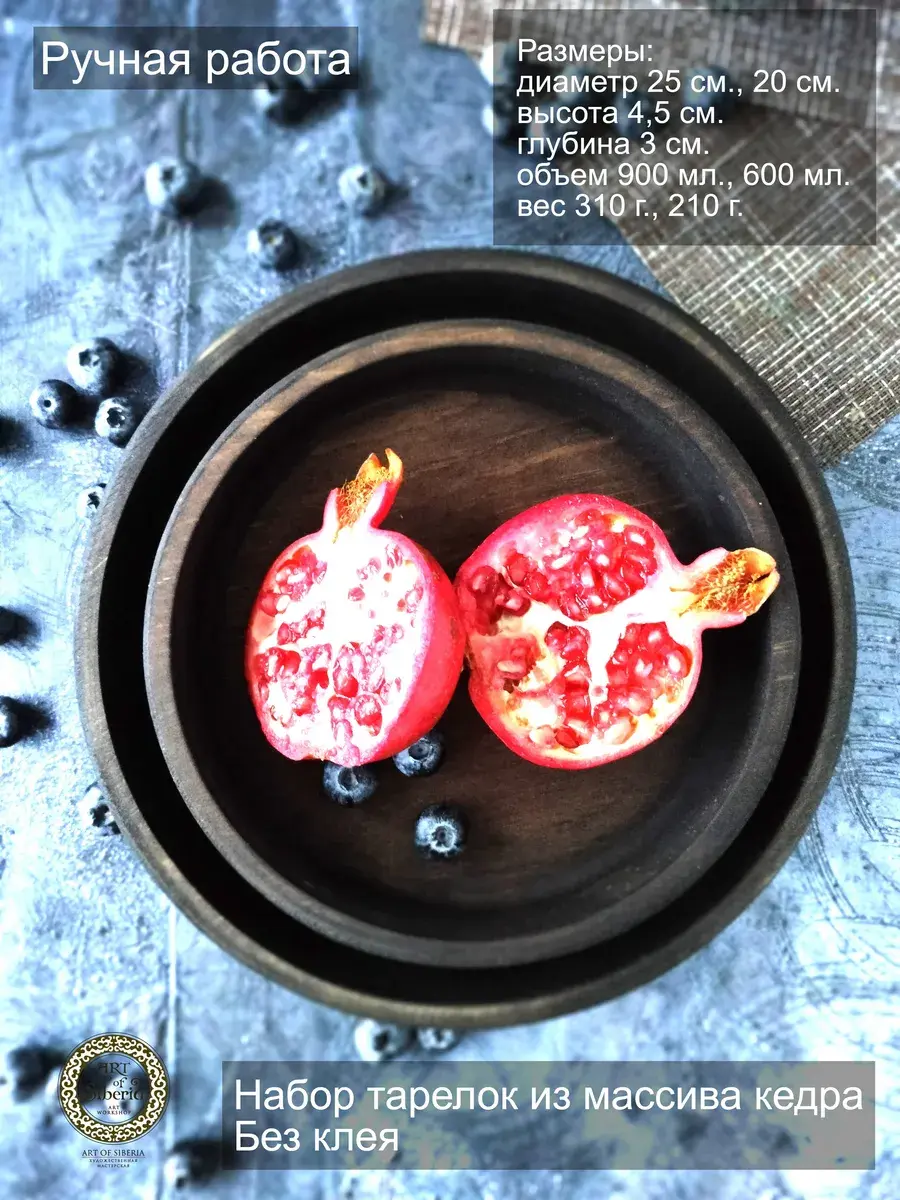Набор тарелок из цельного массива кедра. Наша посуда из кедра имеет красивую текстуру, приятный оттенок, выделяет тонкий аромат, дезинфицирующий воздух помещений. Она обладает бактерицидными, антимикробными свойствами, аромат кедра способен оздоравливать воздух, придавать ему целебные качества. Велико санитарно-гигиеническое и лечебно-профилактическое действие кедровой посуды. Покрыта составом из пчелиного воска, кедровой смолы и растительного масла. Пригодна для пищевых продуктов, как для холодной, так и для горячей пищи. Абсолютно экологичный продукт. Перед использованием обязательно промыть теплой проточной водой, чтоб смыть остатки покрытия. Изделие может стать чуть светлее. Для протирания использовать бумажные или тканевые полотенца. Размеры: 1). диаметр 25 см., высота 4,5 см., вес 310 г., глубина 3 см., 900 мл..