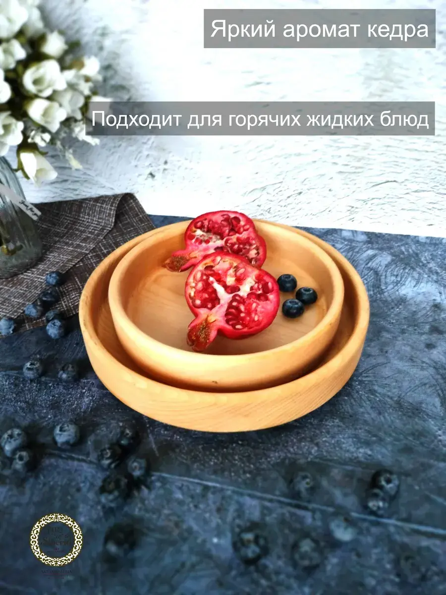 Набор тарелок из цельного массива кедра. Наша посуда из кедра имеет красивую текстуру, приятный оттенок, выделяет тонкий аромат, дезинфицирующий воздух помещений. Она обладает бактерицидными, антимикробными свойствами, аромат кедра способен оздоравливать воздух, придавать ему целебные качества. Велико санитарно-гигиеническое и лечебно-профилактическое действие кедровой посуды. Покрыта составом из пчелиного воска, кедровой смолы и растительного масла. Пригодна для пищевых продуктов, как для холодной, так и для горячей пищи. Абсолютно экологичный продукт. Перед использованием обязательно промыть теплой проточной водой, чтоб смыть остатки покрытия. Изделие может стать чуть светлее. Для протирания использовать бумажные или тканевые полотенца. Размеры: 1). диаметр 25 см., высота 4,5 см., вес 310 г., глубина 3 см., 900 мл..