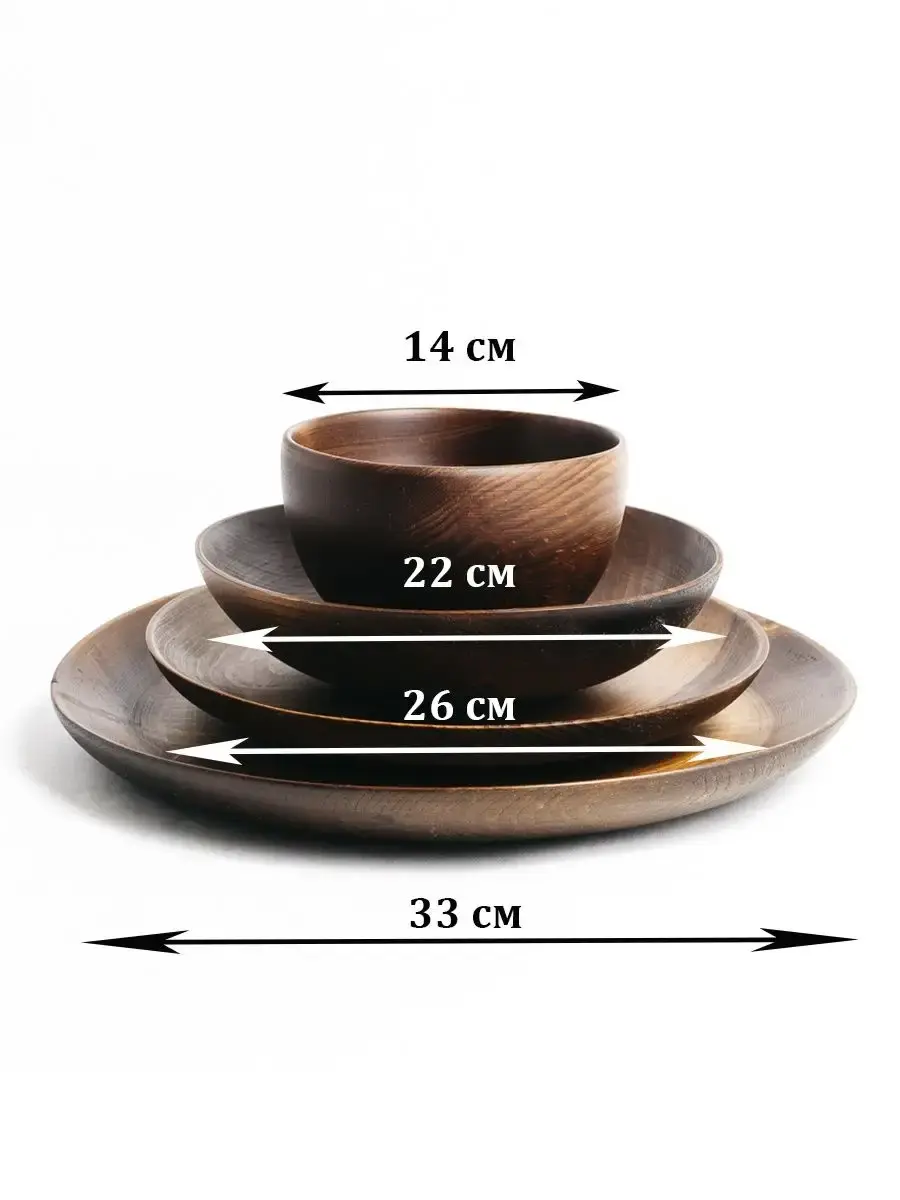 Набор деревянных тарелок + большое сервировочное блюдо ручной работы из цельного массива Сибирского Кедра! Пропитан нашим составом на основе растительного масла, кедровой смолы и пчелиного воска. Посуда пригодна для всех видов пищевых продуктов, как для холодных так и для горячих. Размеры: Сервировочное блюдо диаметр 33 см, высота 2,5 см. Блюдо для фруктов диаметр 26 см, высота 2,8 см. Глубокая тарелка диаметр 22 см, высота 4,5 см. Супница диаметр 14 см, высота 7,5 см.