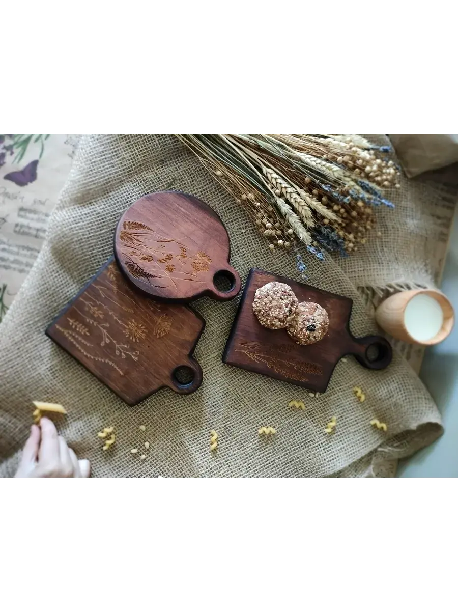 Набор деревянных разделочных досок из спила древесины сибирского кедра. Есть предметы, без которых не обойтись в домашнем хозяйстве. Разделочная доска – одна из них. Доски обработаны натуральным маслом с пчелиным воском, которое защищает дерево от внешних воздействий. Экологичные разделочные доски можно использовать для: сырого мяса, рыбы, хлеба, овощей и фруктов. Доски обладают массой положительных качеств: ножи не тупятся, доски из кедра долговечные, прочные, устойчивы к повреждениям и перепадам температуры. Подходят для разделывания больших кусков мяса, а самое главное, кедр обладает антибактериальными свойствами, и бактерии, попадая в волокна доски, не размножаются, а погибают. Доски имеют специальное отверстие, которое, пригодится для того, чтобы повесить доску на стену. Доски можно использовать в роли менажниц для подачи и сервировки блюд, они отлично впишутся в любой интерьер и будут дополнять его своей уникальностью и стилем. Станут отличным подарком для повара, любителя готовить, близкого человека или просто качественным универсальным подарком. Дорогие покупатели, просим Вас обратить внимание! Каждая деревянная доска из спила имеет уникальную форму, которая может незначительно отличаться от фотографии. Возможно наличие сучков. Не замачивать. Не использовать в посудомоечной машине. После использования тщательно просушивать бумажными полотенцами.