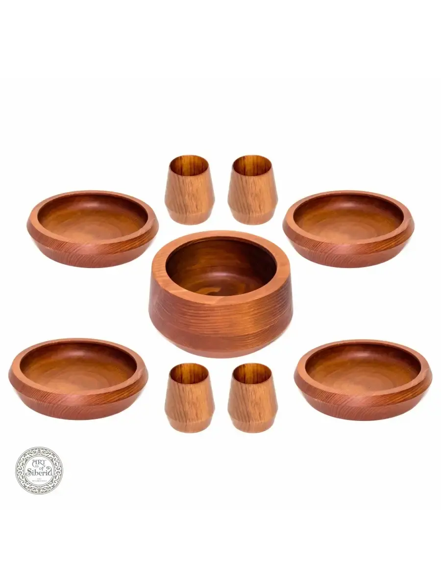 Набор деревянной посуды из натурального дерева сибирская сосна, 9 шт. Покрыта для придания цвета водной морилкой "орех". Пропитана нашим составом на основе растительного масла, кедровой смолы и пчелиного воска. Перед использованием обязательно промыть теплой проточной водой, чтоб смыть остатки масла и морилки. Изделие может стать чуть светлее. Первое время возможно оставление следов от морилки, поэтому лучше для протирания использовать бумажные полотенца. Для горячего и для жидкого. Абсолютно экологичный продукт. Размер: Салатница: диаметр 175 мм, высота 90 мм. - 1шт. Тарелка диаметр 210 мм, высота 50 мм. - 4 шт. Стакан высота 80 мм., диаметр 70 мм. - 4 шт.