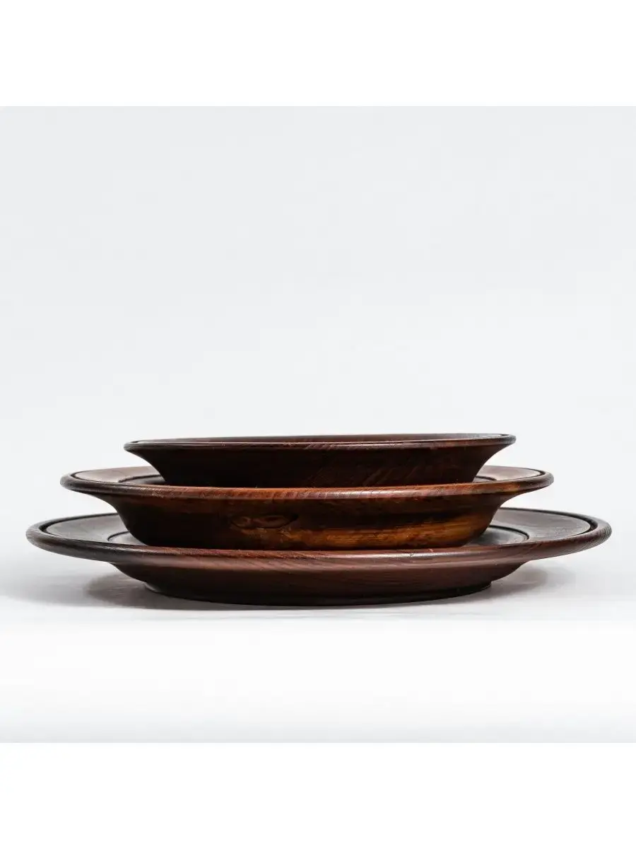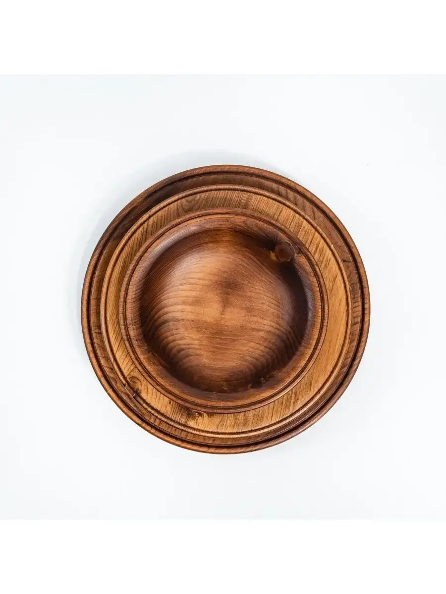 **Набор тарелок из натурального дерева сибирский кедр серии "Аристократ".** Наша посуда из кедра имеет красивую текстуру, приятный оттенок, выделяет тонкий аромат, дезинфицирующий воздух помещений. Она обладает бактерицидными, антимикробными свойствами, аромат кедра способен оздоравливать воздух, придавать ему целебные качества. Велико санитарно-гигиеническое и лечебно-профилактическое действие кедровой посуды.По мнению исследователей, небольшого количества летучих органических веществ (фитонцидов) кедра достаточно, чтобы обезвредить все болезнетворные микробы. Покрыта составом из пчелиного воска, кедровой смолы и растительного масла. Пригодна для пищевых продуктов, как для холодной, так и для горячей пищи.Перед использованием обязательно промыть теплой проточной водой, чтоб смыть остатки масла и морилки. Изделие может стать чуть светлее. Первое время возможно оставление следов от морилки, поэтому лучше для протирания использовать бумажные полотенца. **Размер: большая плоская тарелка** диаметр 27,5 см., высота 3 см.; средняя тарелка диаметр 23,5 см., высота 4 см.; глубокая тарелка диаметр 19 см., высота 4,5 см.