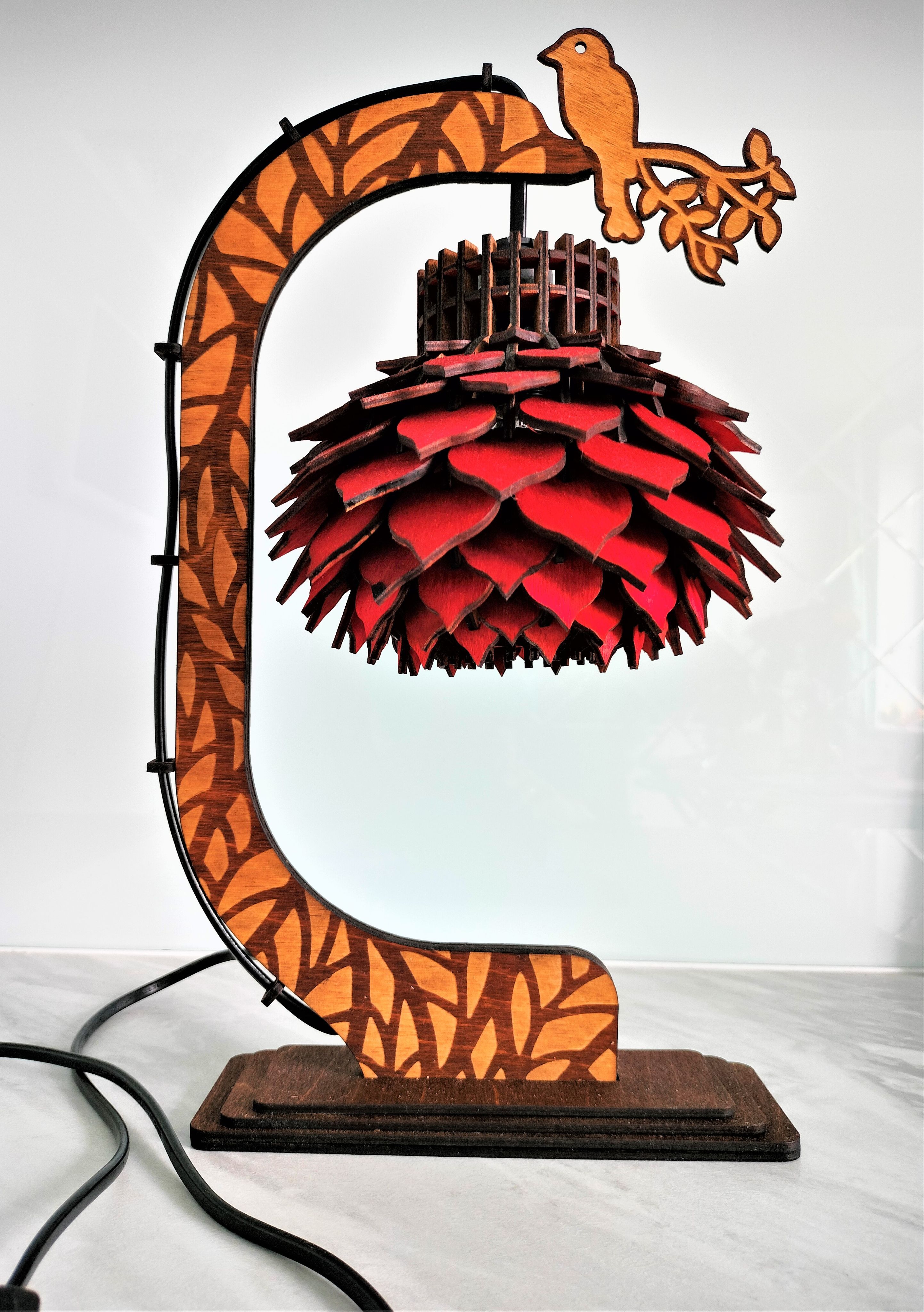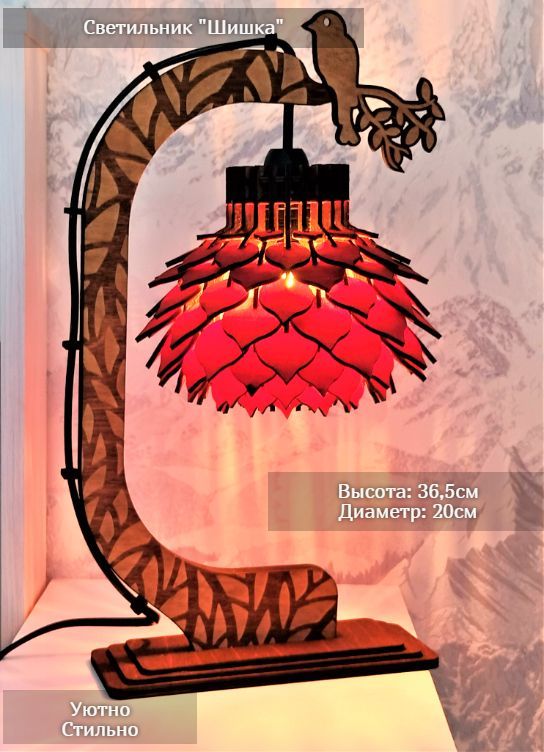 Настольный светильник, изготовленный из экологичных материалов, создает уют в доме благодаря декоративному освещению. Стильный внешний вид светильника из дерева впишется в модный интерьер квартир, домов, кафе и ресторанов. Лучи света от лампы проходят сквозь изгибы деталей деревянной люстры, создавая невероятно эффектную игру теней на стенах. Дизайнерский эко светильник - отличный подарок любимым родственникам и друзьям, коллегам по работе на новоселье и другие праздники, в детскую комнату. Лампочка входит в комплект. Шнур с переключателем. Размер светильника: Высота: 36,5 см, Диаметр: 20 см, Глубина: 15 см. Цвет провода - чёрный. Подключается в сеть 220В.