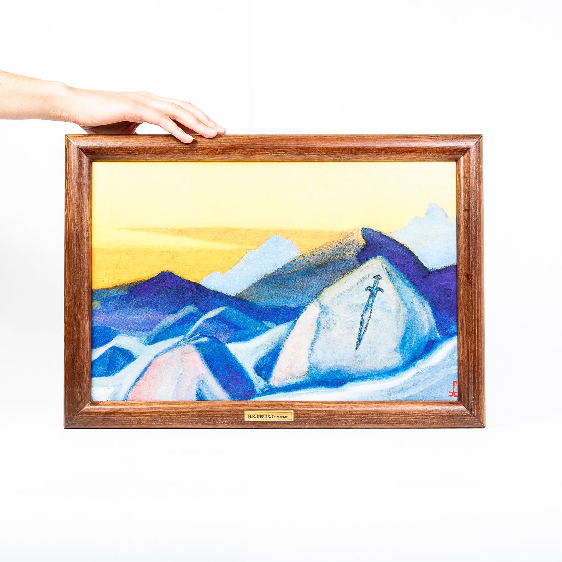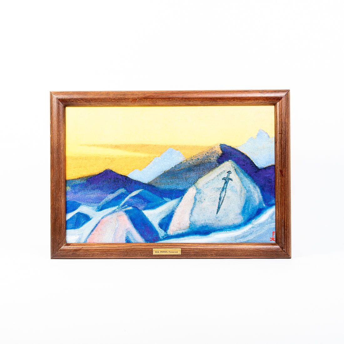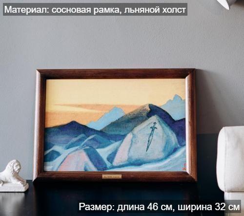 Репродукция картины в раме «Меч Гессар Хана» Николая Константиновича Рериха. Репродукция печатается на льне, при печати используются экологически чистые пигментные чернила, рекомендованные для использования в жилых помещениях. Холст вставляется в рамку, изготовленную из натурального дерева сибирская сосна. «Древнее урочище Карга. Остатки старинного укрепления... Главное внимание привлекают многочисленные рисунки на скалах... Лама Мингиюр с гордостью зовёт к камню, на котором изображение меча. Вот почему задумывалась картина «Меч Гесэр-Хана». Где же мы видели эти характерные формы меча-кинжала? Видели их в Минусинске, видели на Кавказе, видели во многих сарматских и кельтских древностях. Всё к тем же соображениям, к переселению народов ведёт этот меч, так отчётливо запечатлённый на древней, веками заполированной, коричнево-пурпурной поверхности камня. Знак ли битвы, знак ли мужественного прохождения? Или забытая граница? Победа? Тут же и легенда о воинах Гесэр-Хана, пришедших издалека и осевших здесь» Н.К.Рерих