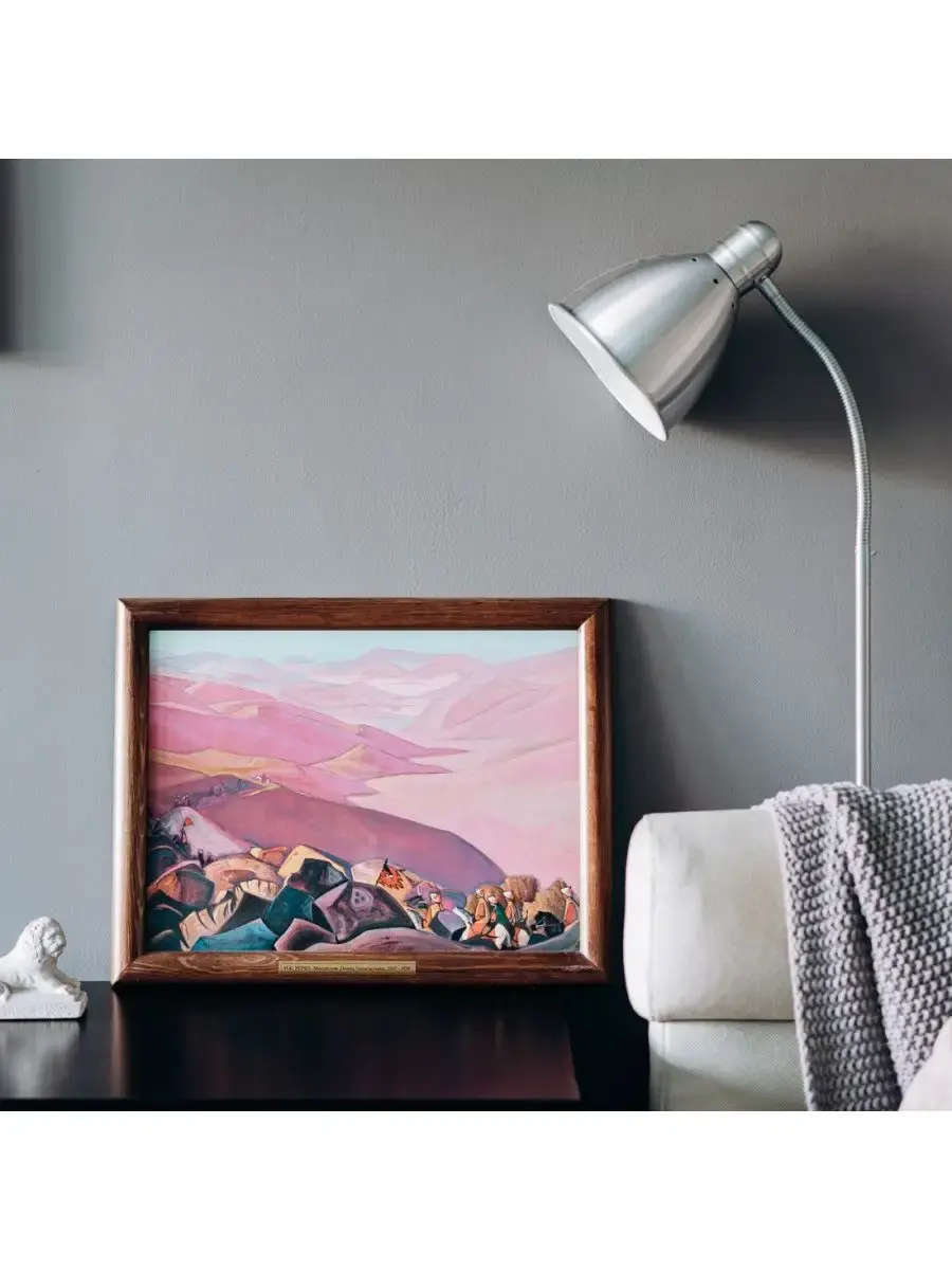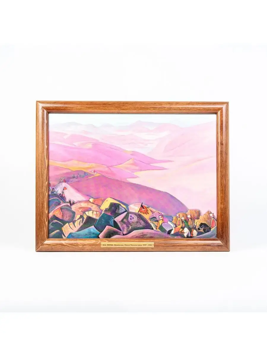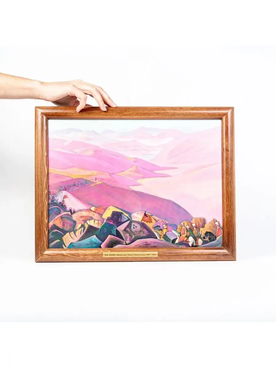 Репродукция картины в раме «Монголия. Поход Чингис-хана. 1937-1938» Николая Константиновича Рерих. Репродукция печатается на льне, при печати используются экологически чистые пигментные чернила, рекомендованные для использования в жилых помещениях. Холст вставляется в рамку, изготовленную из натурального дерева сибирская сосна. "Знамя Чингисхана было белое; при этом в разных походах употреблялись символы многих изображений: лев, конь счастья, кречет, барс. В основе монгольский цвет синий, но и посейчас живут заветы великого Чингисхана. Также упоминаются и законы его, среди которых многие могут жить и посейчас. Перечень суровых наказаний за кражу, убийства, прелюбодеяния и другие недостойные действия не упадут со страниц законодательства и в настоящее время. Также и прочие государственные деяния, требования к чиновным лицам и работы о преуспеянии страны были широко установлены великим ханом... По всему дошедшему до нас, Чингисхан действительно был великим вождем и строителем".Н.К. Рерих