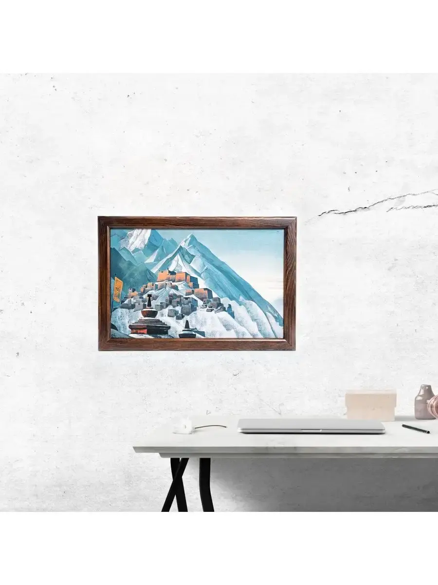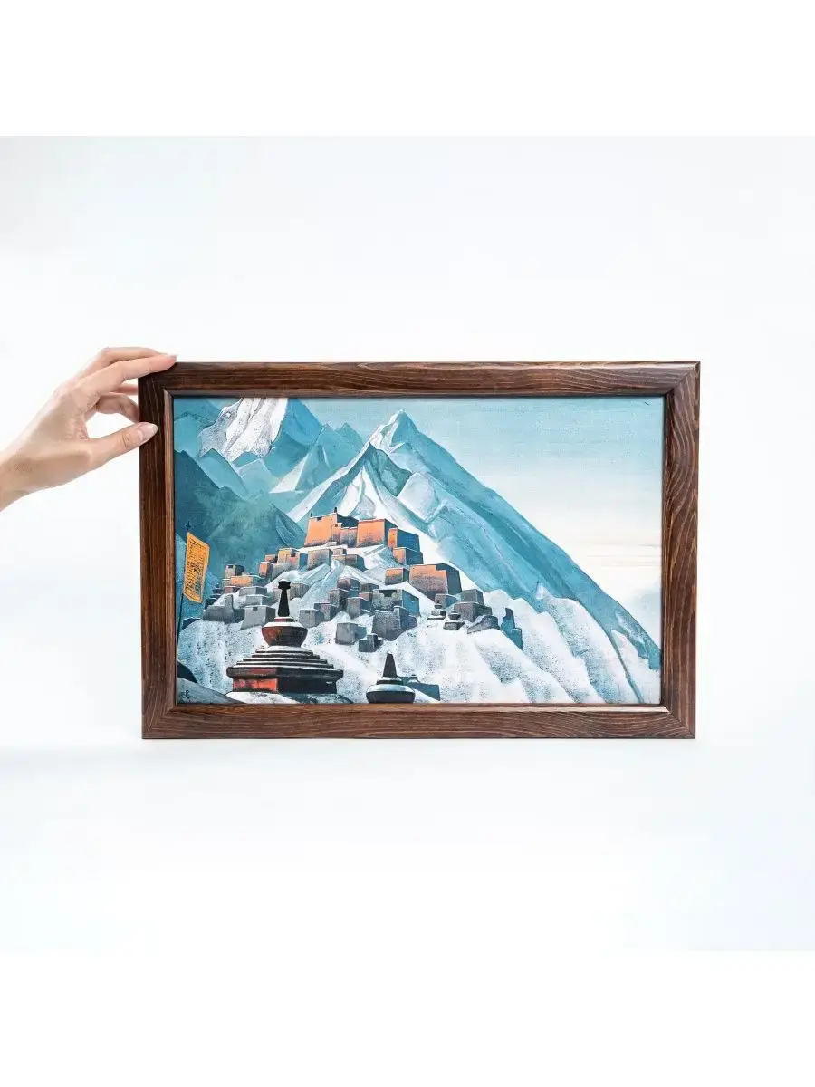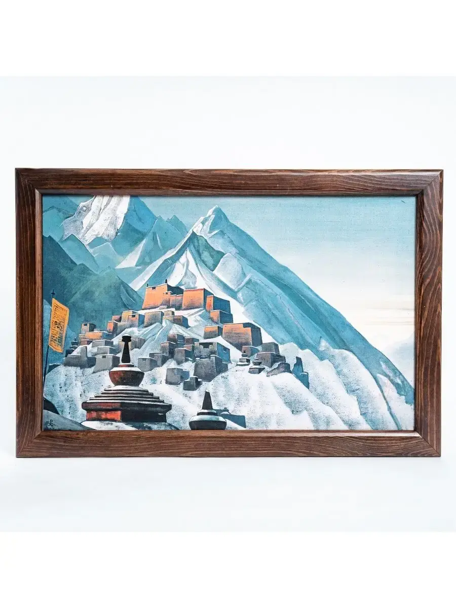 Репродукция картины в раме «Тибет. Гималаи» 1933 г. Николая Константиновича Рериха. Репродукция печатается на холсте, при печати используются экологически чистые пигментные чернила, рекомендованные для использования в жилых помещениях. Холст вставляется в рамку, изготовленную из натурального дерева сибирская сосна. Великолепно передано своеобразие Тибетского ландшафта. Яркая колористическая гамма, органичность тибетской архитектуры с горным рельефом. На переднем плане ступы, на среднем - большой монастырь, на заднем - близкие вершины гор, покрытые вечными снегами. Брезжит рассвет. Все засыпано снегом. Что привело людей на эти вершины? Откуда взялась сила, воздвигнувшая эти большие монолитные строения из хорошо отесанных камней - символы мощи и несокрушимости? За радостью духа шли на вершины Тибета люди. Здесь в этих невероятных для жизни условиях, под обжигающим ветром вьюг они окрылялись надеждой тоже когда-то взойти на вершины и отсюда шагнуть в Беспредельность, с последних ступеней Земли перенестись на дальние миры! Величествен и свободен дух Тибета, и эта срединная страна хранит потенциал своего достоинства. Умеет хранить непроницаемо. Ступы воздвигали над прахом великих подвижников. На переднем плане две ступы. Одна еще совсем целая, значит молодая, подальше уже разрушенная временем, вдали виднеются еще более древние ступы. Значит, в этом монастыре было немало подвижников, достигших высших ступеней озарения, принесших свои полные чащи самоотверженного служения.Н.К. Рерих