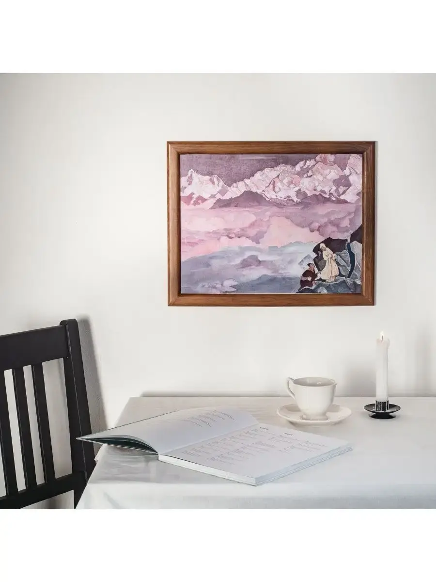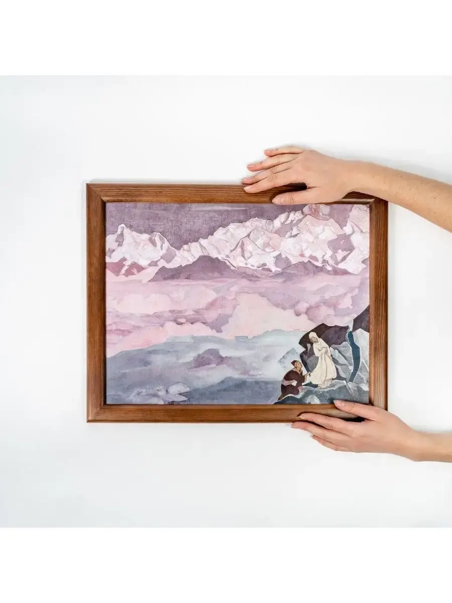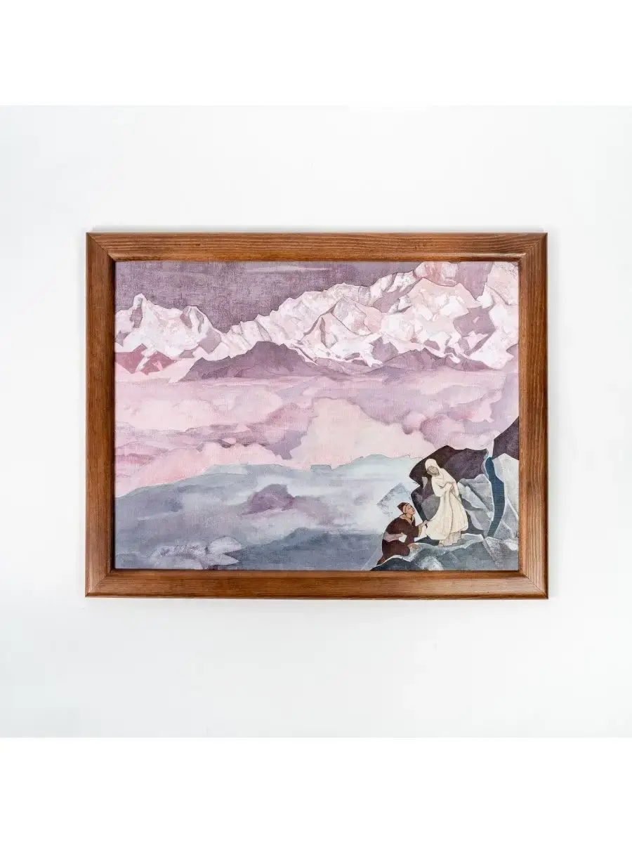 Репродукция картины в раме «ВЕДУЩАЯ. 1924» Николая Константиновича Рериха. Репродукция печатается на холсте, при печати используются экологически чистые пигментные чернила, рекомендованные для использования в жилых помещениях. Холст вставляется в рамку, изготовленную из натурального дерева сибирская сосна. «Сохраним восхищение перед самым трудным. Когда огонь любви сияет можно перейти любые препятствия...Нужно полюбить все препятствия, ибо камни на пути лишь ступени восхождения... Нет конца пути, ибо каждое достижение лишь знаменует собой устремление к новой вершине... Улыбнёмся трудности пути нашего и будем идти над пропастью, за ведущим и улыбаться.Справедливо быть признательным всем тем, кто в земных путях светло сказал великое слово «вперёд», кто не убоялся, не умалился, но всегда обновляясь, как мифический Антей, усиливался от новых прикосновений к земле. Будем же радоваться, когда видим здесь, среди нас, живой пример светлого, непоколебимого». Н.К. РерихНа картине «Ведущая» художник изобразил женщину в белых одеждах, которая поднимается вверх по горной тропе. За ней, держась за край её длинного одеяния, продвигается мужчина.Николай Рерих так объяснял смысл картины: «Мне хотелось в картине "Ведущая" дать светлый облик женщины, ведущей искателя подвига к сияющим вершинам...» Эту картину, как и многие другие, Николай Константинович посвятил своей жене — Елене Ивановне Рерих, разделившей с ним все трудности и радости жизни. Она явилась конкретным воплощением высокого предназначения женщины.Пройдя вместе многолетний жизненный путь с Еленой Ивановной, будучи в путешествии по далеким Гималаям, Рерих писал: «Сорок лет — не малый срок. В таком дальнем плавании могут быть извне встречены многие бури и грозы. Дружно проходили мы все препоны. И препятствия обращались в возможности...»Младший сын художника Святослав Рерих вспоминал о том, что Елена Ивановна «всячески способствовала и помогала Николаю Константиновичу в его творческой работе...»