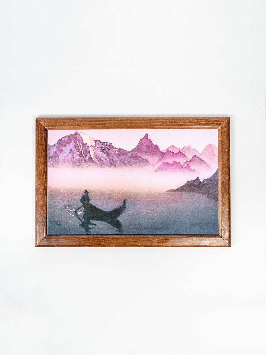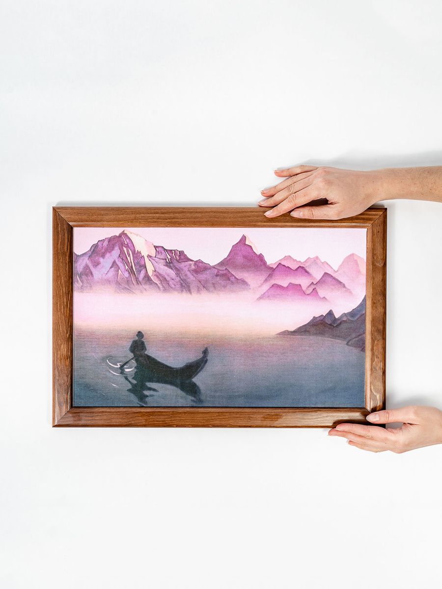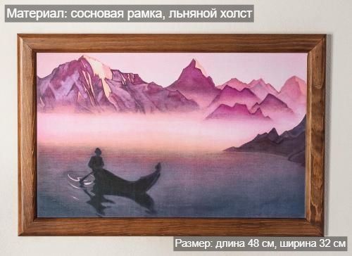 Репродукция картины на холсте в раме «ВЕСТЬ ОТ ГИМАЛАЕВ. 1940» Николая Константиновича Рериха. Репродукция печатается на холсте, при печати используются экологически чистые пигментные чернила, рекомендованные для использования в жилых помещениях. Холст вставляется в рамку, изготовленную из натурального дерева сибирская сосна. «Жалею, не имею снимка с последней картины "Весть от Гималаев". Ладья в предутреннем тумане удалась. Есть тишина и дальние горы светятся.1 Июня 1940 г.»Н.К. Рерих. "Встречи "«Согласно сказаниям и легендам, время от временииз Шамбалы появляются вестники и несут людям известия и предупреждения Учителей и мудрецов."Вестник от Гималаев" была создана накануне Войны между СССР и Германией и служила своеобразным предупреждением...». Альбом "Николай Рерих".