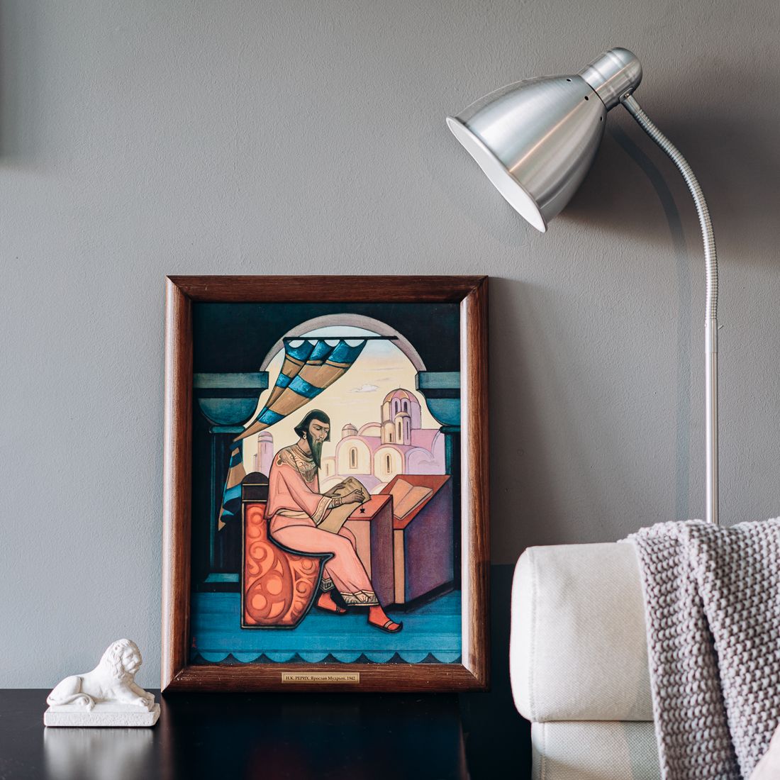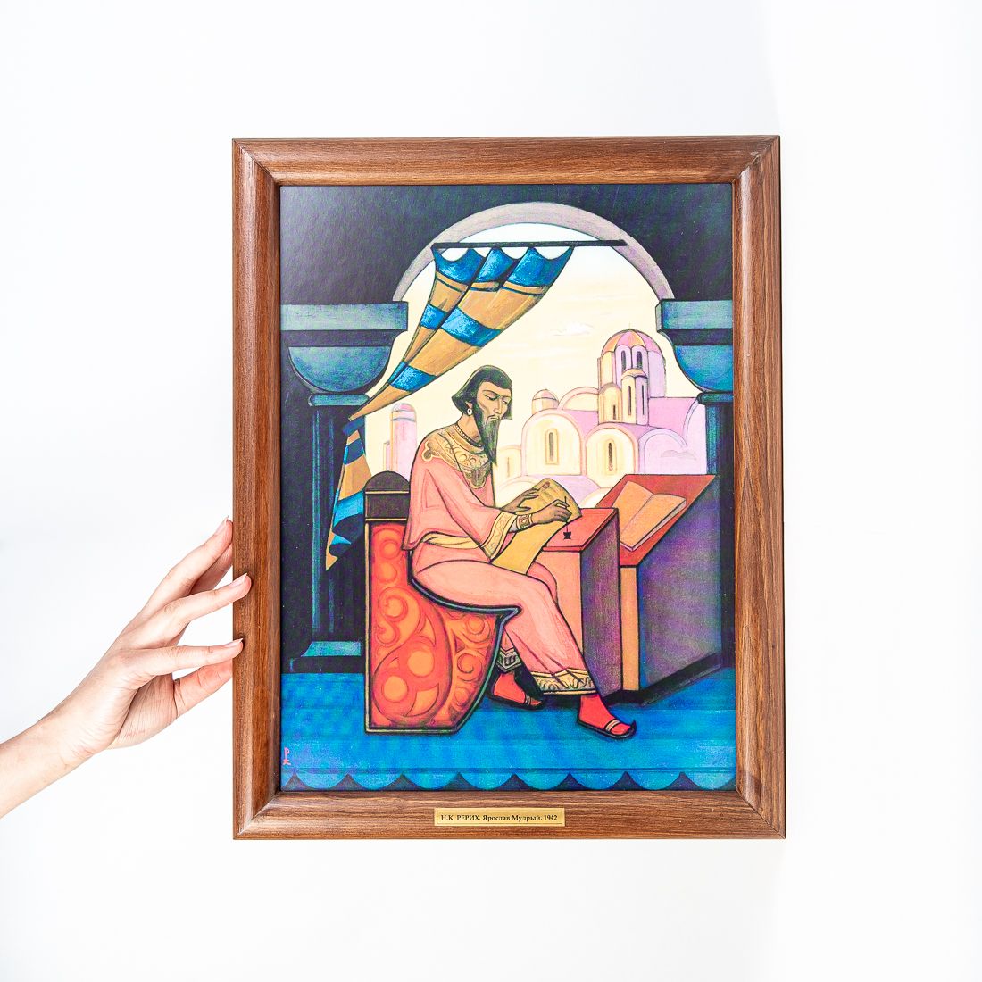 Репродукция картины в раме «Ярослав Мудрый. 1942» Николая Константиновича Рерих. Репродукция печатается на льне, при печати используются экологически чистые пигментные чернила, рекомендованные для использования в жилых помещениях. Холст вставляется в рамку, изготовленную из натурального дерева сибирская сосна. Не однажды Н. Рерих обращается к образу великого князя киевского Ярослава Владимировича. Его княжение — эпоха высшего процветания Киевской Руси. Он много содействовал распространению христианства на Руси, развитию необходимого для этих целей просвещения. Основал в Киеве храм Софии, великолепно украсив его фресками и мозаикой. Чтобы привить в народе начала христианской веры Ярослав велел переводить книги рукописные с греческого на славянский и много их покупал. Все эти рукописи он положил в библиотеку построенного им Софийского собора для общего использования. Наиболее известным остался Ярослав как законодатель. Ему приписывается древнейший русский памятник права — «Русская Правда». Своей законодательной деятельностью, заботами о распространении христианства, о церковном благолепии и просвещении Ярослав получил прозвище Мудрый. В картине Ярослав предстает во время творческой работы. Его одухотворенное лицо строго и красиво.