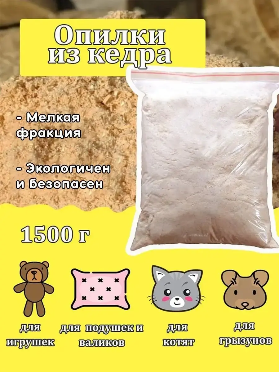 Отборные 100% Кедровые опилки! Кедровые опилки прекрасно подойдут для наполнения текстильных изделий - мягких мишек, кукол и других игрушек, подушек, валиков и др. Таким материалом удобно набивать мелкие детали игрушек. Хвойные породы издревле славятся своими целебными свойствами, благодаря большому содержанию эфирных масел и дубильных веществ. Кедр обладает дезинфицирующим свойством, насыщая воздух фитонцидами кедра. Наш продукт универсален и подойдет в роли наполнителя для лотков для ваших домашних любимцев. Опилки отлично впитывают влагу и скрывают неприятные запахи. Идеально подходят в качестве наполнителя в клетке грызунов!
