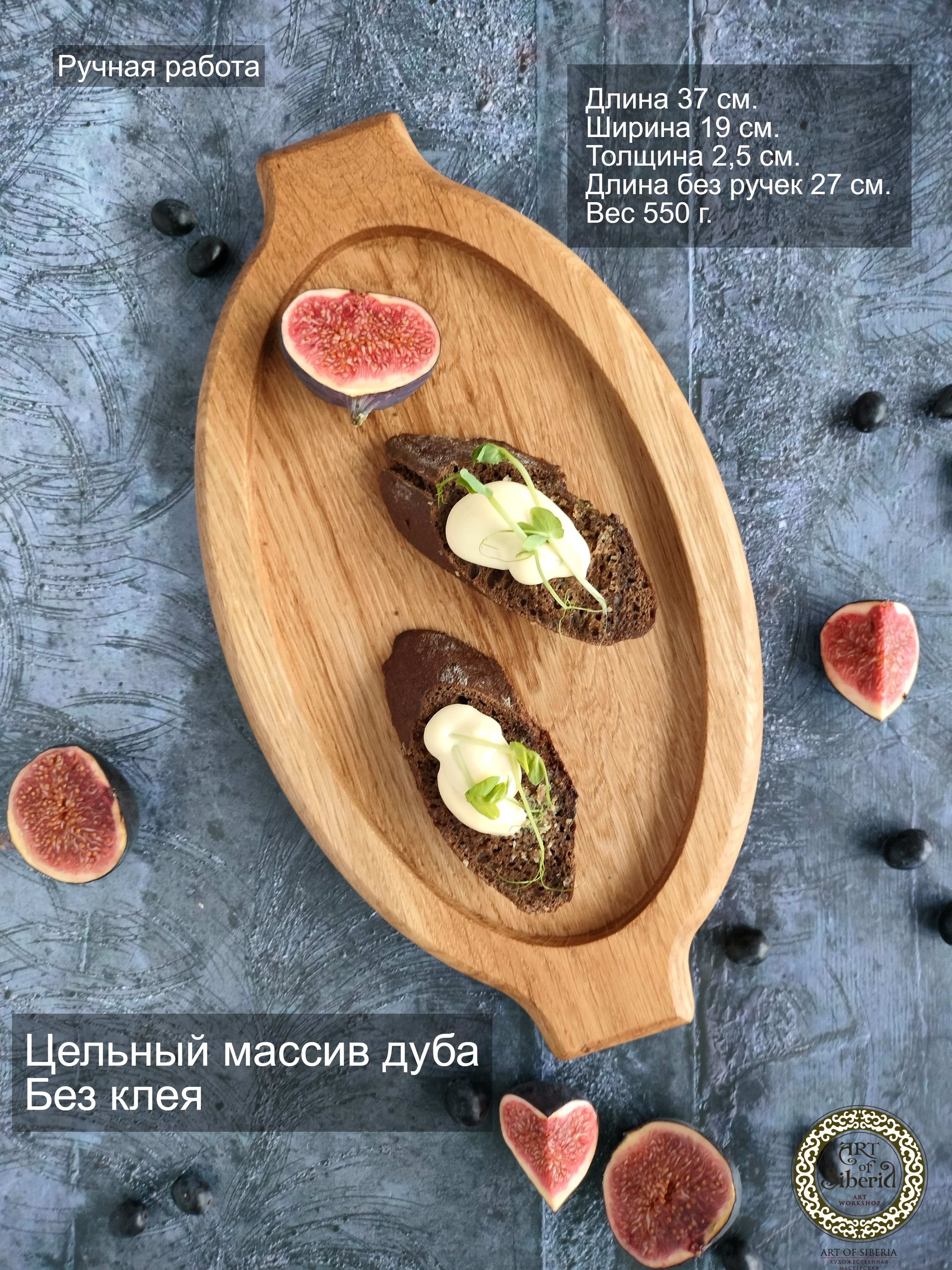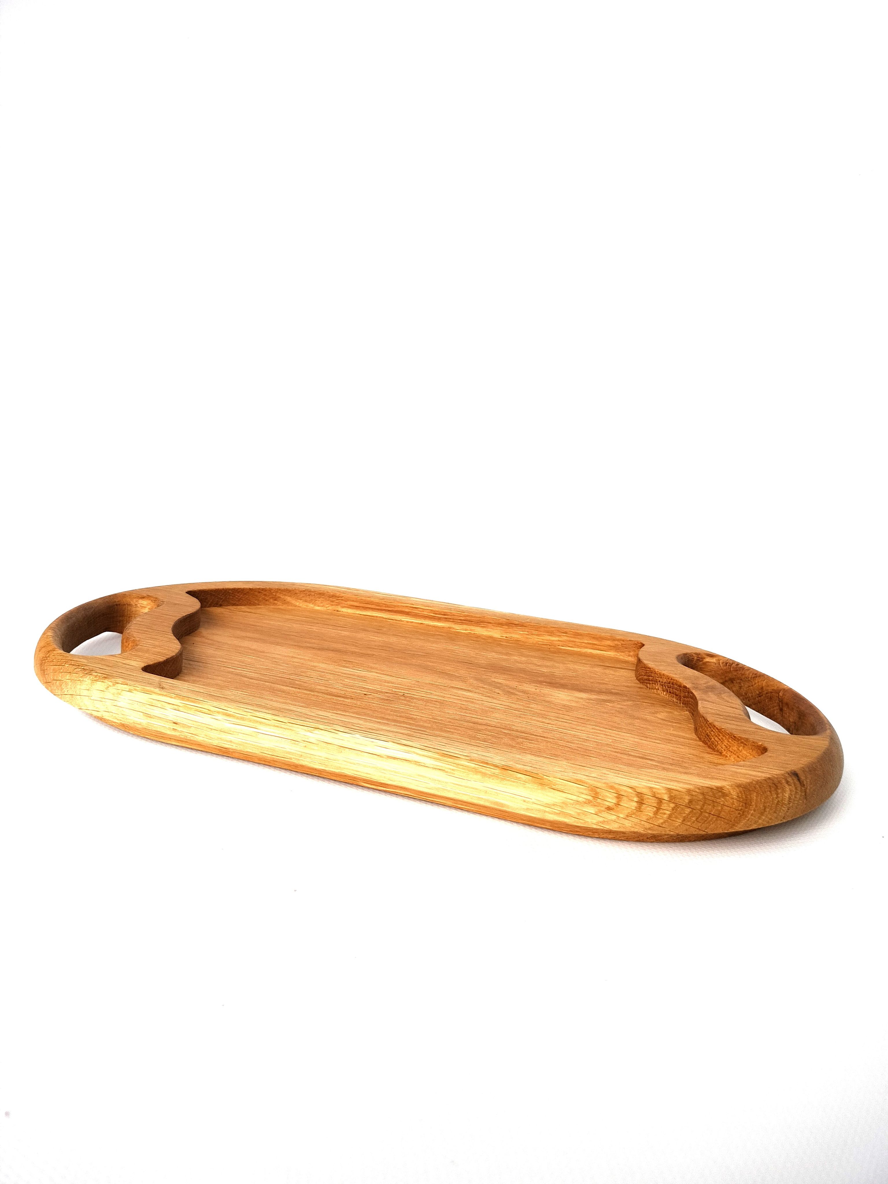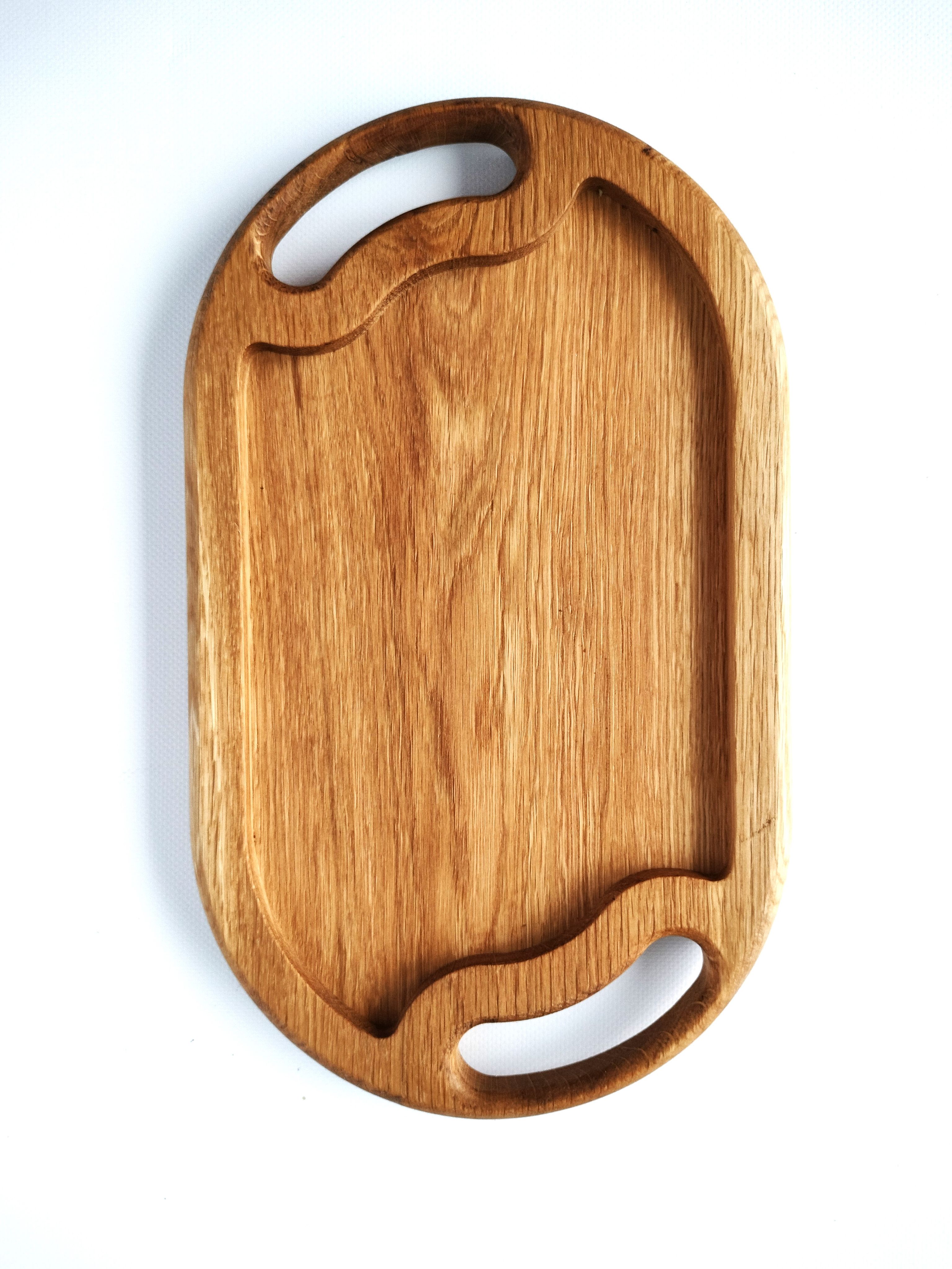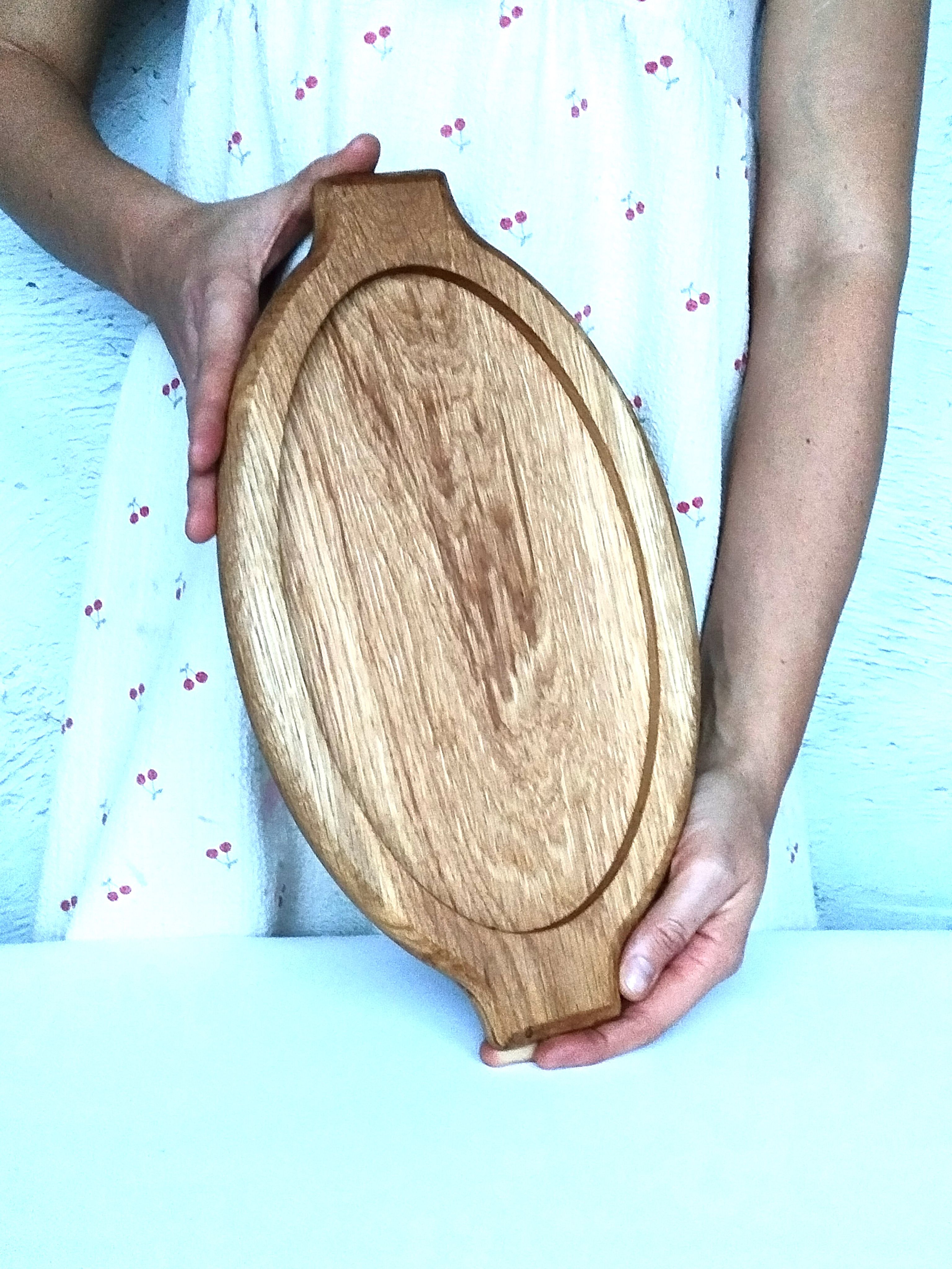Деревянный поднос овальной формы с ручками. Универсальный кухонный аксессуар! Отлично подойдет для сервировки завтраков в постель, чаепитий и кофе-брейк. Станет украшением стола при подачи горячего и закусок на компанию. Удобный размер благоволит к эффектной подачи любых блюд, будь то баранья нога, куриные крылышки или ассорти овощей гриль. Ваши гости не в силах отвести взгляд!