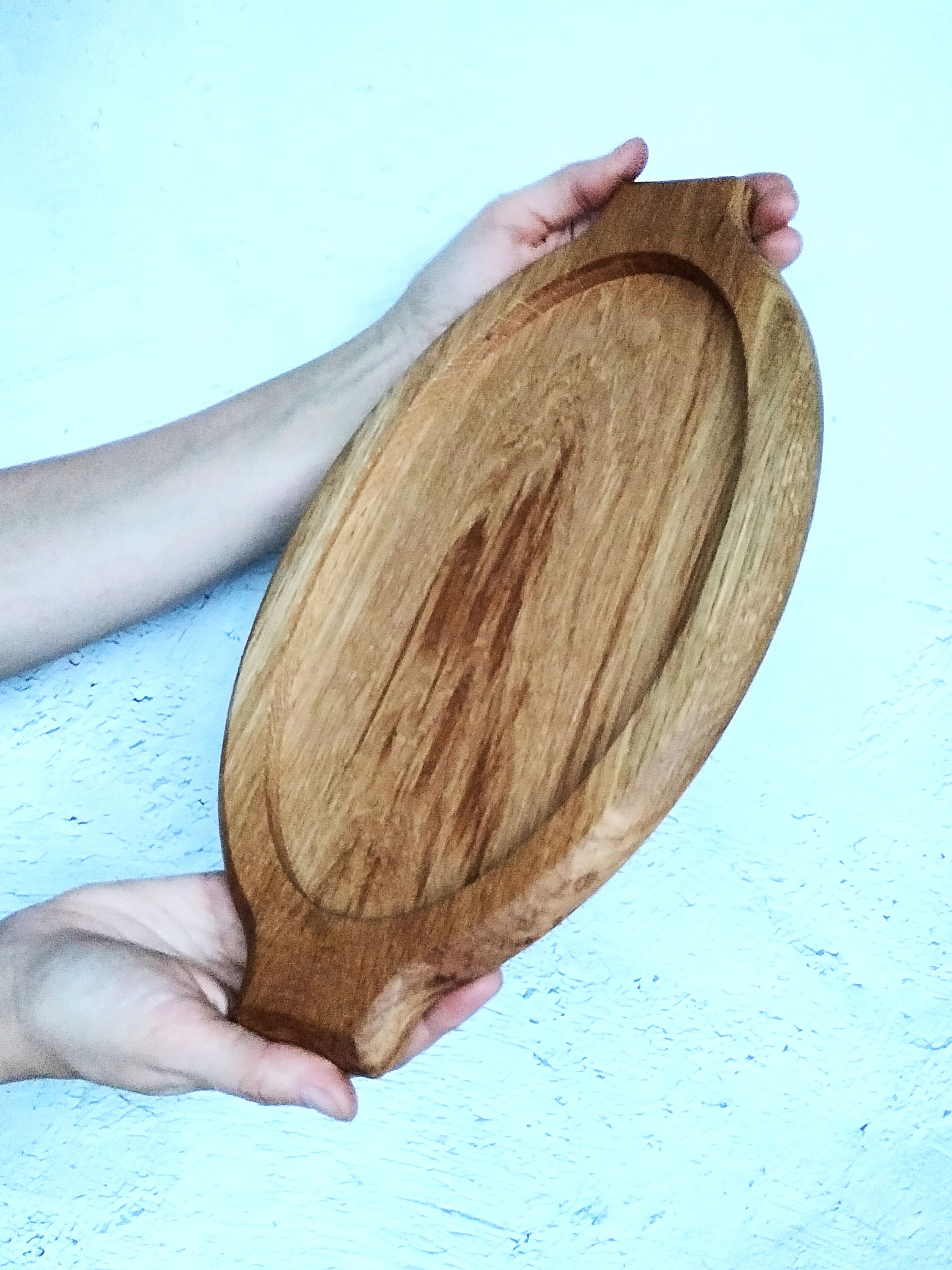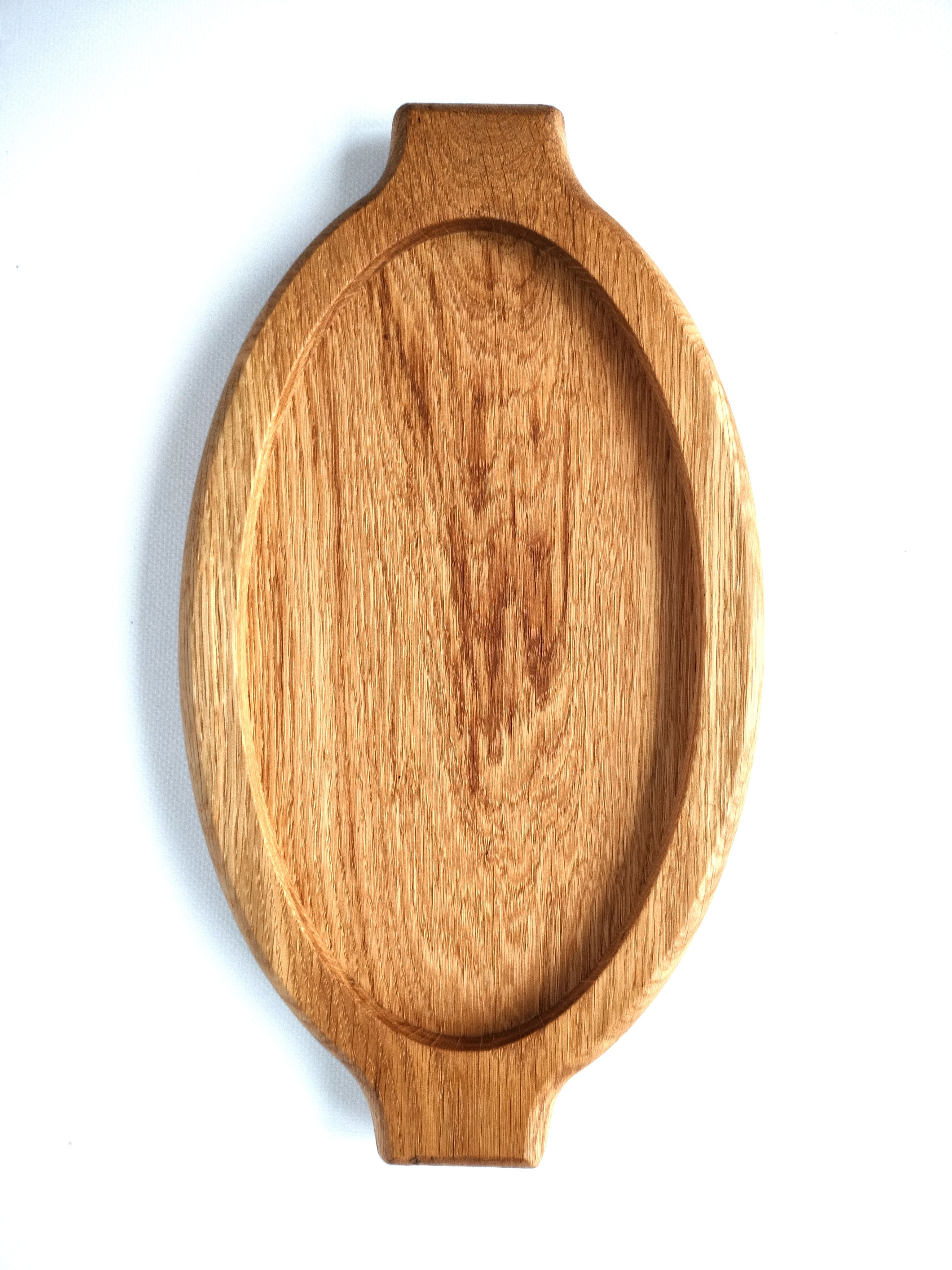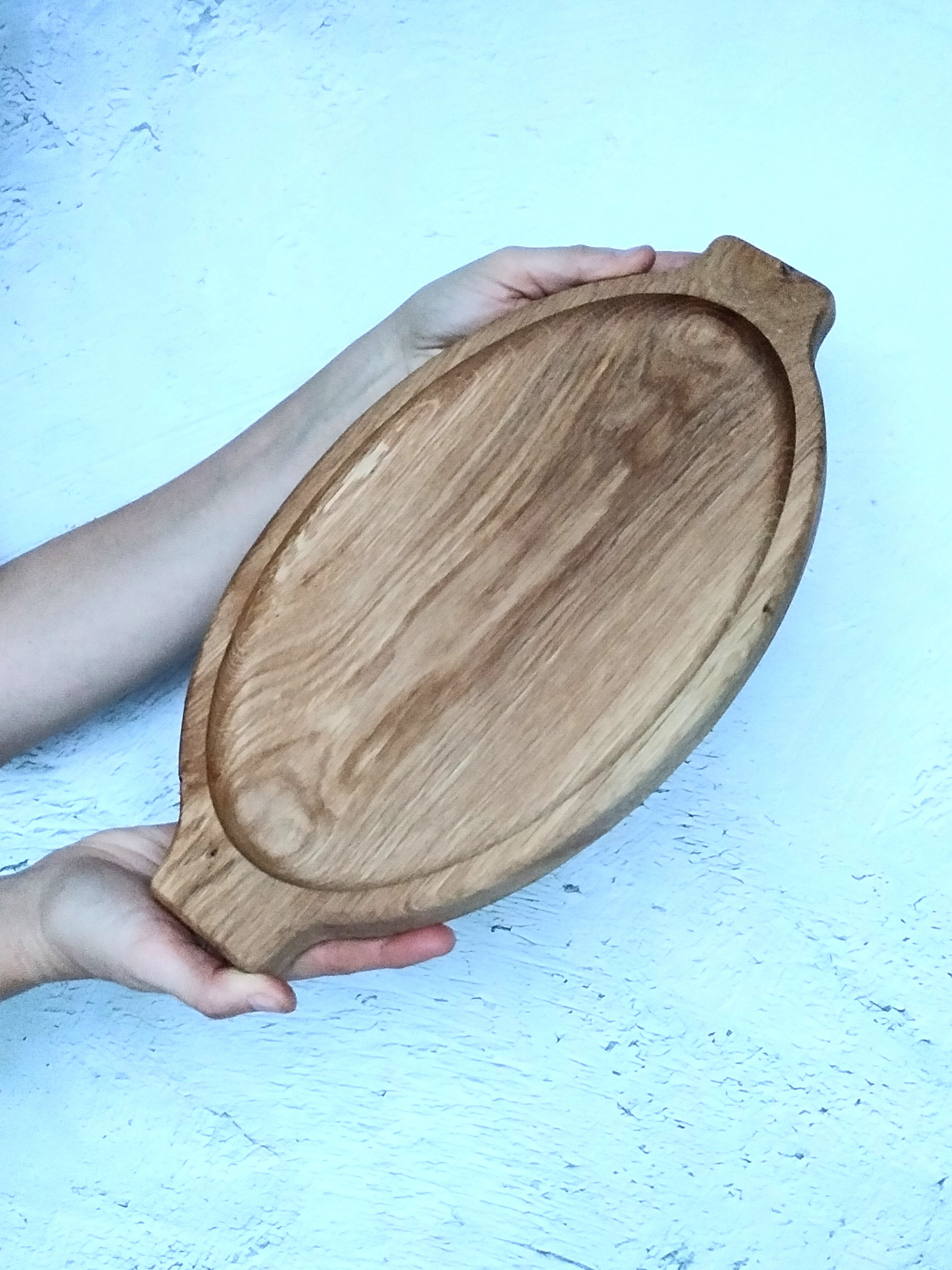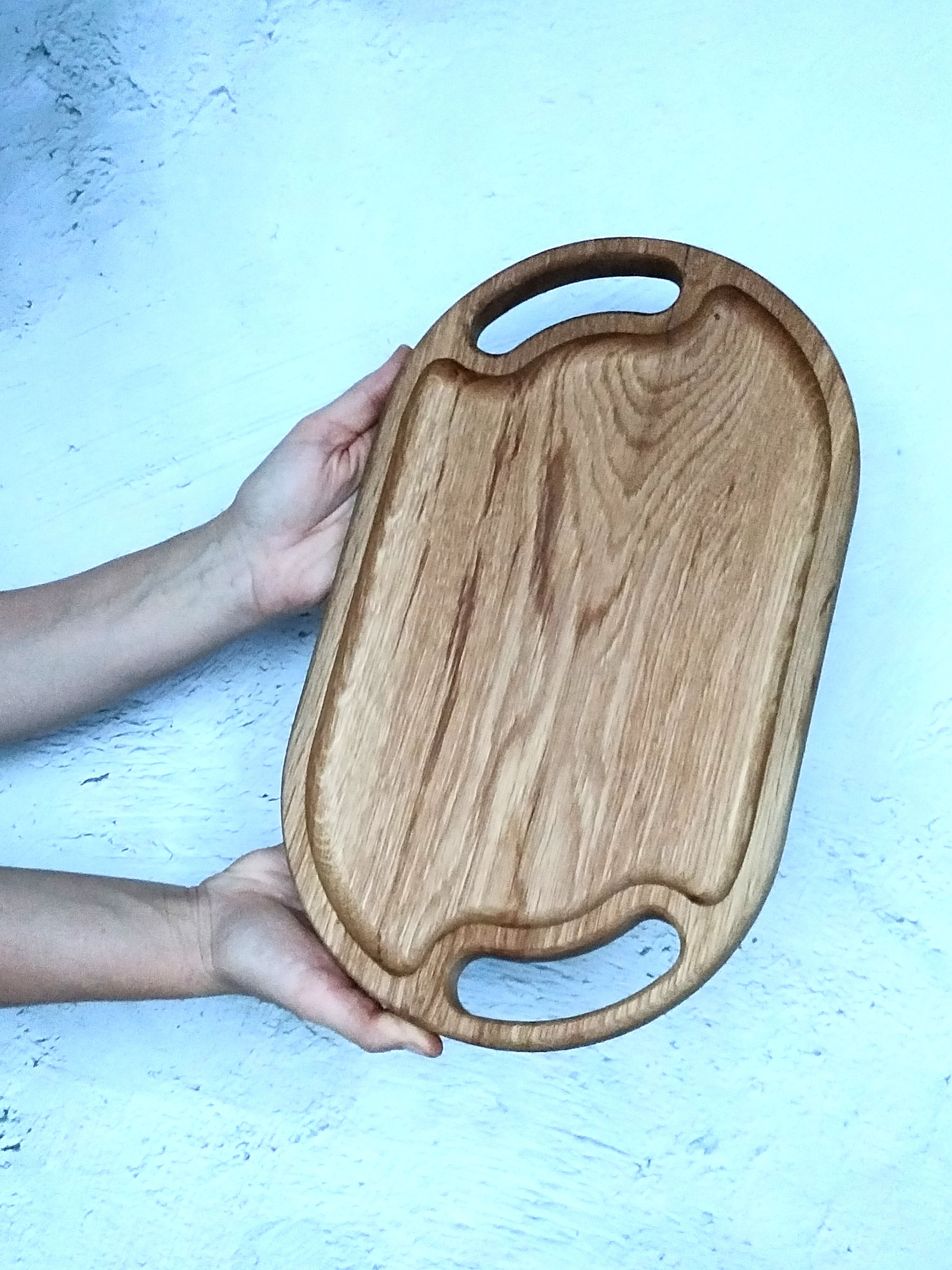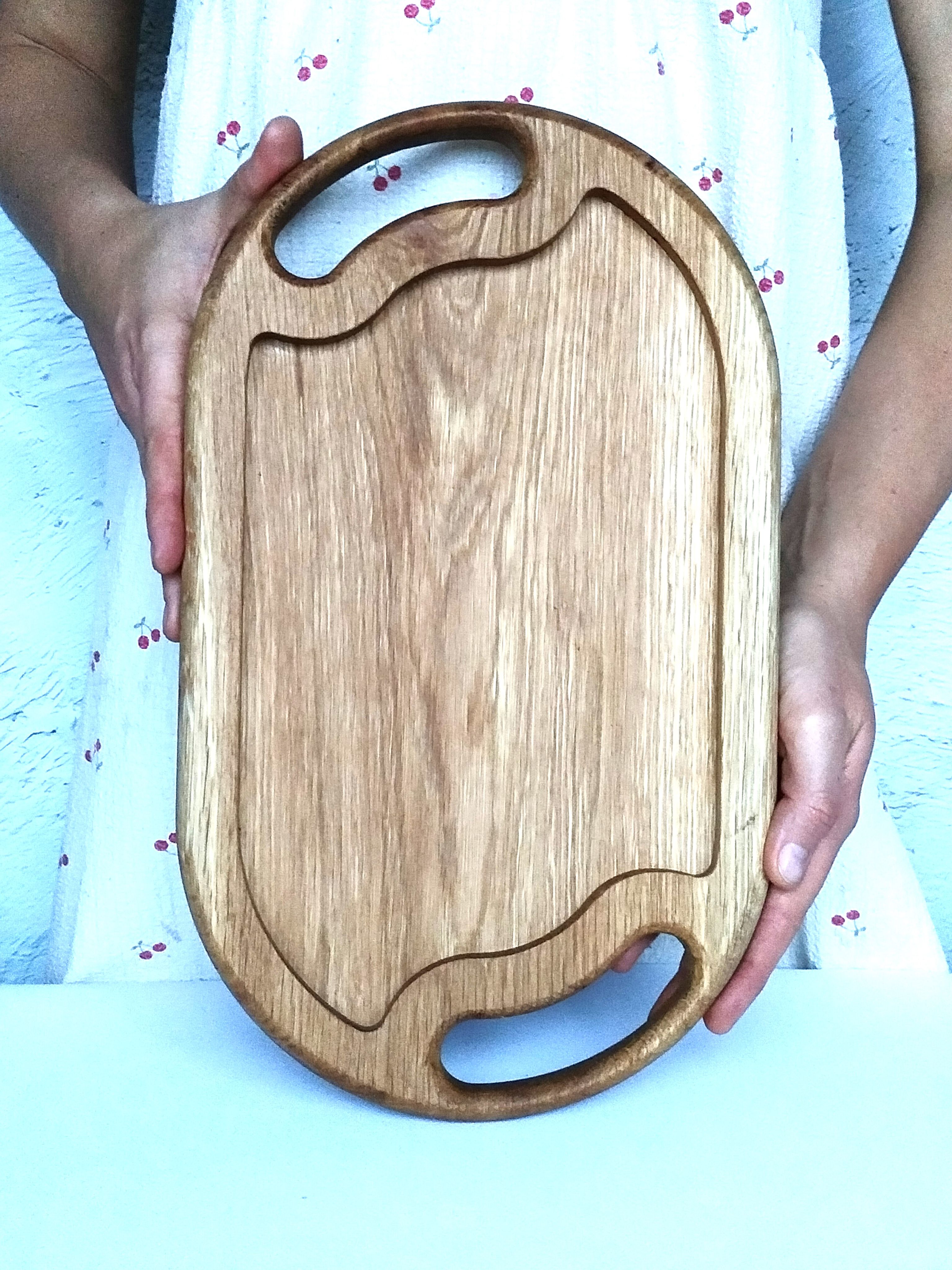 Деревянный поднос овальной формы с ручками. Универсальный кухонный аксессуар! Отлично подойдет для сервировки завтраков в постель, чаепитий и кофе-брейк. Станет украшением стола при подачи горячего и закусок на компанию. Удобный размер благоволит к эффектной подачи любых блюд, будь то баранья нога, куриные крылышки или ассорти овощей гриль. Ваши гости не в силах отвести взгляд!
