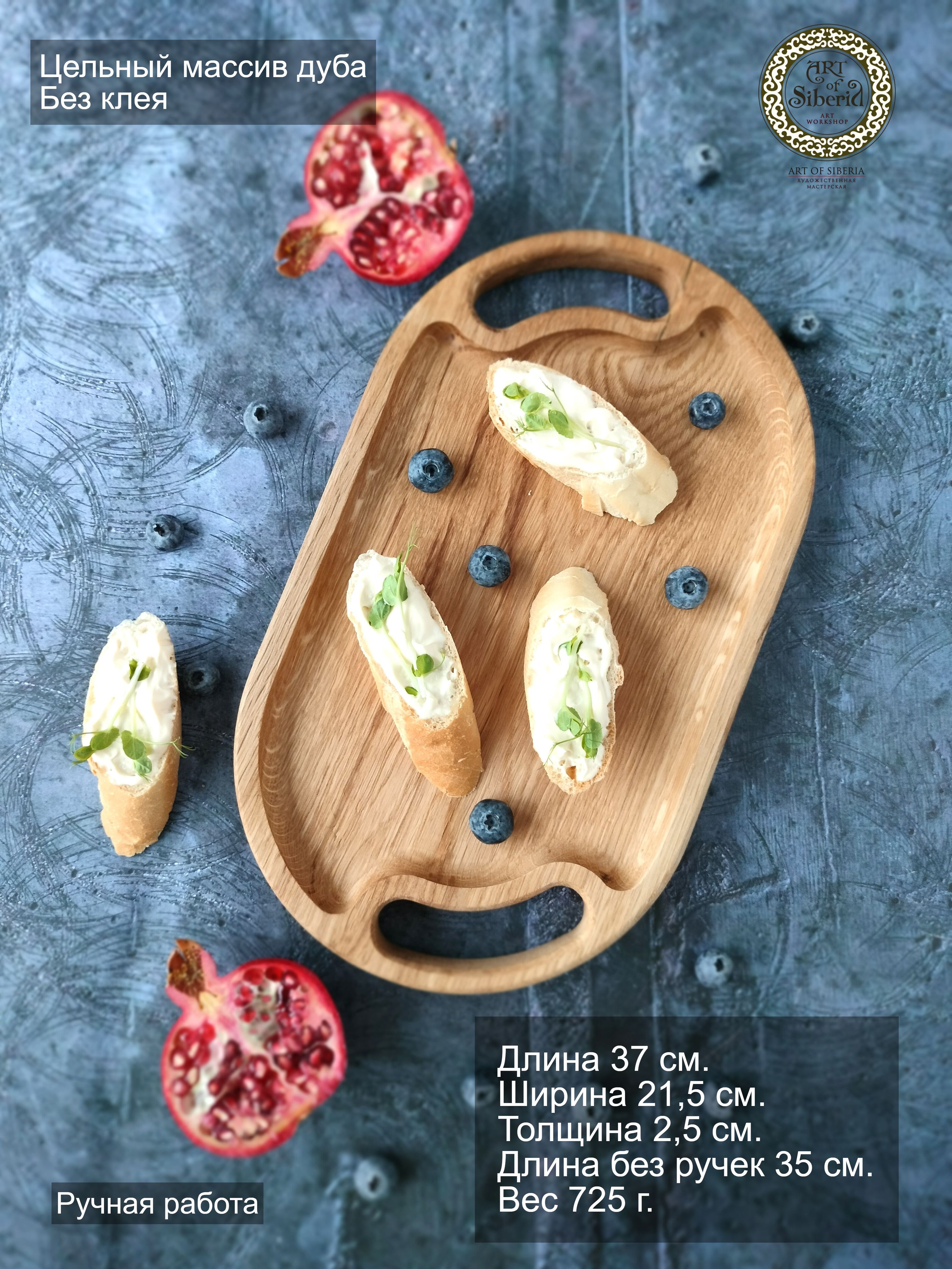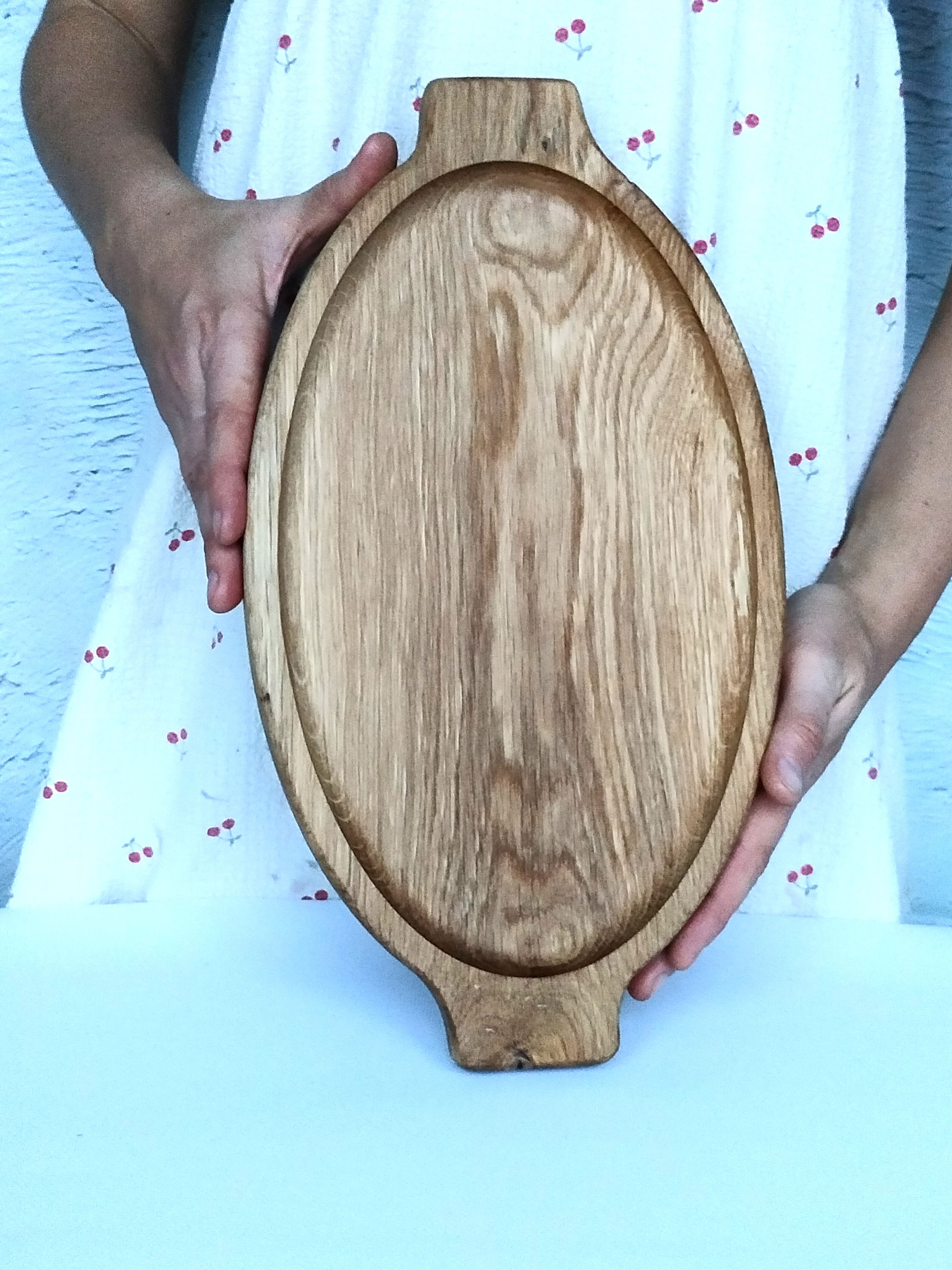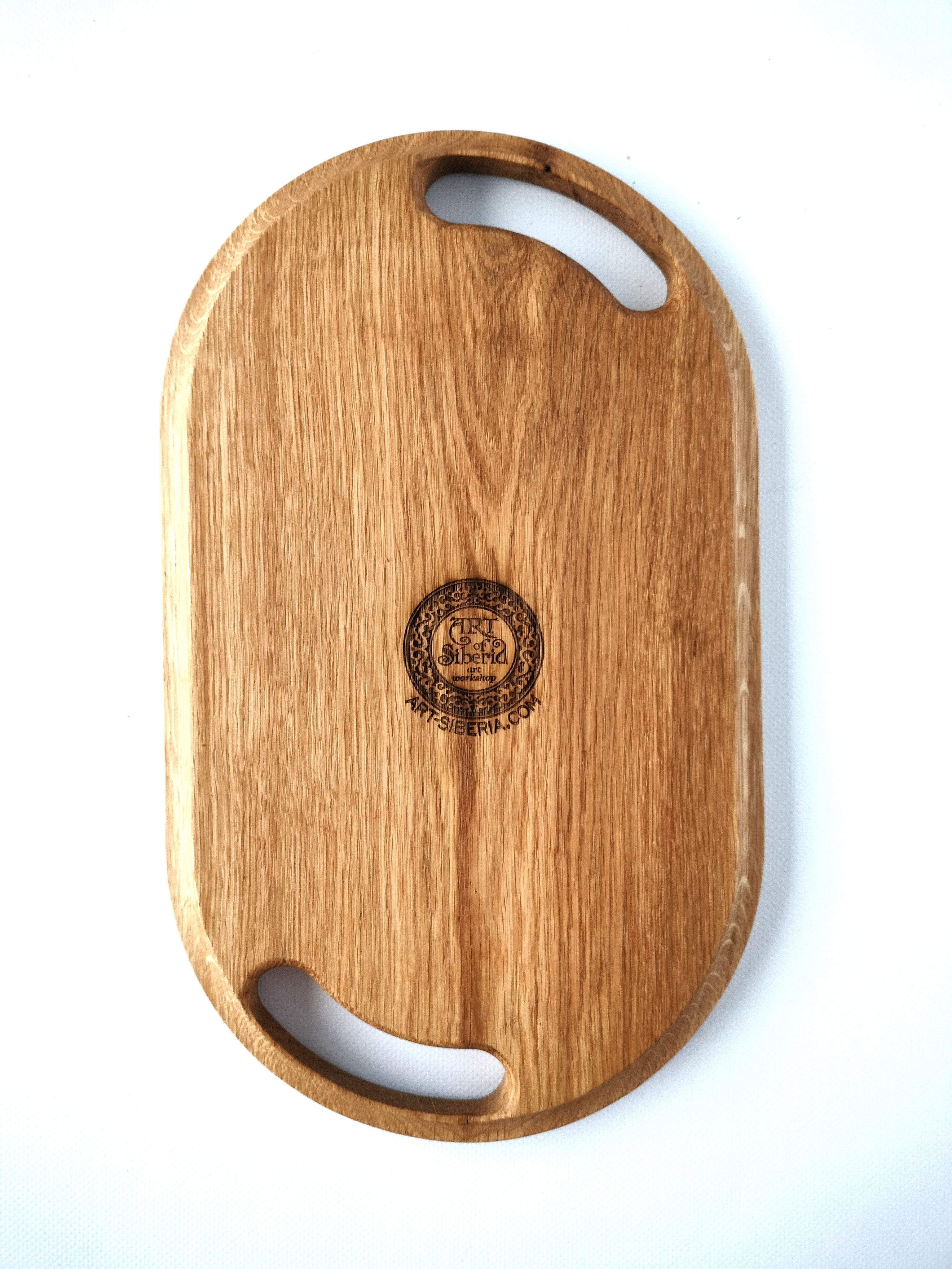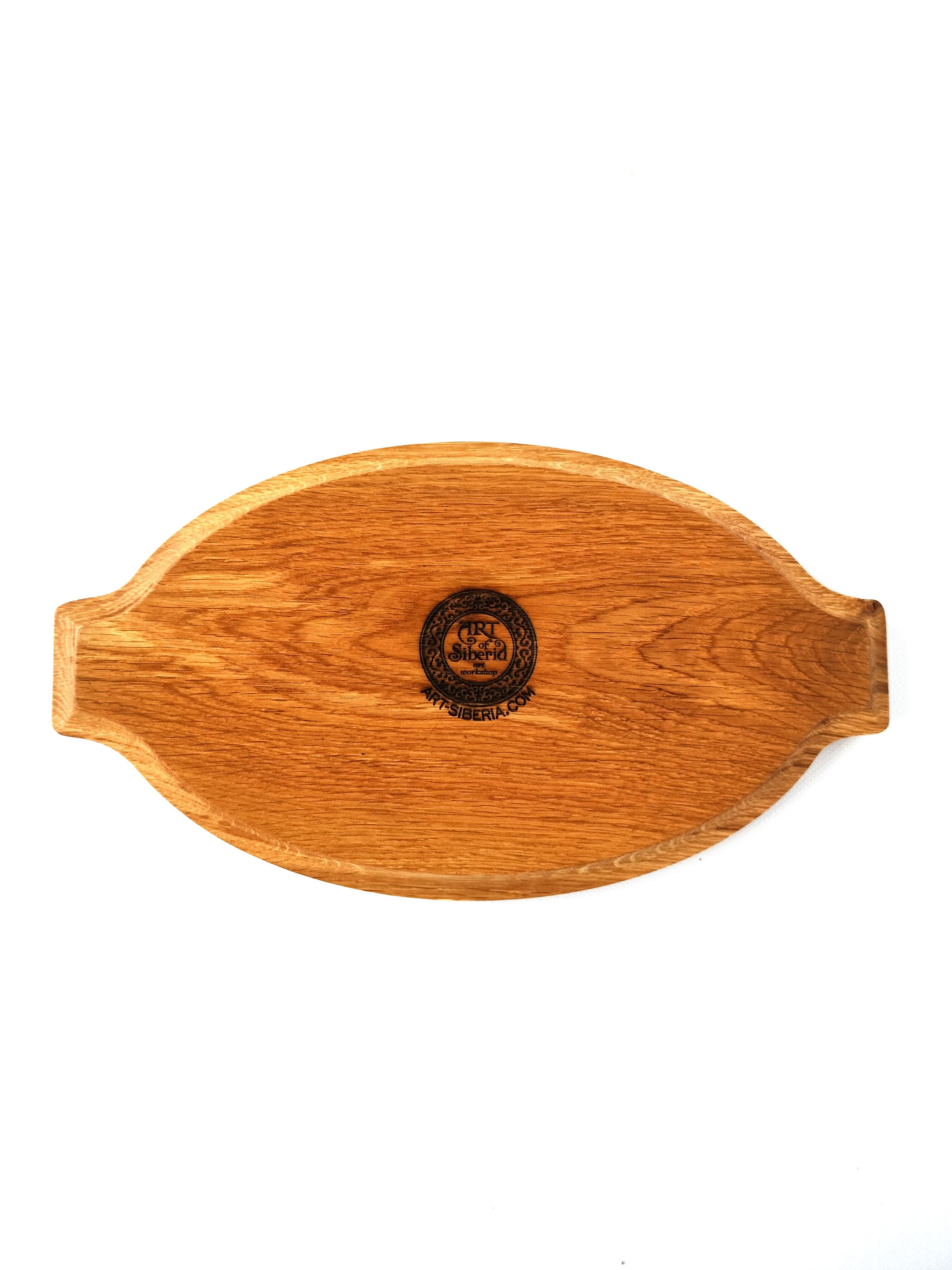 Поднос выполнен из дуба - ценной, твердой древесины с роскошной текстурой. Защитное покрытие натуральное, пчелиный воск и масло растительное. Изделие прочное, долговечное и солидное. Мы - производители и гарантируем 100% качество продукции.