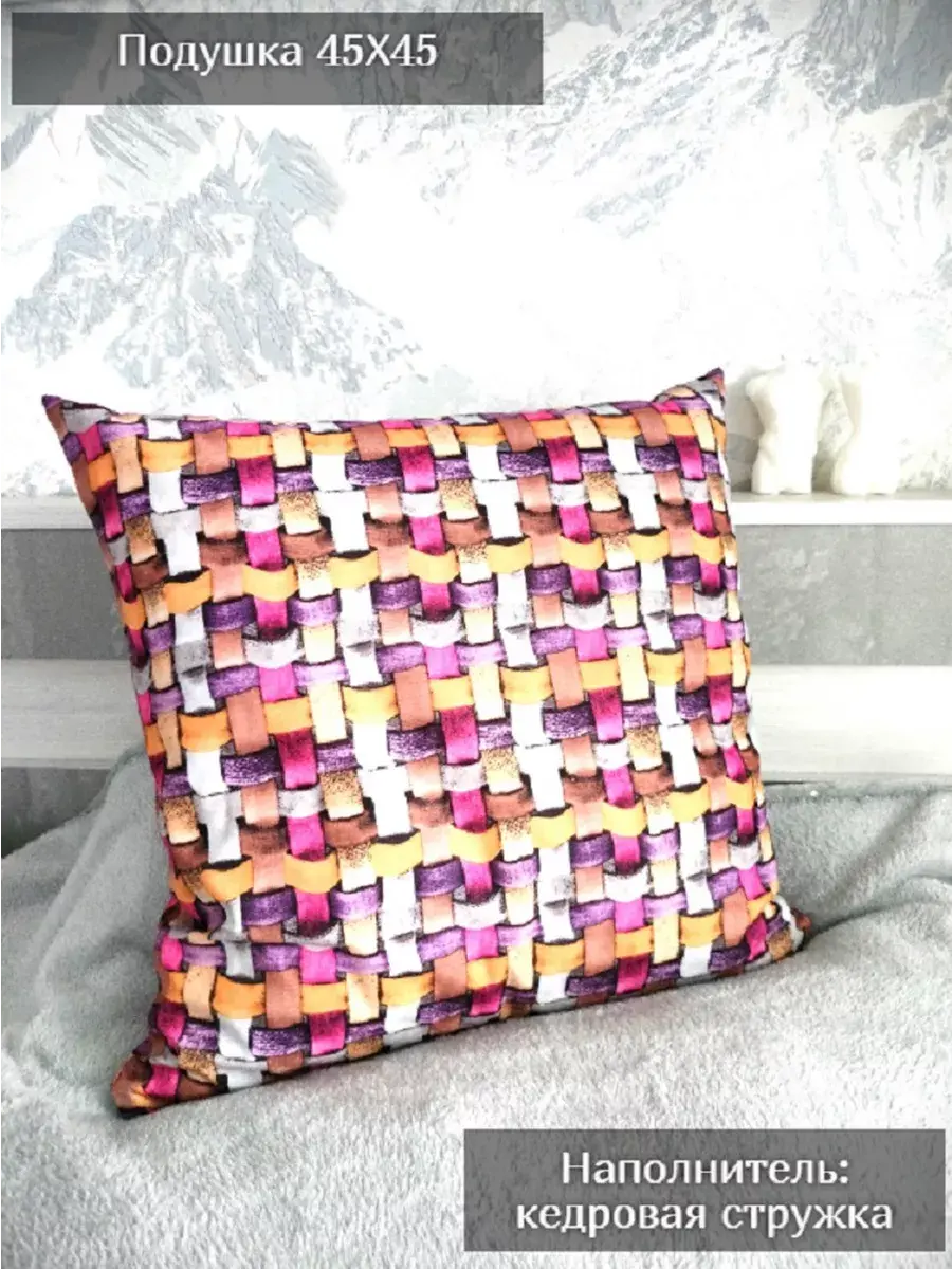 Подушка для здорового сна. Можно использовать как декоративную подушку для зала и гостинной. Размер подушки 450х450 мм. Жесткость подушки вы можете регулировать убирая наполнитель. Наполнитель: полностью экологичная и натуральная кедровая стружка. Хлопковая подушка с кедровой стружкой наполнит Ваш дом ароматом натурального Сибирского кедра! Приятное ощущение - сон на природе: палатка, маленький домик в лесу или поляна под открытым небом... Дышится легко, пьянящий аромат трав и деревьев дурманит, звуки природы ласкают слух. Спится легко и сладко... В городе такое удовольствие получить трудно, но возможно. В этом Вам помогут наши кедровые подушки. Кедровая подушка натуральна, экологична и полезна для здоровья. Обладает ненавязчивым ароматом хвойной древесины, что особо ценно в суете мегаполиса. Этот аромат несет невидимую пользу, предохраняя вашу семью от респираторных заболеваний, благодаря огромному количеству эфирных масел и фитонцидов. Особая фракция стружки делает подушки мягкими и упругими - их можно использовать как декоративные, диванные, для дневного отдыха и ночного сна, как подушки у изголовья. К тому же такая подушка это волшебный подарок на Новый год или новоселье! Подушка имеет массажный эффект, что хорошо для кожи лица и головы, для здоровья волос. Является профилактикой остеохондроза, головных болей, отеков лица и мешков под глазами. Чехол выполнен из 100% хлопка, имеет застежку-молнию.