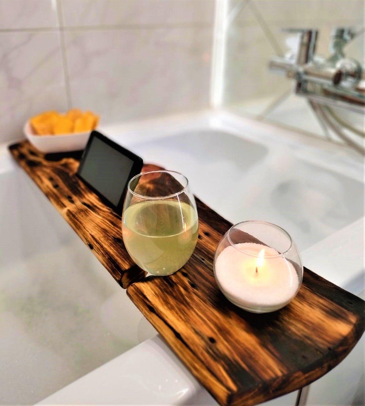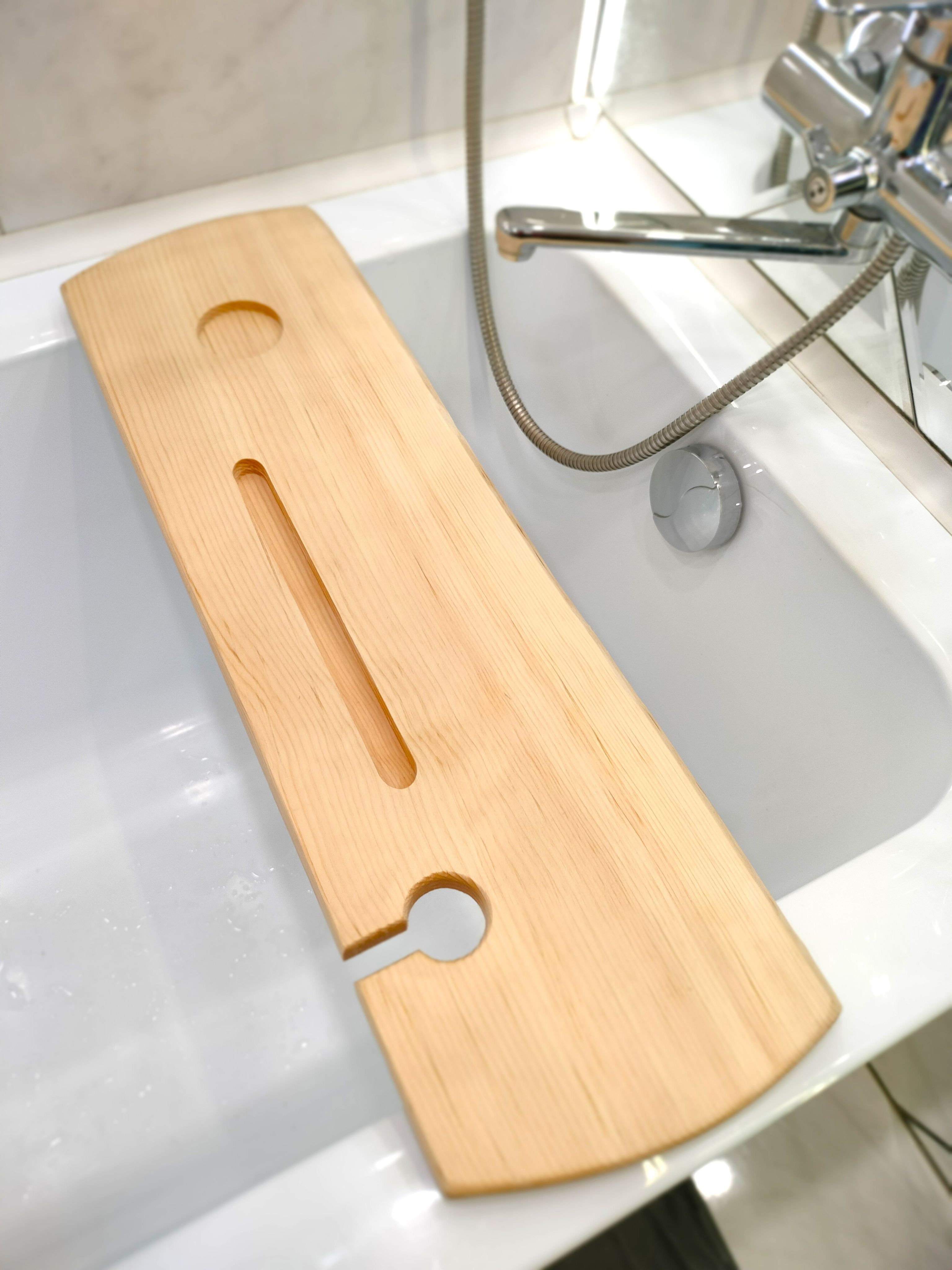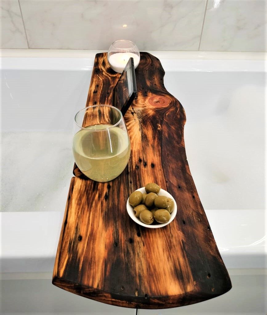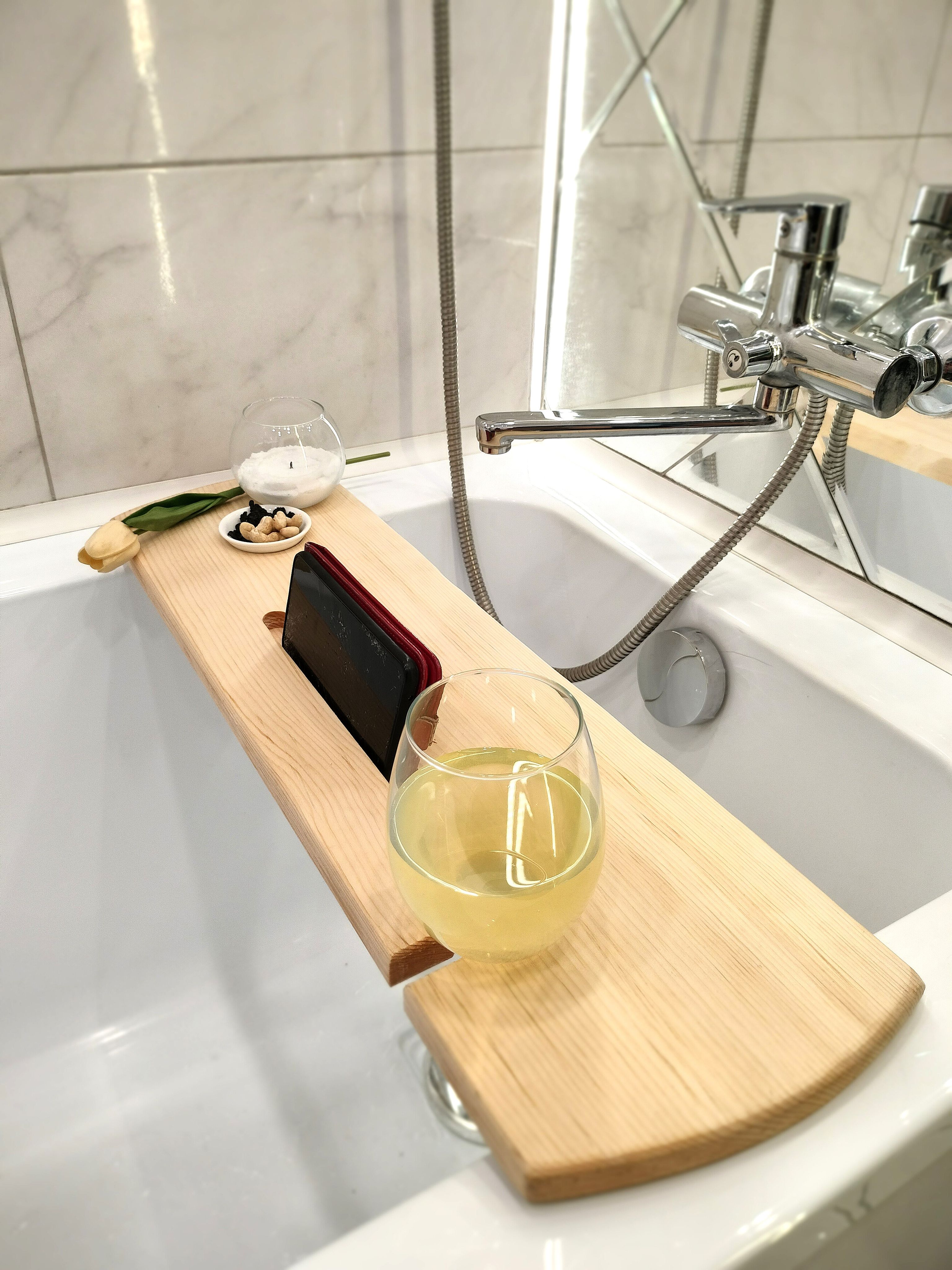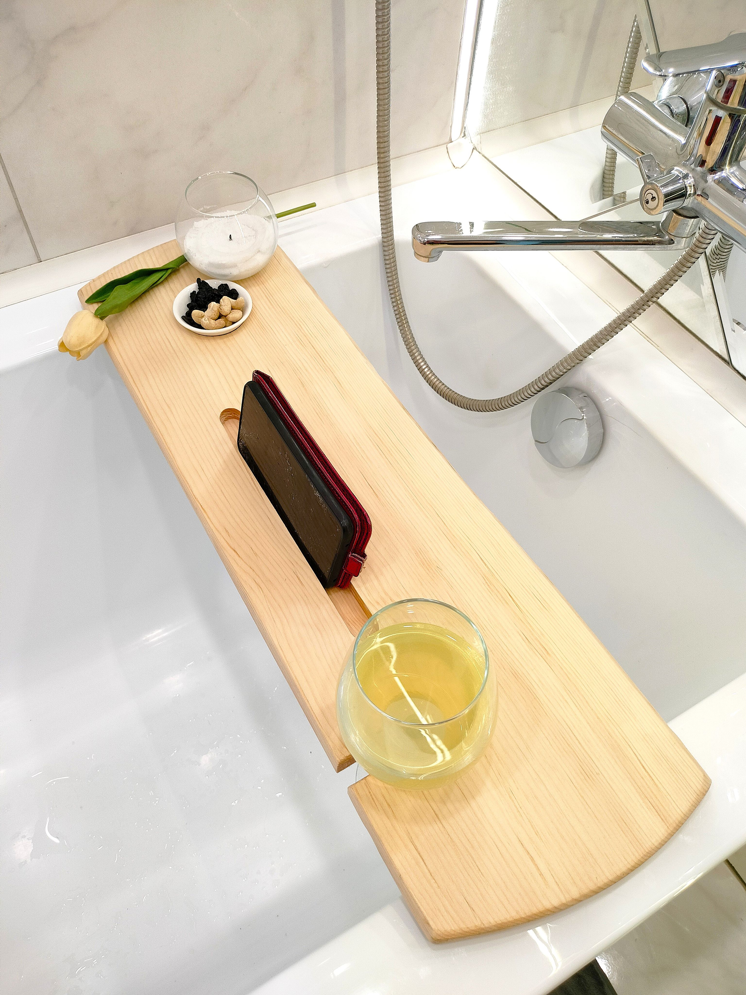 Столик - полка на ванну изготовлен из цельного массива кедра в цвете обжиг. ВОЗМОЖНО НАЛИЧИЕ СЛЕДОВ ОТ КОРОЕДА!!!В отличии от других моделей он подходит для всех типовых ванн - 60, 70, 80 см. Идеально подходит для постоянного использования во влажном помещении, хорошо переносит повышенную температуру и влажность, не теряя при этом ни цвет, ни внешнюю привлекательность. Углубления для установки чашек или бокалов, телефонов и книг. Отделения для банных принадлежностей или ароматной свечи. Деревянная доска для ванной пропитанная специальным составом для защиты от воздействия влаги (влагостойкая) .Полка-столик - потрясающий подарок на день рождения, новоселье, свадьбу и другие праздники! Органайзер для ванны - необычный, стильный, трендовый подарок для вас и ваших близких! Штучный УНИКАЛЬНЫЙ товар ручной работы. Размер: длина 82 см., ширина от 18 до 24 см. Цвет "обжиг".