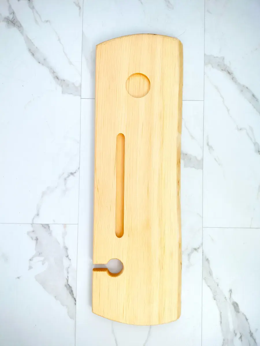 Столик - полка на ванну изготовлен из цельного массива кедра в цвете обжиг. ВОЗМОЖНЫ СЛЕДЫ ОТ КОРОЕДА И НАЛИЧИЕ СУЧКОВ!!! Подходит для ванн 60 и 70 см. Подходит для постоянного использования во влажном помещении, хорошо переносит повышенную температуру и влажность, не теряя при этом ни цвет, ни внешнюю привлекательность. Углубления для установки чашек или бокалов, телефонов и книг, планшетов. Отделения для банных принадлежностей или ароматной свечи. Деревянная доска для ванной пропитанная специальным составом (маслом-воском) для защиты от воздействия влаги (влагостойкая) Полка-столик - потрясающий подарок на день рождения, новоселье, свадьбу и другие праздники! Органайзер для ванны - необычный, стильный, трендовый подарок для вас и ваших близких! Штучный УНИКАЛЬНЫЙ товар ручной работы. Размер доски: 75 см., ширина от 18 до 24 см. Цвет натуральный.