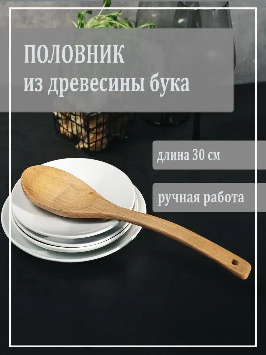 Половник из древесина бука для вашей кухни! При использовании деревянной поварешки во время приготовления пищи исключается вероятность получить ожог, потому что у дерева низкая проводимость тепла, и в отличие от металла оно не нагревается. Такая утварь не царапает посуду, ведь дерево - в некотором смысле податливый и мягкий материал. Это дает возможность использовать его для готовки в кастрюлях и сковородках с антипригарным и тефлоновым покрытием. В отличие от пластика и прочих новомодных материалов, натуральный массив не выделяет токсинов и не влияет на вкус блюд. Размер: длина 30,0 см, ширина 7,0 см.