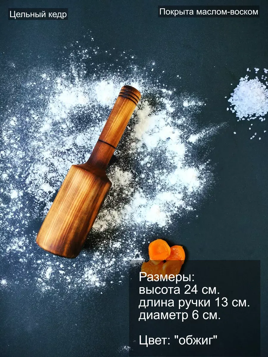 Представляем вашему вниманию кухонный девайс - толкушка!!! Многие предпочитают на гарнир делать овощное пюре. Если его правильно приготовить, то блюдо получится воздушным, нежным и вкусным. Сделать гарнир таким поможет картофелемялка для пюре или толкушка. Наша толкушка из кедра - кухонный аксессуар, который ничем не возможно заменить! Толкушку можно использовать для приготовления любого овощного пюре, а также измельчать чеснок и другие специи, ягоды, травы. Кедровая толкушка не окисляется и не вступает в химические реакции с пищевыми продуктами. Толкушку легко мыть, срок ее службы практически неограничен. А благодаря ручке предметом удобно пользоваться пока картофель еще горячий. **Размер:** Высота 24 см.,длина ручки 13 см., диаметр 6 см., Макс. диаметр ручки 3,2 см. Цвет "обжиг".