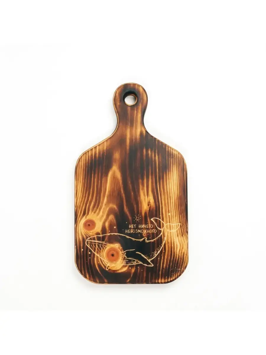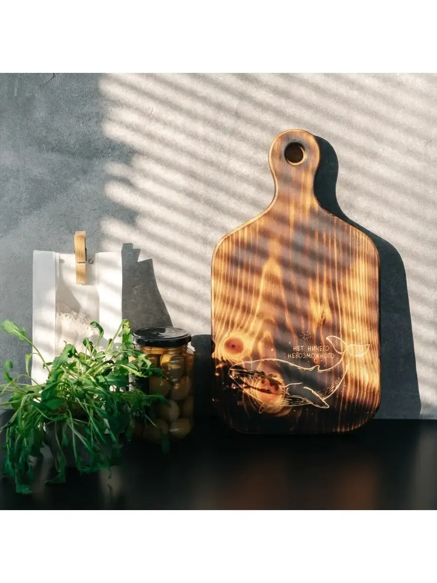 Доска разделочная из древесины сибирского кедра с гравировкой "Нет ничего невозможного". Мы предлагаем вам деревянные разделочные доски, изготовленные из цельного бруска дерева Сибирский кедр. Они обладают массой положительных качеств: ножи не тупятся, долговечные, прочные, устойчивы к повреждениям и перепадам температуры, подходят для разделывания больших кусков мяса, а самое главное, а самое главное, кедр обладает антибактериальными свойствами, и бактерии, попадая в волокна доски, не размножаются, а погибают. Ну и, конечно же, частички разделочной доски, попадая в организм человека не причинят вреда. Размер: длина 44 см., ширина 15 см., высота 2,2 см.