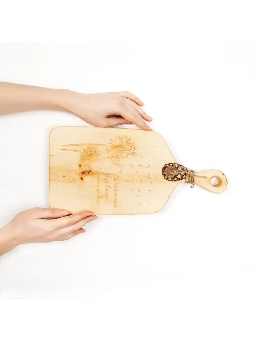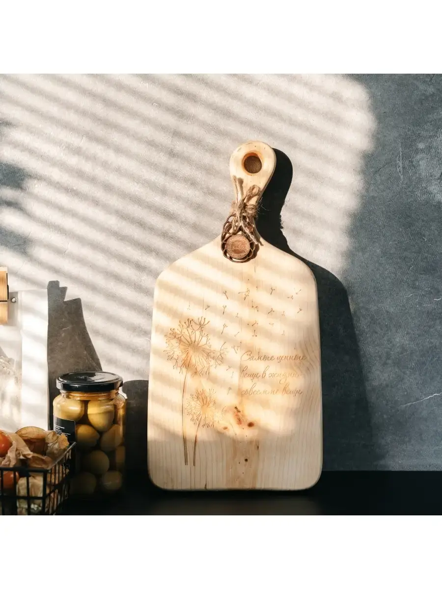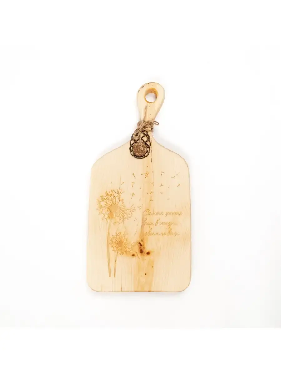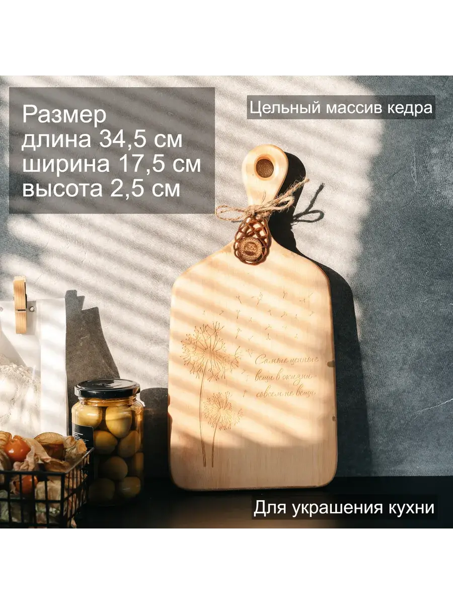 Разделочная деревянная доска из древесины сибирского кедра для мяса с гравировкой "Самые ценные вещи в жизни - совсем не вещи". Мы предлагаем вам деревянные разделочные доски, изготовленные из цельного бруска дерева Сибирский кедр. Они обладают массой положительных качеств: ножи не тупятся, долговечные, прочные, устойчивы к повреждениям и перепадам температуры, подходят для разделывания больших кусков мяса, а самое главное, а самое главное, кедр обладает антибактериальными свойствами, и бактерии, попадая в волокна доски, не размножаются, а погибают. Ну и, конечно же, частички разделочной доски, попадая в организм человека не причинят вреда. Размер: длина 34,45 см., ширина 17,5 см., высота 2,5 см.