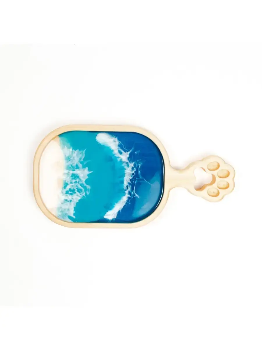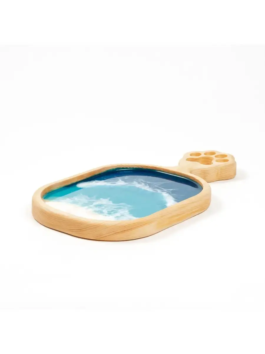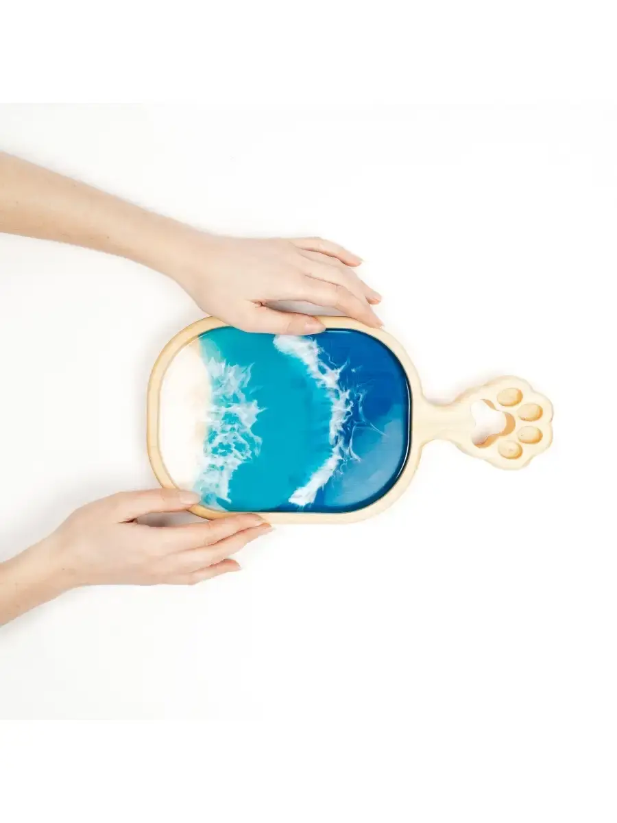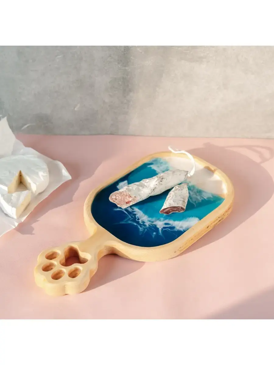 **Деревянная доска из цельного куска древесины кедра с ручкой "лапкой" и эпоксидной смолой.** Деревянные разделочные доски, изготовленные из цельного куска древесины Сибирского кедра. Они обладают массой положительных качеств: ножи не тупятся, долговечные, прочные, устойчивы к повреждениям и перепадам температуры, подходят для разделывания больших кусков мяса, а самое главное кедр обладает антибактериальными свойствами и бактерии, попадая в волокна доски не размножаются, а погибают. Ну и конечно же, частички разделочной доски, попадая в организм человека не причинят вреда.Очень удобна доска с выборкой! На ней можно подавать разные блюда. Сок от мяса не выбежит за грани доски. Размер: длина 33 см., ширина 17 см., высота 2,5 см.