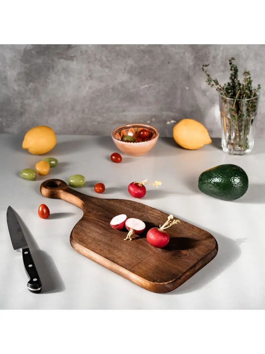 Деревянная разделочная доска из цельного куска дерева Сибирский Кедр! Мы предлагаем вам деревянные разделочные доски, изготовленные из цельного бруска дерева Сибирский кедр. Они обладают массой положительных качеств: ножи не тупятся, долговечные, прочные, устойчивы к повреждениям и перепадам температуры, подходят для разделывания больших кусков мяса, а самое главное, а самое главное, кедр обладает антибактериальными свойствами, и бактерии, попадая в волокна доски, не размножаются, а погибают. Ну и, конечно же, частички разделочной доски, попадая в организм человека не причинят вреда. Деревянные доски имеют различную форму со специальным отверстием для крепления на стену. Перед использованием обязательно промыть теплой проточной водой, чтоб смыть остатки масла и морилки. Изделие может стать чуть светлее. Первое время возможно оставление следов от морилки, поэтому лучше для протирания использовать бумажные полотенца. **Размер:** длина 39,5 см., ширина 16 см., высота 2 см.