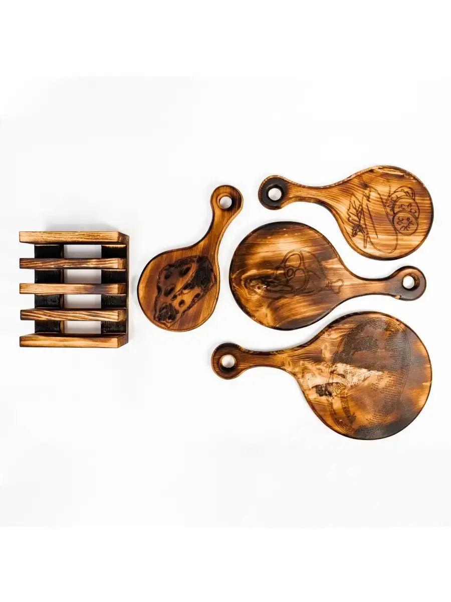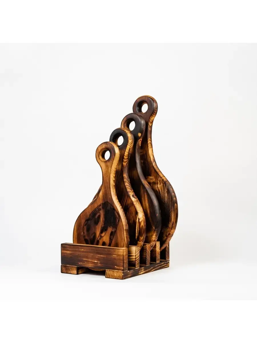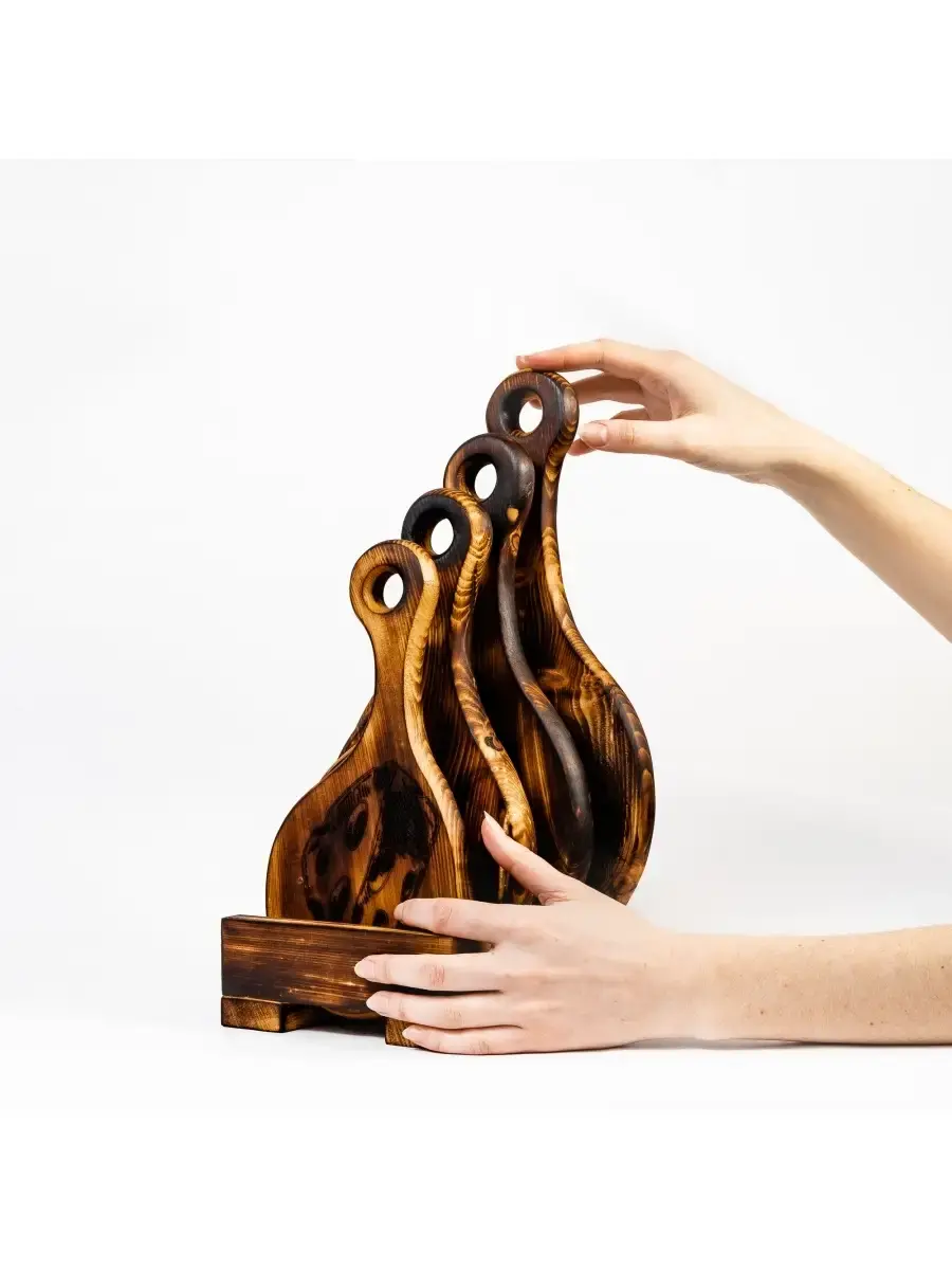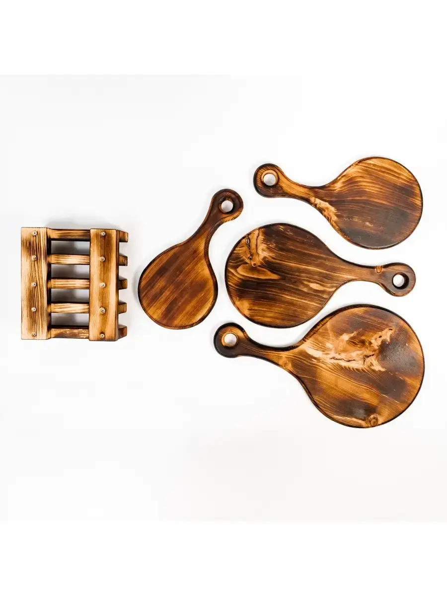 **Разделочные доски 4 шт. на подставке из сибирского кедра!** Разделочная доска - совершенно необходимый предмет на каждой кухне. Но одной разделочной доски далеко не всегда достаточно для того, чтобы процесс готовки был удобным. Предлагаем вам нашу новинку - набор разделочных досок из массива сибирского кедра! Деревянные доски долговечны, они достаточно мягкие, чтобы не тупить нож при использовании и наиболее универсальны. Кроме того, дерево придает интерьеру кухни дополнительный уют, то есть такую разделочную доску можно рассматривать не только в качестве инструмента, но и как аксессуар. Размер досок: 1. 26х13х1,9 см.; 2. 29х15,5х1,9 см.; 3. 32х18х1,9 см.; 4. 36х20,5х1,9 см.