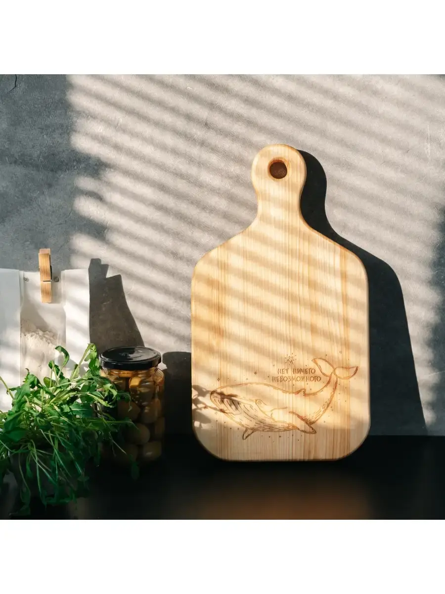 Доска разделочная из древесины сибирского кедра с гравировкой "Нет ничего невозможного". Мы предлагаем вам деревянные разделочные доски, изготовленные из цельного бруска дерева Сибирский кедр. Они обладают массой положительных качеств: ножи не тупятся, долговечные, прочные, устойчивы к повреждениям и перепадам температуры, подходят для разделывания больших кусков мяса, а самое главное, а самое главное, кедр обладает антибактериальными свойствами, и бактерии, попадая в волокна доски, не размножаются, а погибают. Ну и, конечно же, частички разделочной доски, попадая в организм человека не причинят вреда. Размер: длина 44 см., ширина 15 см., высота 2,2 см.