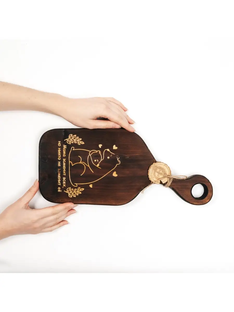 Разделочная деревянная доска из древесины сибирского кедра для мяса с гравировкой "Мама заменит всех, но никто не заменит ее". Мы предлагаем вам деревянные разделочные доски, изготовленные из цельного бруска дерева Сибирский кедр. Они обладают массой положительных качеств: ножи не тупятся, долговечные, прочные, устойчивы к повреждениям и перепадам температуры, подходят для разделывания больших кусков мяса, а самое главное, а самое главное, кедр обладает антибактериальными свойствами, и бактерии, попадая в волокна доски, не размножаются, а погибают. Ну и, конечно же, частички разделочной доски, попадая в организм человека не причинят вреда.