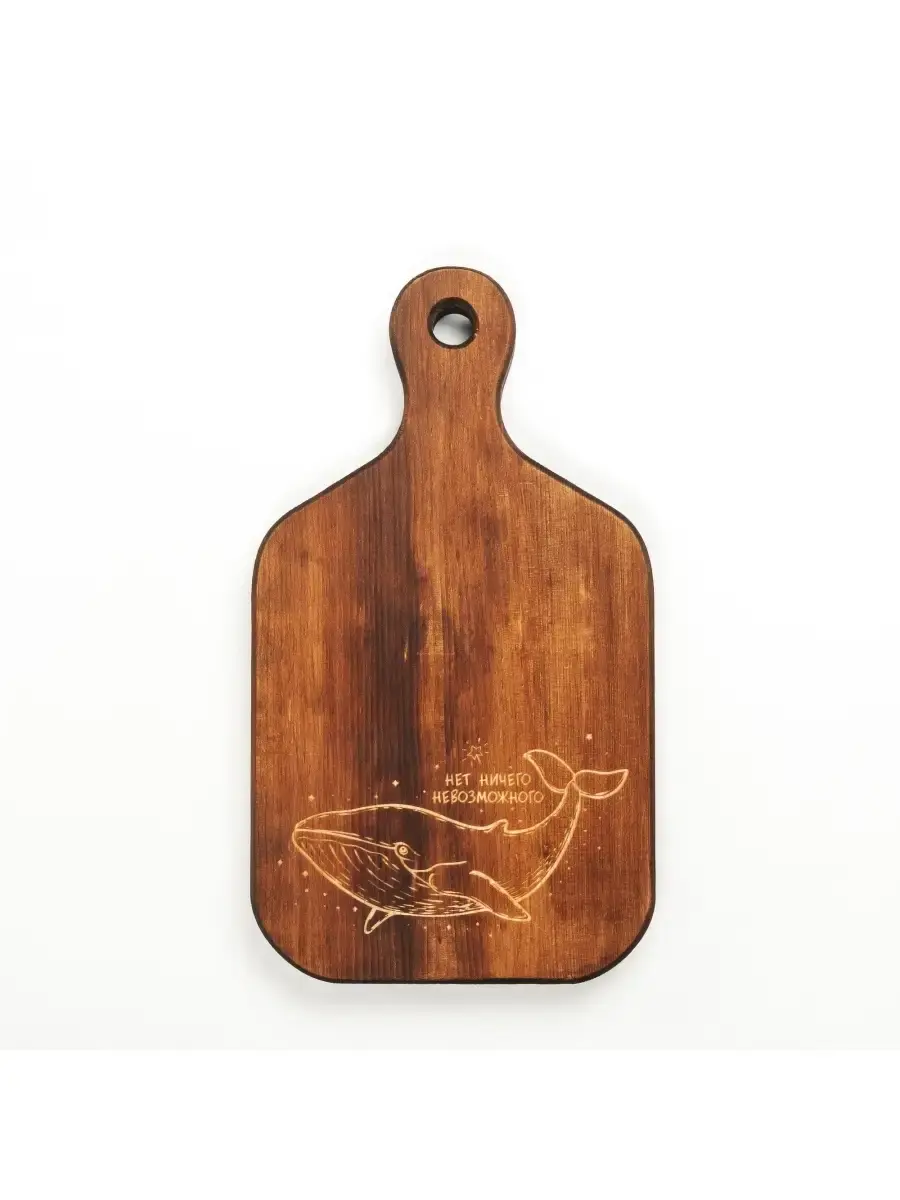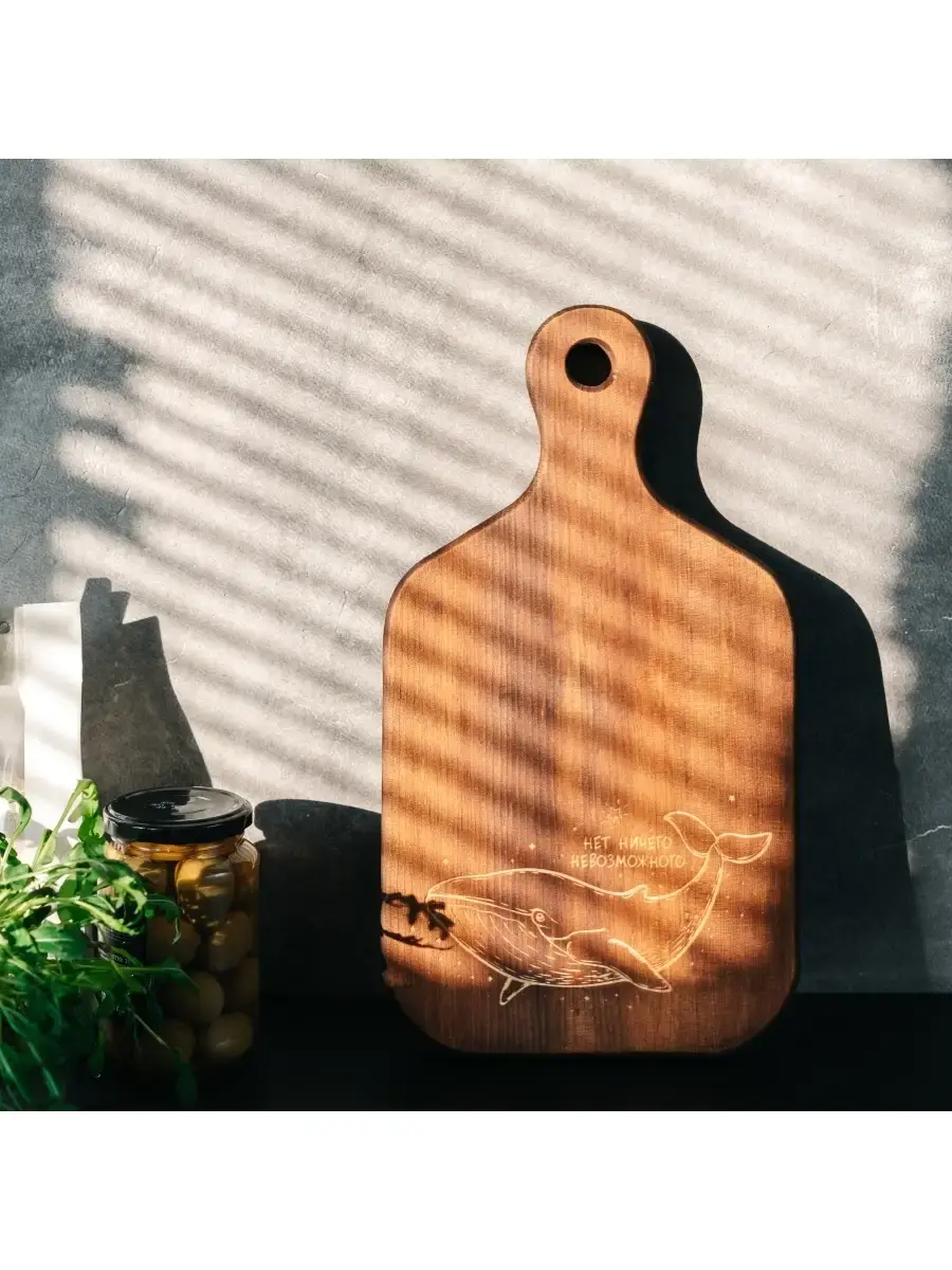 Доска разделочная из древесины сибирского кедра с гравировкой "Нет ничего невозможного". Мы предлагаем вам деревянные разделочные доски, изготовленные из цельного бруска дерева Сибирский кедр. Они обладают массой положительных качеств: ножи не тупятся, долговечные, прочные, устойчивы к повреждениям и перепадам температуры, подходят для разделывания больших кусков мяса, а самое главное, а самое главное, кедр обладает антибактериальными свойствами, и бактерии, попадая в волокна доски, не размножаются, а погибают. Ну и, конечно же, частички разделочной доски, попадая в организм человека не причинят вреда. Размер: длина 44 см., ширина 15 см., высота 2,2 см.
