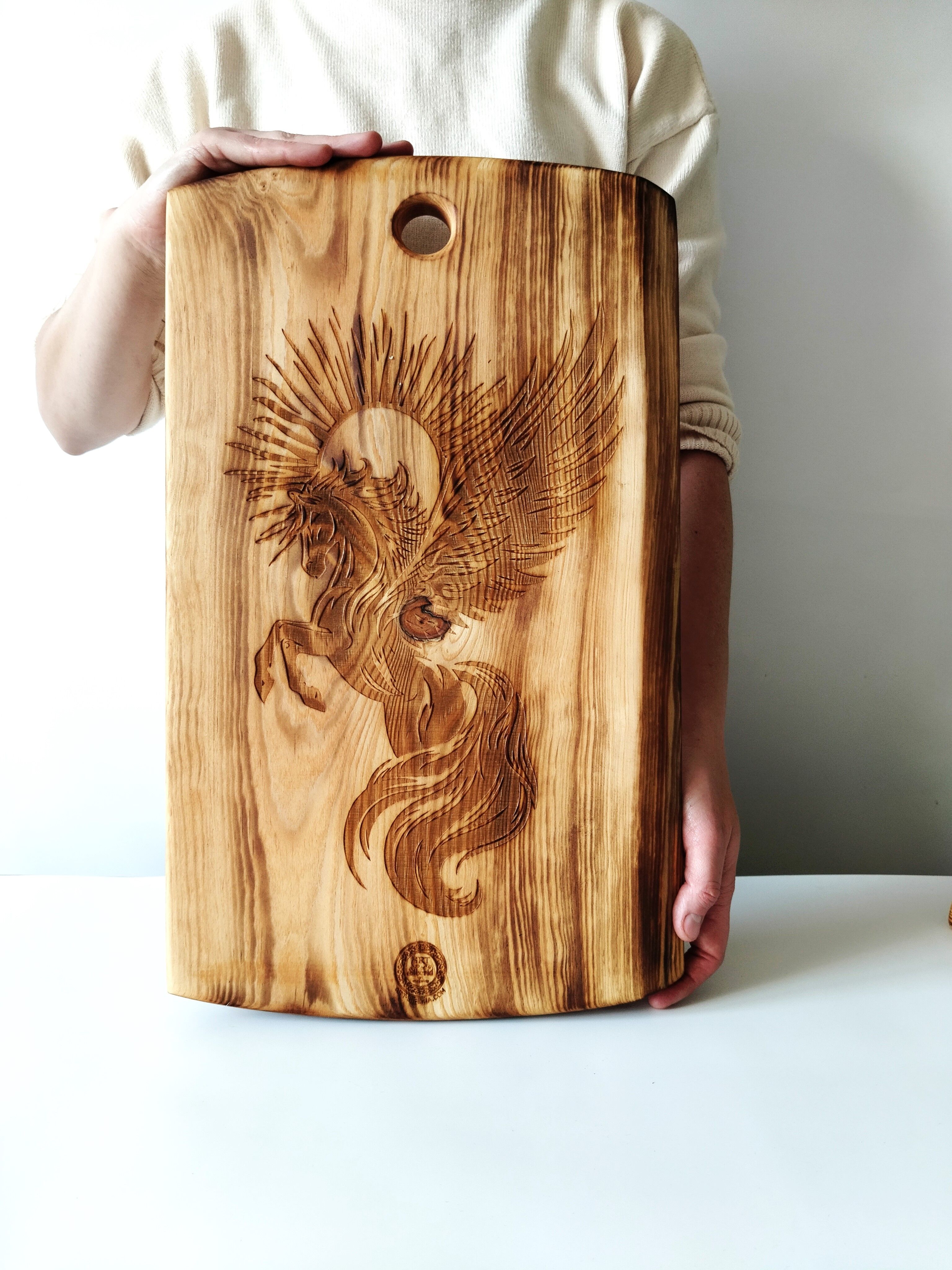 Деревянная разделочная доска из спила древесины сибирского кедра. Есть предметы, без которых не обойтись в домашнем хозяйстве. Разделочная – одна из них. Доска обработана натуральным маслом с пчелиным воском, которое защищает дерево от внешних воздействий. Экологичную разделочную доску можно использовать для: сырого мяса, рыбы, хлеба, овощей и фруктов. Доска обладает массой положительных качеств: ножи не тупятся, доски из кедра долговечные, прочные, устойчивы к повреждениям и перепадам температуры. Подходят для разделывания больших кусков мяса, а самое главное, кедр обладает антибактериальными свойствами, и бактерии, попадая в волокна доски, не размножаются, а погибают. Доска имеет специальное отверстие, которое, пригодится для того, чтобы повесить доску на стену. Доску можно использовать в роли менажницы для подачи и сервировки блюд, она отлично впишется в любой интерьер и будет дополнять его своей уникальностью и стилем. Станет отличным подарком для повара, любителя готовить, близкого человека или просто качественным универсальным подарком. Дорогие покупатели, просим Вас обратить внимание! Каждая деревянная доска из спила имеет уникальную форму, которая может незначительно отличаться от фотографии. Возможно наличие сучков. Не замачивать. Не использовать в посудомоечной машине. После использования тщательно просушивать бумажными полотенцами. Размер: длина, 50 см, ширина, 28-30 см. Гравировка Лошадь.