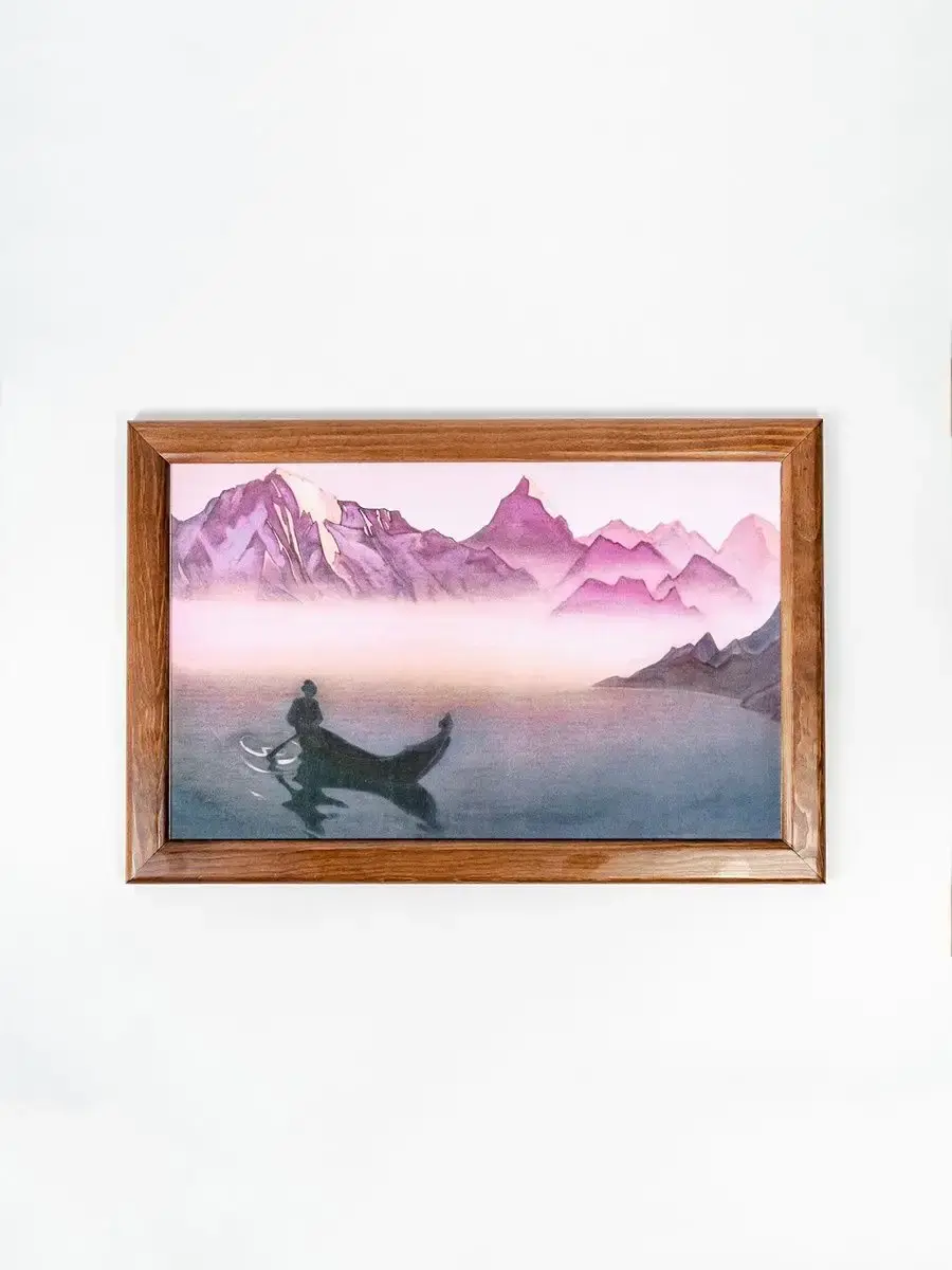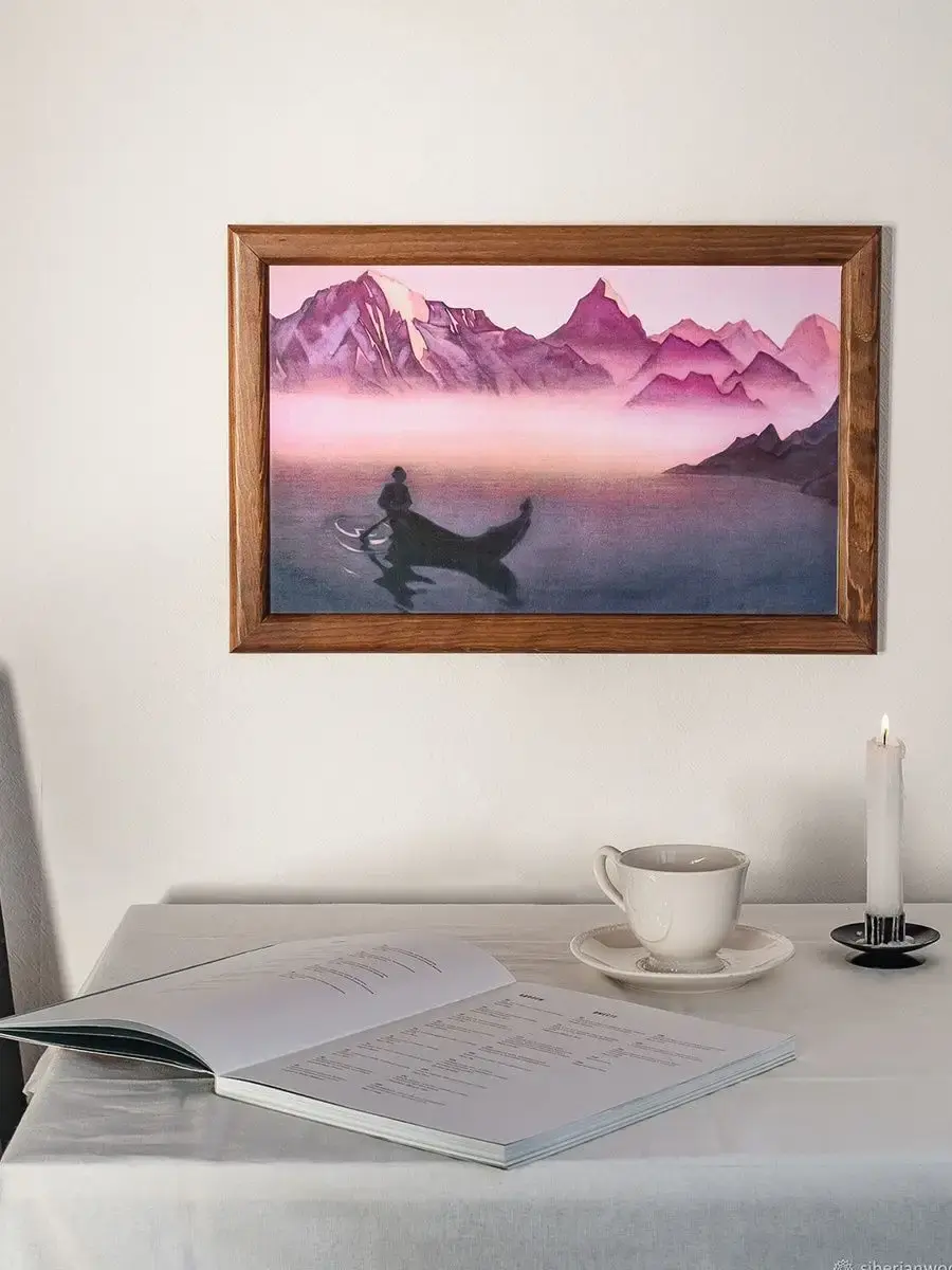 Репродукция картины на холсте в раме «ВЕСТЬ ОТ ГИМАЛАЕВ. 1940» Николая Константиновича Рериха. Репродукция печатается на холсте, при печати используются экологически чистые пигментные чернила, рекомендованные для использования в жилых помещениях. Холст вставляется в рамку, изготовленную из натурального дерева сибирская сосна. «Жалею, не имею снимка с последней картины "Весть от Гималаев". Ладья в предутреннем тумане удалась. Есть тишина и дальние горы светятся.1 Июня 1940 г.»Н.К. Рерих. "Встречи "«Согласно сказаниям и легендам, время от временииз Шамбалы появляются вестники и несут людям известия и предупреждения Учителей и мудрецов."Вестник от Гималаев" была создана накануне Войны между СССР и Германией и служила своеобразным предупреждением...». Альбом "Николай Рерих".