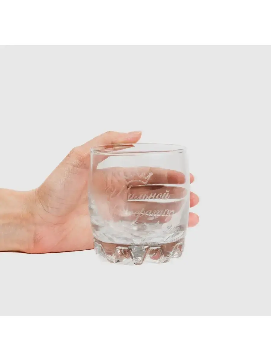 Стеклянный стакан с гравировкой для коньяка. Бокал подходит для коньяка и других крепких напитков. Идеально подходит в подарок на 23 февраля, Новый год и день рождения. Объем стакана 300 мл. Изготовлено из стекла высокого качества, не разобьется при транспортировке до вас. На стакане добавлена надпись нанесённая методом глубокой лазерной гравировки, что не позволяет ей стереться, и будет выглядеть очень эффектно на столе. Можно мыть в посудомоечной машинке.