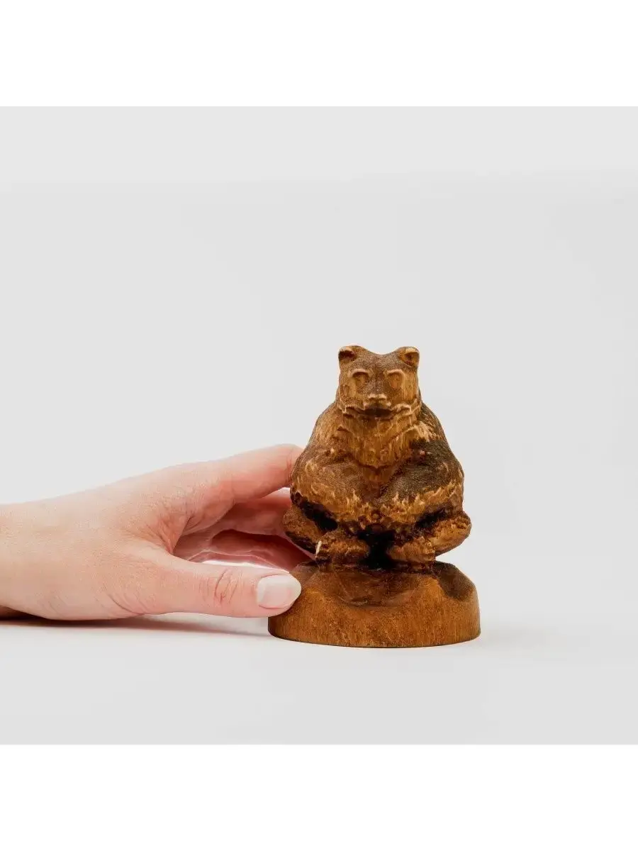 Медведь — это символ силы, мужества и упорства. Это уникальное животное, и его символ чрезвычайно популярен в легендах многих культур по всему миру. Медведь — всеядный зверь, похож на людей, потому что ест коренья, орехи, мед, ягоды, птичьи яйца и травы. Первобытный человек начал отождествлять себя с медведем по нескольким причинам. С ранних времен, когда люди были охотниками и собирателями, они уважали и боялись медведя, а иногда даже поклонялись ему, потому что, хотя он и был хищником, он обладал силой. Резная статуэтка в форме медведя станет отличным подарком для охотника, руководителя и любимого мужчины. Фигурка украсит интерьер комнаты, рабочего стола, подчеркнёт характер и личные качества её владельца. Выполнена из цельного дерева. Высота 11 см, диаметр 8 см