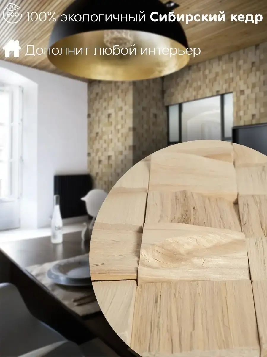 3D панели для стен стиль лофт из натурального Сибирского кедра - отличный способ оригинально выделить любую зону, стену и потолок. Такие панели отлично вписываются в интерьер. Отделка стены или потолка экологичными панелями из кедра дополнит и добавит объема в помещение. Отделочная панель из дерева полностью состоит из кедра. Она обладает бактерицидными, антимикробными свойствами, аромат кедра, который будет доноситься по всей комнате, способен оздоравливать воздух, придавая ему целебные качества. Благодаря тому, что каждый элемент панели уникален, можно создать совершенно разные панно, любого размера и с эффектом разлетающихся деталей, устанавливая, их на некотором расстоянии друг от друга. Мозаика для стен отличный способ замаскировать отверстия или иные недочеты вашего интерьера. Панели можно покрыть бесцветным маслом, либо покрасить в любой цвет или же оставить как есть без покрытия. В упаковке 50 декоративных элементов. Размер одного декоративного элемента 80х80 мм. Монтаж деревянной мозаики производиться на сухое, твердое, ровное основание, без отслаиваний. При монтаже необходимы только жидкие гвозди. Фото взяты из интернета для демонстрации применения.