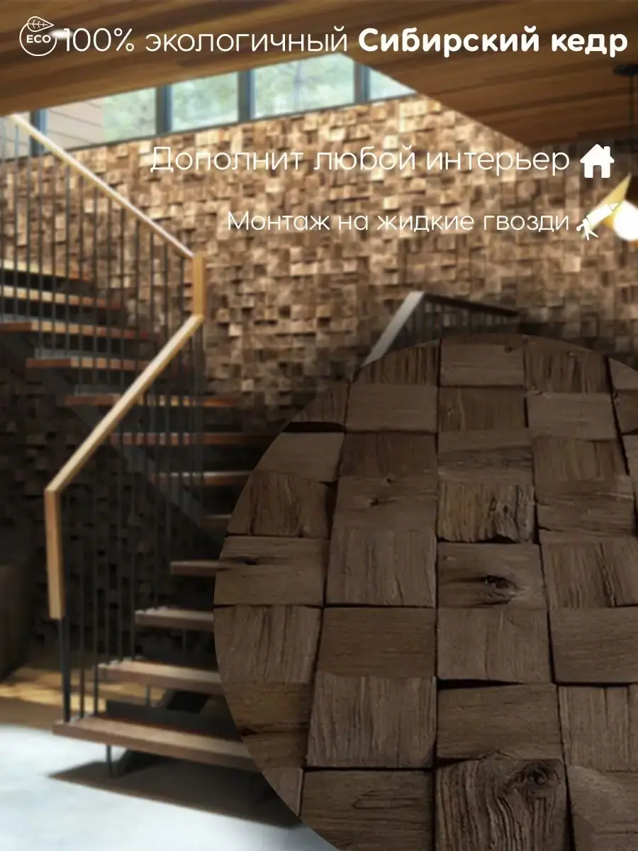 3D панели для стен стиль лофт из натурального Сибирского кедра в цвете "Орех" - отличный способ оригинально выделить любую зону, стену и потолок. Такие панели отлично вписываются в интерьер. Отделка стены или потолка экологичными панелями из кедра дополнит и добавит объема в помещение. Отделочная панель из дерева полностью состоит из кедра. Она обладает бактерицидными, антимикробными свойствами, аромат кедра, который будет доноситься по всей комнате, способен оздоравливать воздух, придавая ему целебные качества. Благодаря тому, что каждый элемент панели уникален, можно создать совершенно разные панно, любого размера и с эффектом разлетающихся деталей, устанавливая, их на некотором расстоянии друг от друга. Мозаика для стен отличный способ замаскировать отверстия или иные недочеты вашего интерьера. Панели можно покрыть бесцветным маслом, либо покрасить в любой цвет или же оставить как есть без покрытия. В упаковке 50 декоративных элементов. Размер одного декоративного элемента 80х80 мм. Монтаж деревянной мозаики производиться на сухое, твердое, ровное основание, без отслаиваний. При монтаже необходимы только жидкие гвозди. Фото взяты из интернета для демонстрации применения.