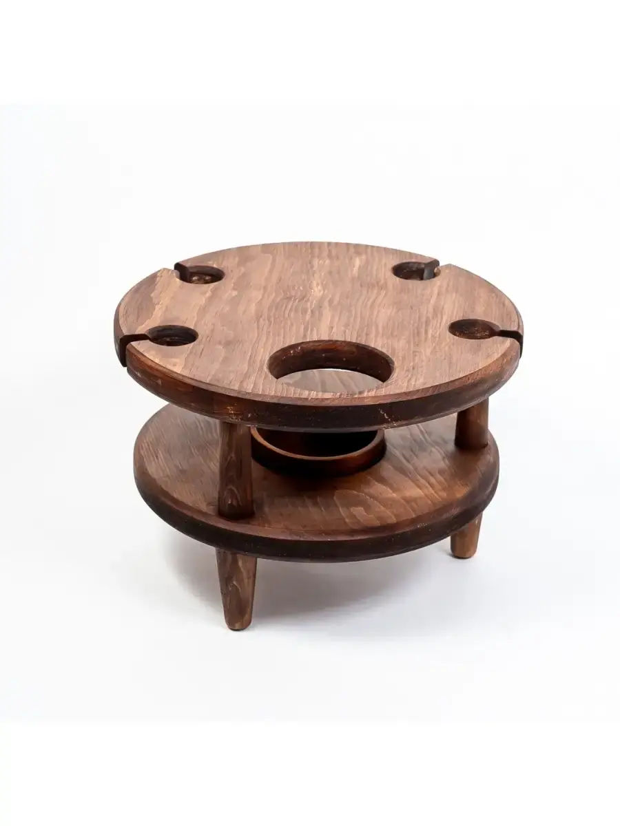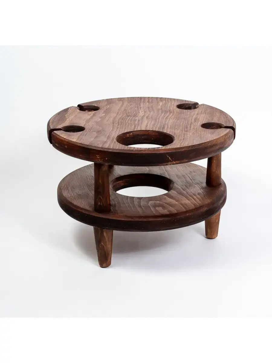 Винный столик из дерева сибирского кедра. Мобильный, легкий и компактный. Уникальная конструкция фиксирует бокалы и бутылку, что позволяет использовать их, даже на неровных поверхностях. Идеален для пикников и дома. Ручная работа из цельного массива. Покрыт составом из растительного масла, пчелиного воска и смолы кедра. Приобретая такой столик, вы можете быть абсолютно уверенны в 100% уникальности и полезности изделия. Также это отличный подарок любимым и друзьям! Размер: диаметр столешницы 30,5 см., высота 21 см. Отверстие под любой размер бутылки. Тарелочка диаметром 105 мм., высота 50 мм.
