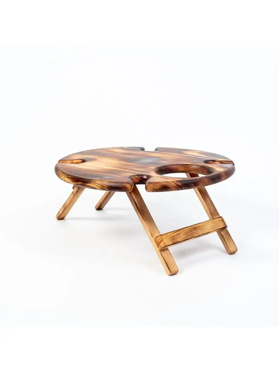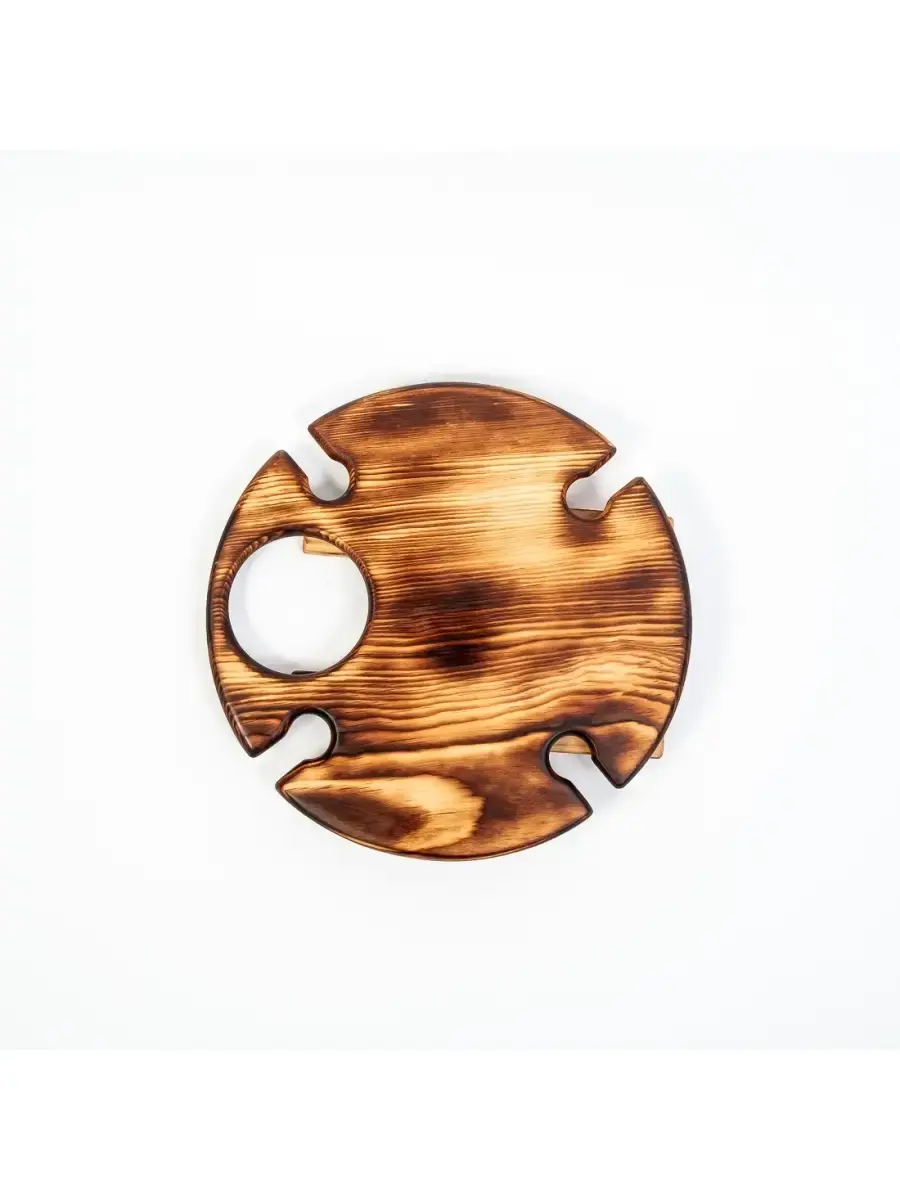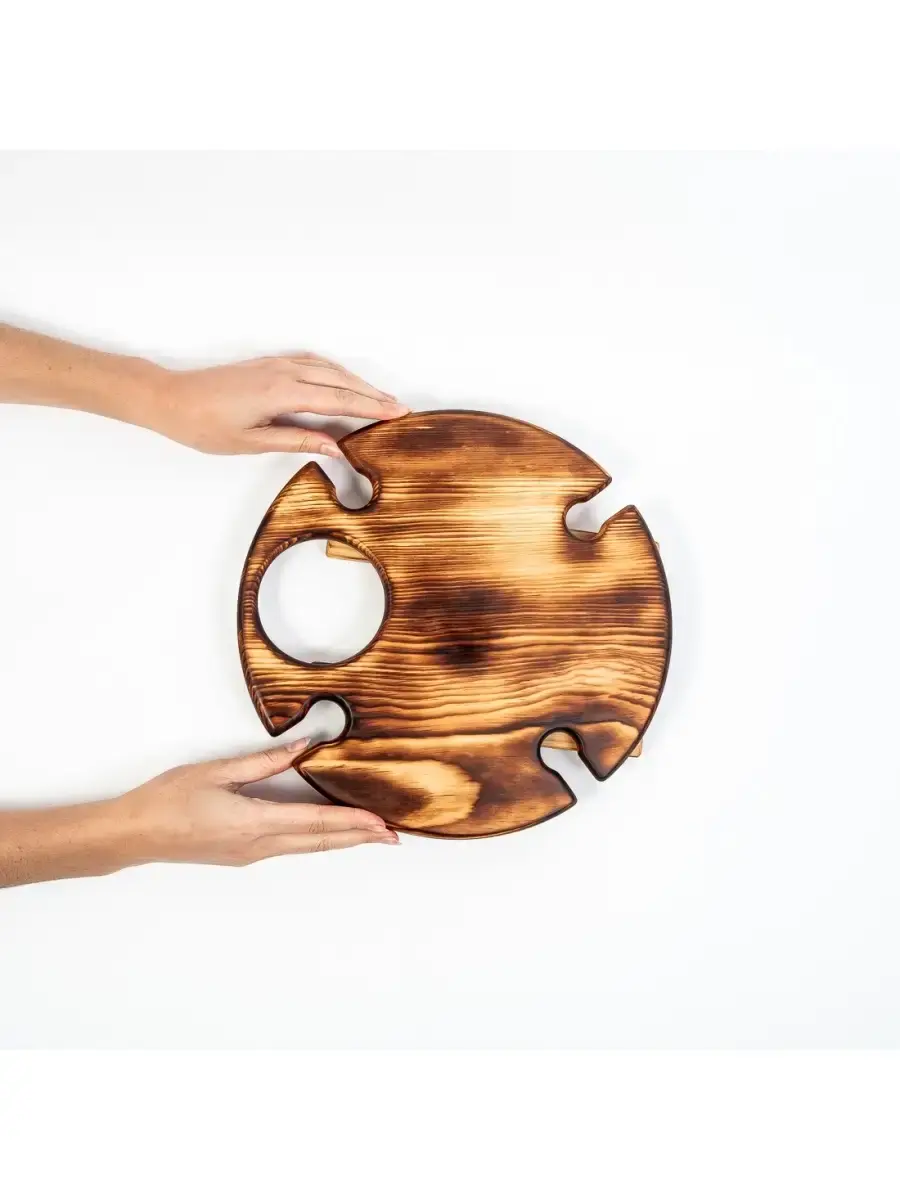 Винный столик из дерева сибирского кедра. Мобильный, легкий и компактный. Складные ножки позволяют помещать его в сумку или рюкзак и брать с собой. Уникальная конструкция фиксирует бокалы и бутылку, что позволяет использовать их, даже на неровных поверхностях. Идеален для пикников и дома. Покрыт составом из растительного масла, пчелиного воска и смолы кедра. Размер: высота в разложенном состоянии 13 см., диаметр 29 см В сложенном состоянии 3,6 см.