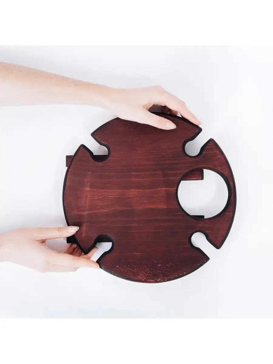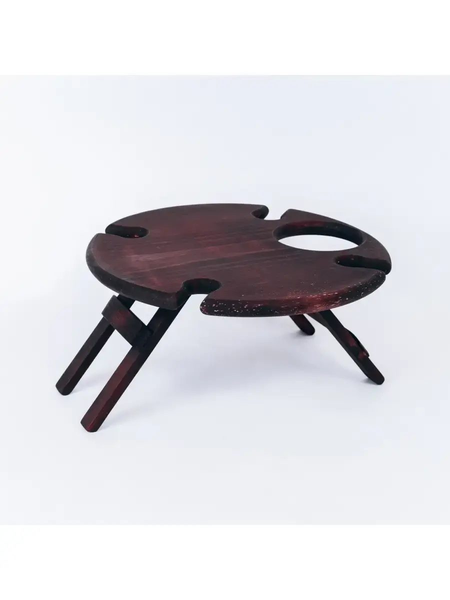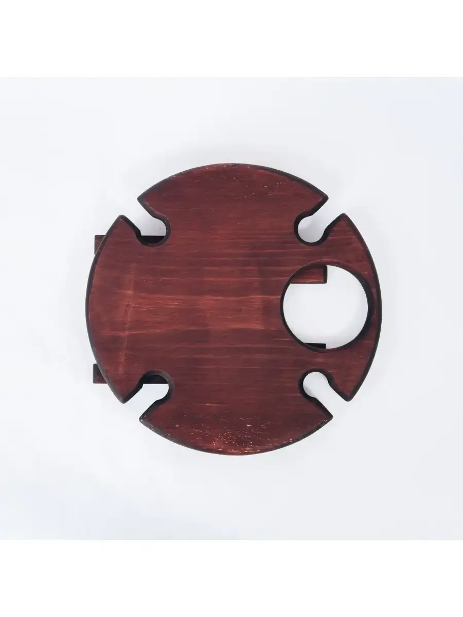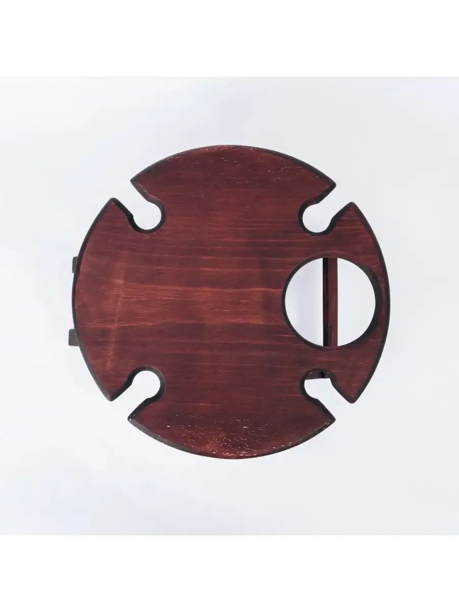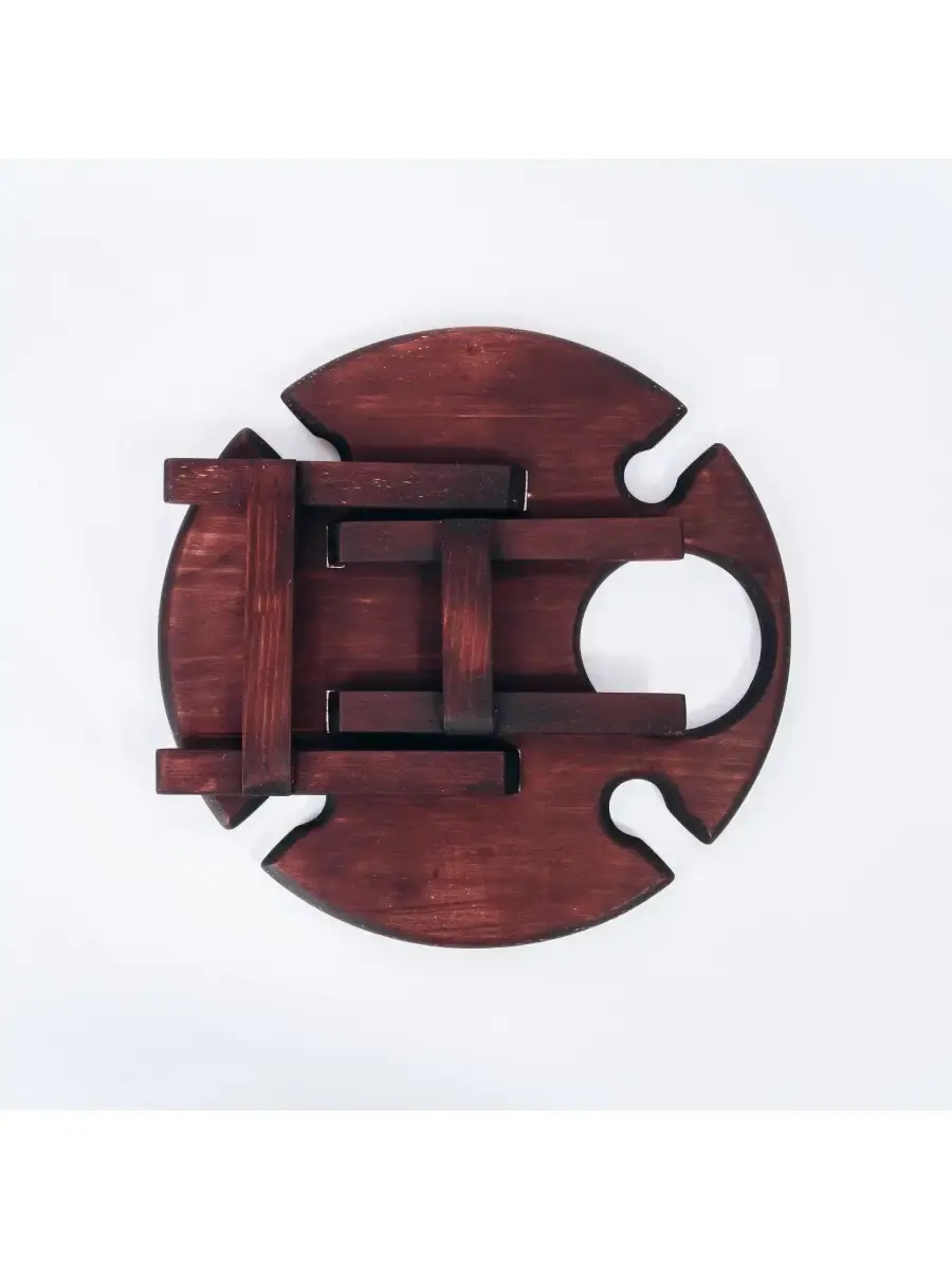 Винный столик "Звездное небо" из дерева сибирского кедра. С помощью кедровой смолы создан эффект звездного неба. Складные ножки позволяют помещать его в сумку или рюкзак и брать с собой. Уникальная конструкция фиксирует бокалы и бутылку, что позволяет использовать их, даже на неровных поверхностях. Размер: высота в разложенном состоянии 13 см. Диаметр 29 см В сложенном состоянии 3,6 см.